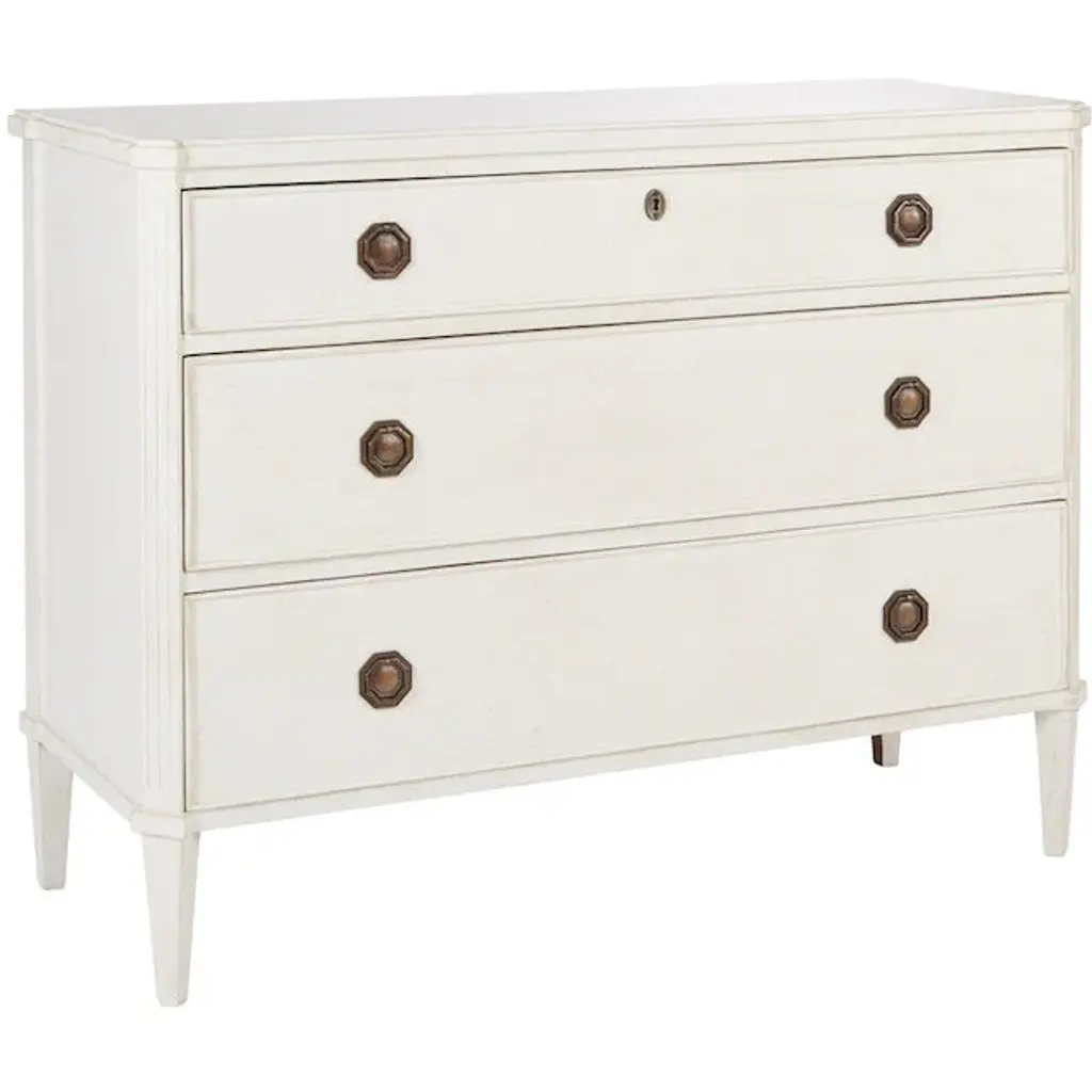 White stained wood + tarnished hardware come together to create this beautiful yet simple chest. Featuring three drawers and offering ample storage space. Available in multiple finishes.