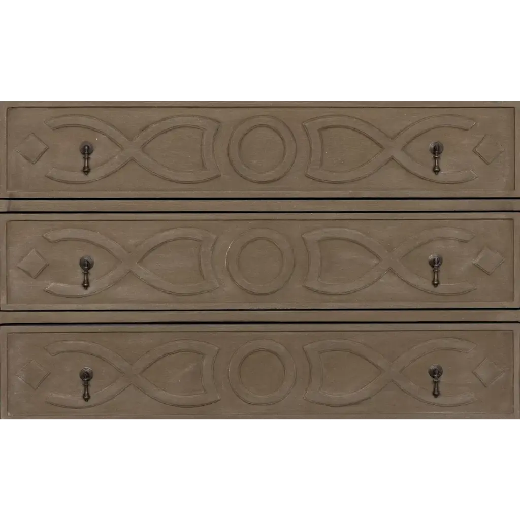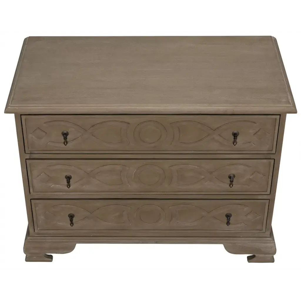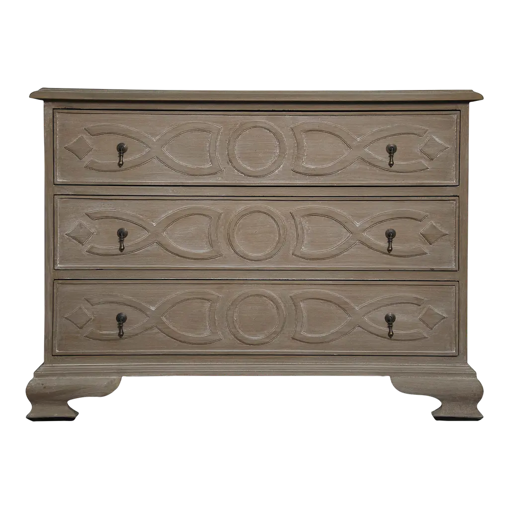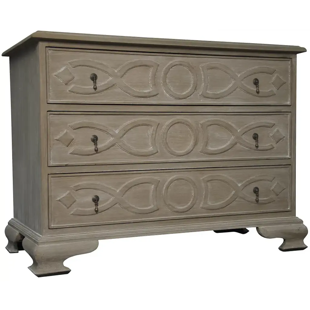 It's the decorative details that make this dresser stand out from the crowd. With intricately hand-carved legs, beautifully embellished drawers, and a softly weathered finish, it makes a lovely addition to any upscale chamber.