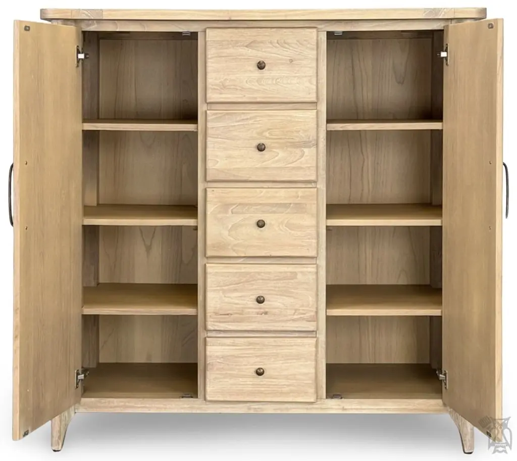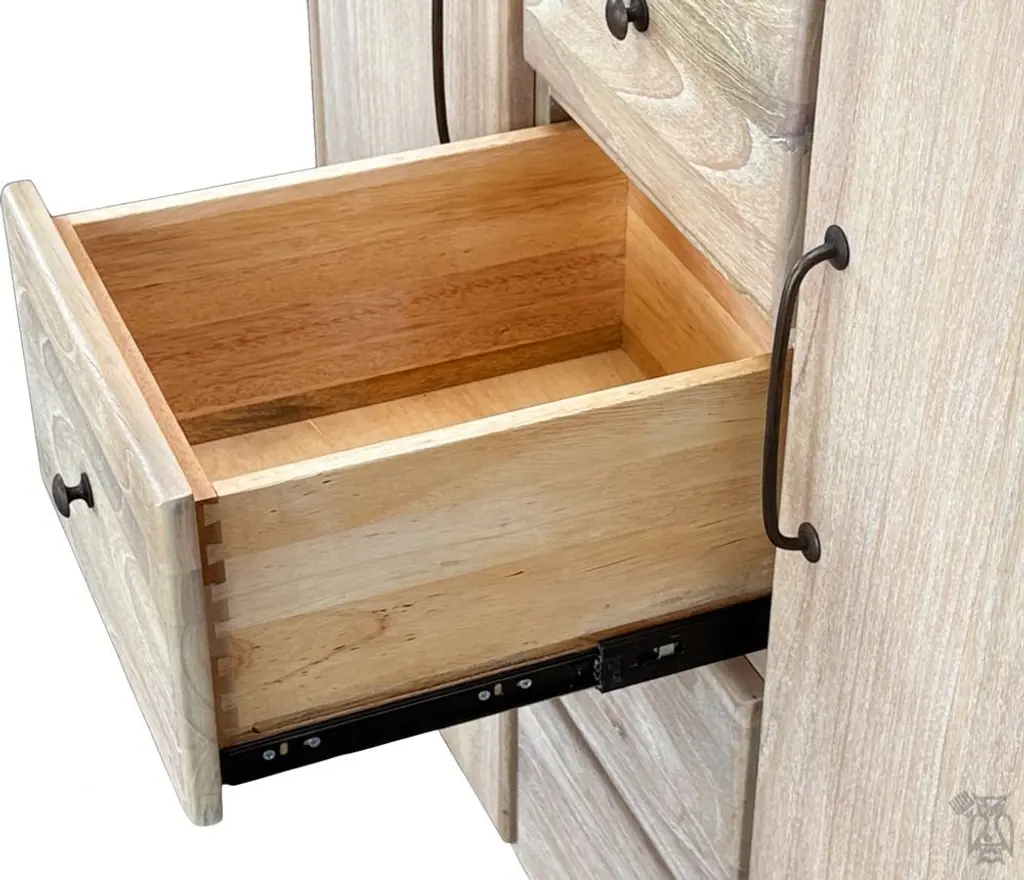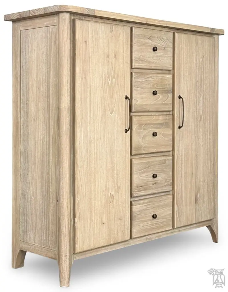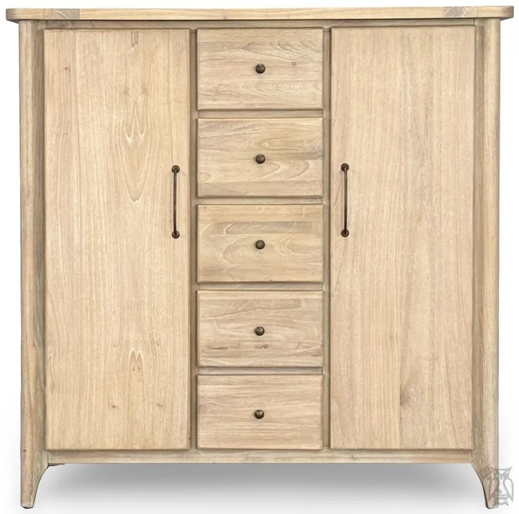 Solid Mindi Wood Aria Chest of Drawers With Door in Washed Finish. This American-shaker collection hints at contemporary and rustic blended together. The chest of drawers features curved drawer fronts, a shaped top and large, spacious drawers. The Drawer boxes are constructed of Solid Mindi Wood, and feature English dovetail drawer boxes. The full-extension ball-bearing drawer glides make these drawers open and close like a breeze. The beautiful Washed finish not only adds durability to this Solid Mindi Wood collection but also adds richness and warmth to the room. All of these pieces are finished with a 17-step process which includes hand-applied oil to maximize grain quality and uniqueness in each piece. Aged bronze pull hardware completes this collection. The Aria collection features: Certified Lumber-Harvested from forests at managed tree plantations All Wood Furniture-Creates a healthy environment by reducing the amount of chemicals used during manufacturing Mortise & Tenon construction throughout English dovetailed drawers Case goods are dust proofed Drawers operate on full-extension heavy glides Adjustable foot levelers on all pieces Dressers & Chests have oversized drawers Case pieces feature Corner Blocked Construction throughout Drawer interiors have three coats of clear finish and are hand sanded in between each coat for smoothness Solid Mahogany finished bed slats All wood is double-sealed before assembly to ensure correct and consistent moisture content. Pieces are finished with a seventeen-step hand-sanded, hand-rubbed, and hand-stained process producing a deep rich grain quality finish. No particle board. Fully assembled. Manufacturer: Napa Furniture Design.