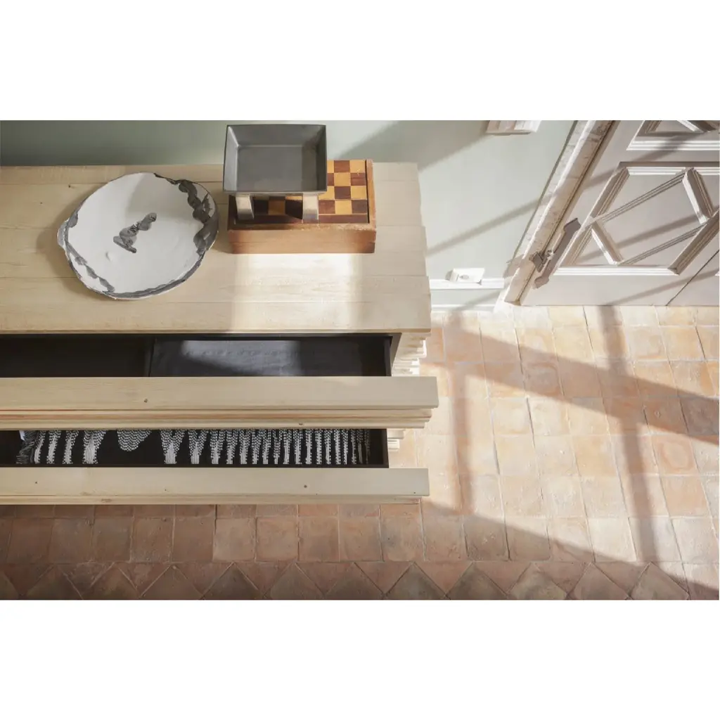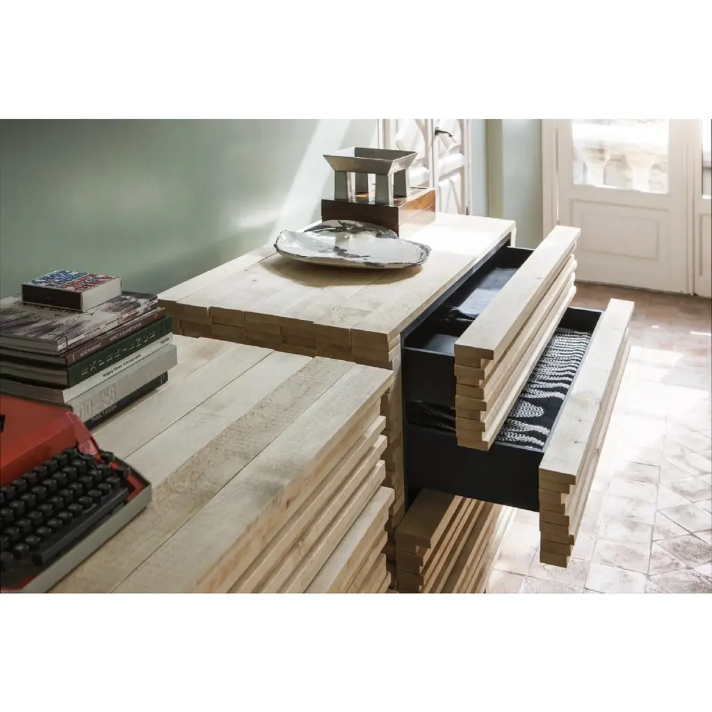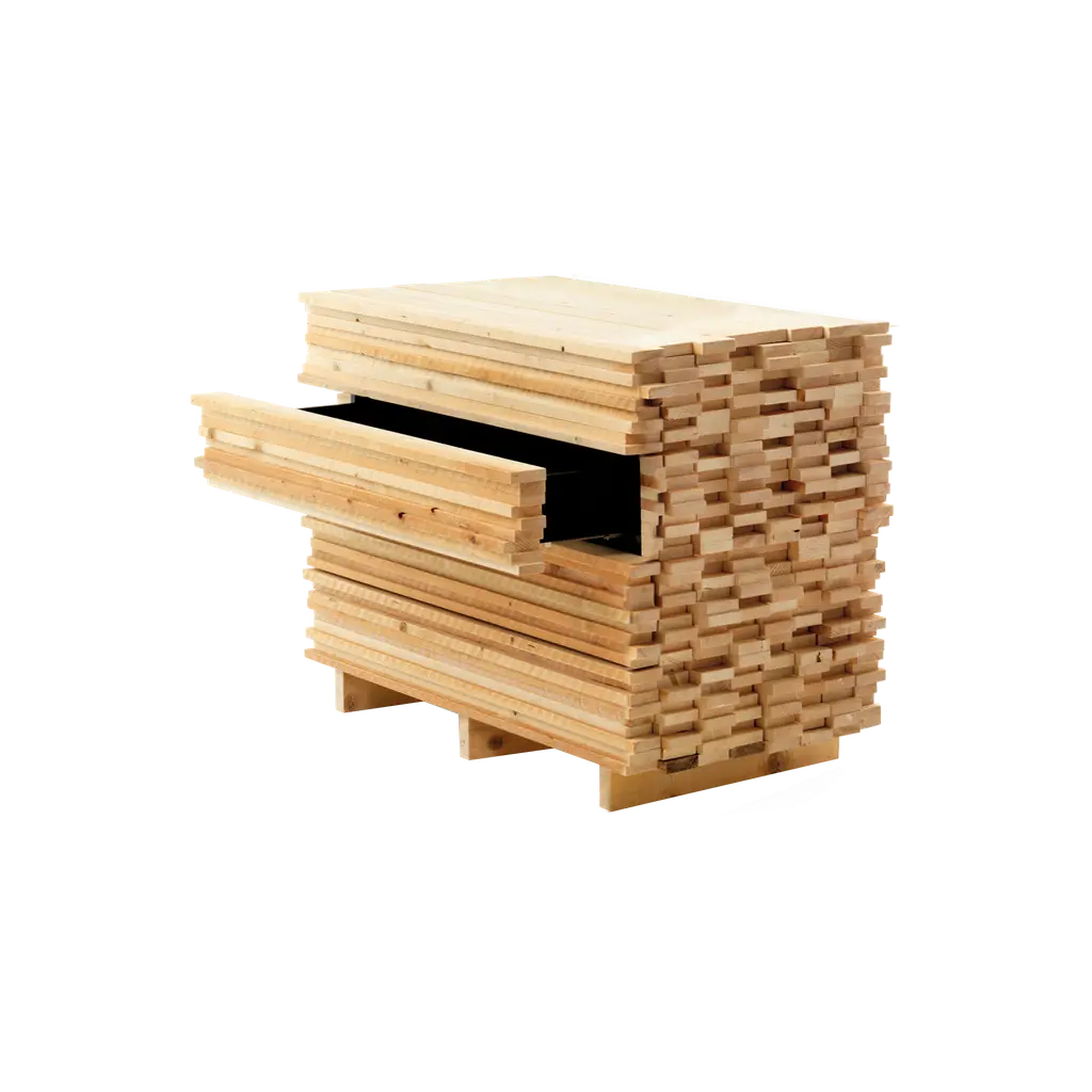 Indulge in luxury with Mogg Ordinaryday, a solid wood chest of drawers with a striking black structure. Crafted to resemble a stack of wood in a carpentry shop, it exudes a strong and unique character. With 4 drawers, natural finish, and black accents, this piece becomes the focal point of any space.