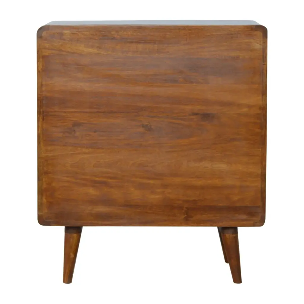 Designed with modern living in mind, this chest features sleek Nordic-style legs and a gracefully curved shape for a contemporary look. The shiny accent knobs on each drawer make accessing and storing items like clothes, towels, and duvets effortless. Its curved corners not only ensure safety but also add a refined, stylish touch. Perfect for city homes and apartments, this chest combines both practicality and elegance.