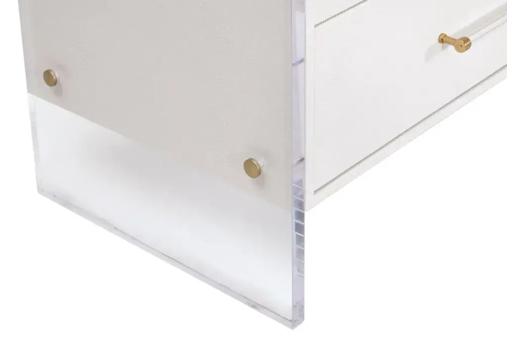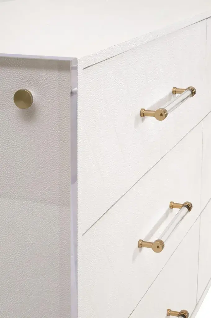 Sonia Shagreen 6-Drawer Double Dresser Upgrade your living space with the Sonia Shagreen 6-Drawer Double Dresser by Essentials for Living. Crafted with a handful of uniquely paired materials, this dresser features a pearl white shagreen resin, rubberwood, beech wood, and clear acrylic. The faux shagreen is made to mimic real stingray skin, which has natural characteristics in color and texture. The drawer fronts feature a subtle geometric diamond pattern and clear acrylic handles. With six spacious storage drawers equipped with dual metal ball bearing glides and a hold-in detent to prevent roll-out, this dresser combines functionality and style effortlessly. The clear acrylic panel legs provide a modern twist, creating a harmonious blend of classic and contemporary. Measuring 62.25" wide, 19.5" deep, and 34" high, this double dresser offers ample storage space and is an embodiment of blended styles. Sonia Shagreen 6-Drawer Double Dresser Features: Dimensions: W 62.25 x D 19.5 x H 34 Weight (lbs): 230 Colors: Pearl Shagreen, Brushed Brass Materials: Faux Shagreen Resin, Solid Rubberwood, Solid Beech, MDF, Acrylic, Metal Faux Shagreen Resin Drawer Panels & Surround Geometric Patterned Drawer Fronts 6 Storage Drawers Dual Metal Ball Bearing Drawer Glides