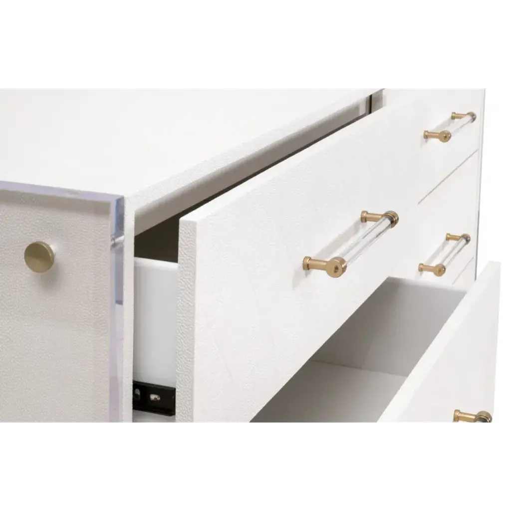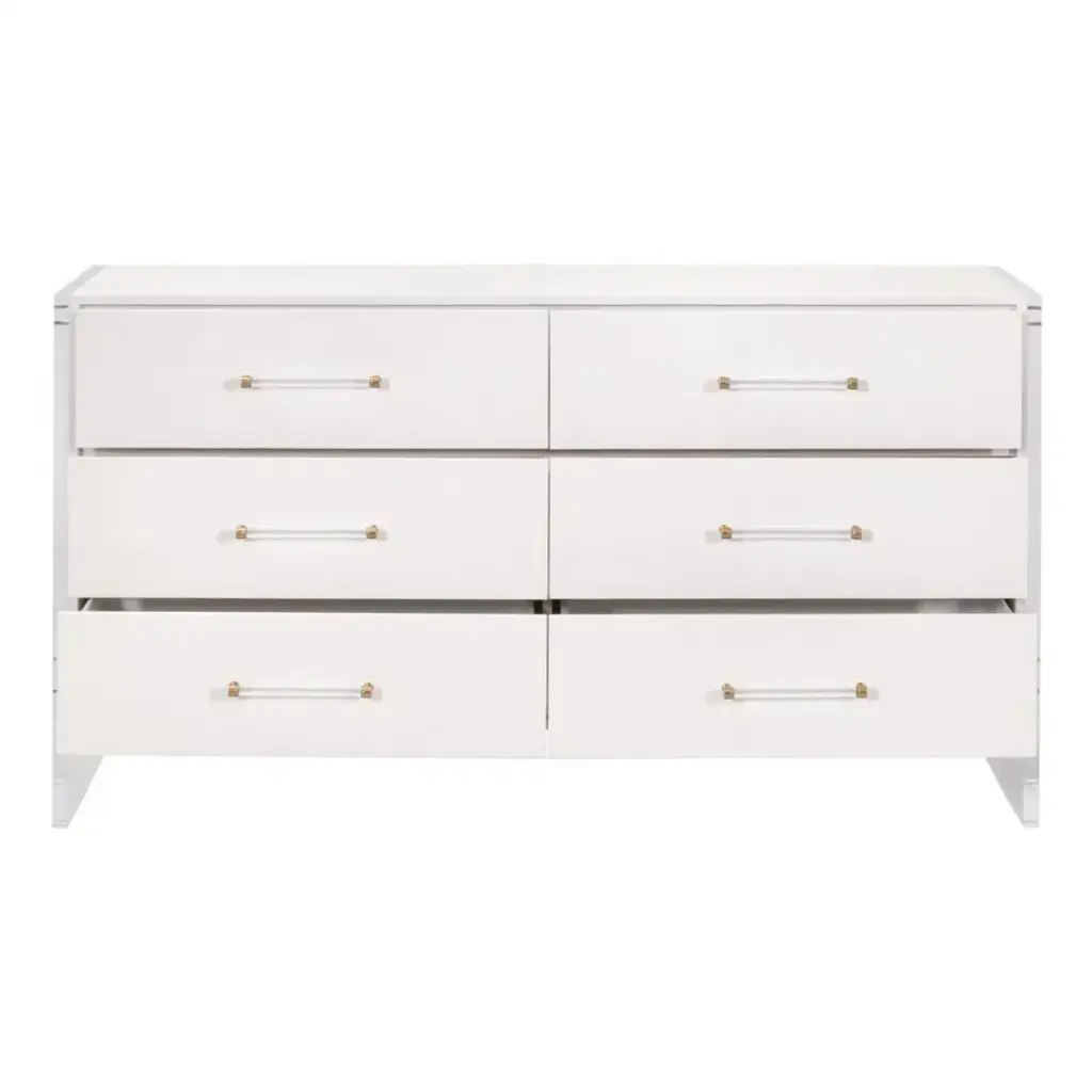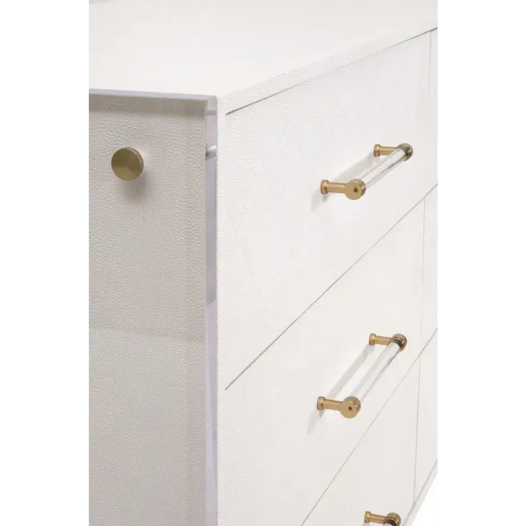 Upgrade your living space with the Sonia Shagreen 6-Drawer Double Dresser by Essentials for Living. Crafted with a handful of uniquely paired materials, this dresser features a pearl white shagreen resin, rubberwood, beech wood, and clear acrylic. The faux shagreen is made to mimic real stingray skin, which has natural characteristics in color and texture. The drawer fronts feature a subtle geometric diamond pattern and clear acrylic handles. With six spacious storage drawers equipped with dual metal ball bearing glides and a hold-in detent to prevent roll-out, this dresser combines functionality and style effortlessly. The clear acrylic panel legs provide a modern twist, creating a harmonious blend of classic and contemporary. Measuring 62.25†wide, 19.5†deep, and 34†high, this double dresser offers ample storage space and is an embodiment of blended styles.