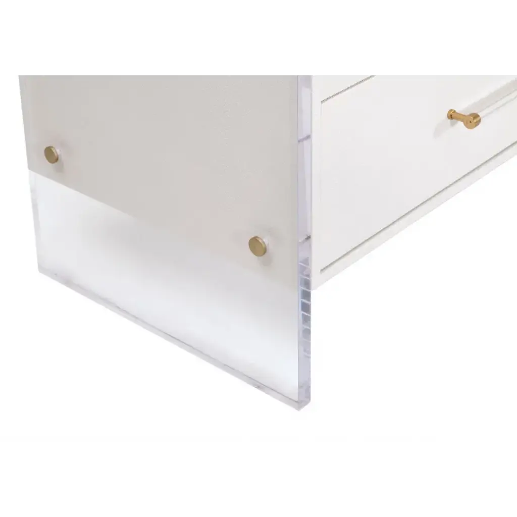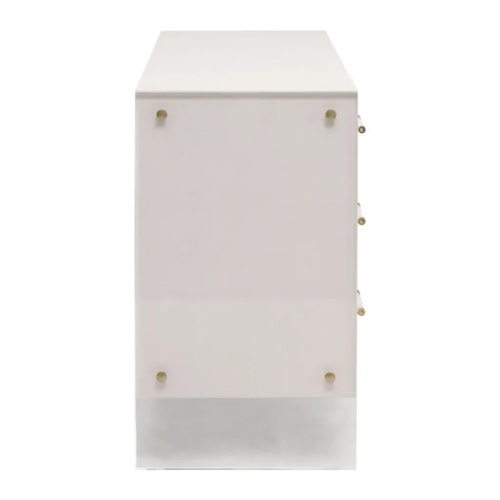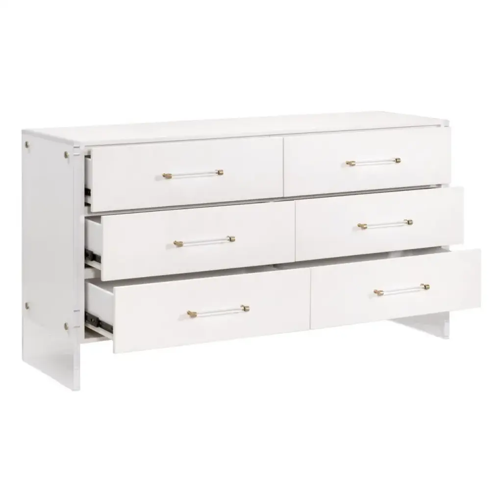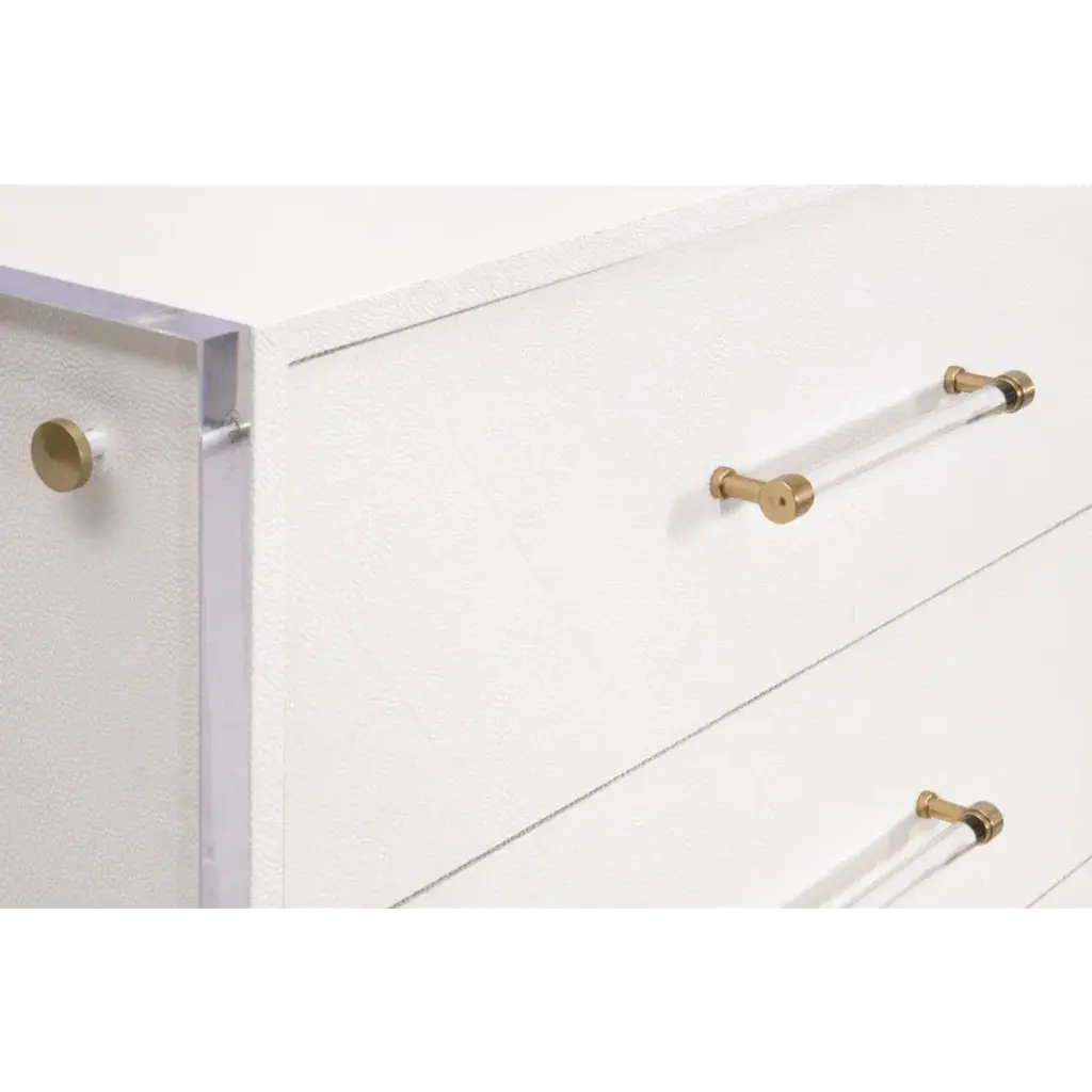 Upgrade your living space with the Sonia Shagreen 6-Drawer Double Dresser by Essentials for Living. Crafted with a handful of uniquely paired materials, this dresser features a pearl white shagreen resin, rubberwood, beech wood, and clear acrylic. The faux shagreen is made to mimic real stingray skin, which has natural characteristics in color and texture. The drawer fronts feature a subtle geometric diamond pattern and clear acrylic handles. With six spacious storage drawers equipped with dual metal ball bearing glides and a hold-in detent to prevent roll-out, this dresser combines functionality and style effortlessly. The clear acrylic panel legs provide a modern twist, creating a harmonious blend of classic and contemporary. Measuring 62.25†wide, 19.5†deep, and 34†high, this double dresser offers ample storage space and is an embodiment of blended styles.
