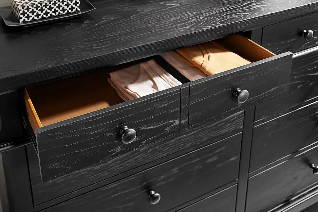 Settle gently into the timeless sanctuary of the Springville collection, embraced by the powerful calm waiting behind life's rush and noise. This handsomely detailed 8-drawer dresser showcases a soothing black finish and traditional style notes like tapered square legs and subtle chamfer details with decorative metal knobs in black.