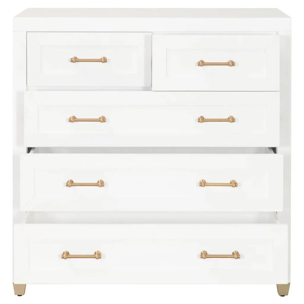 Stacy Modern Classic Matte White Wood Brass Steel 5 Drawer Dresser