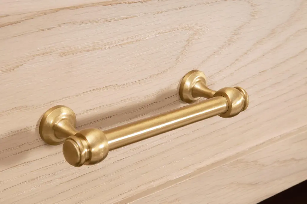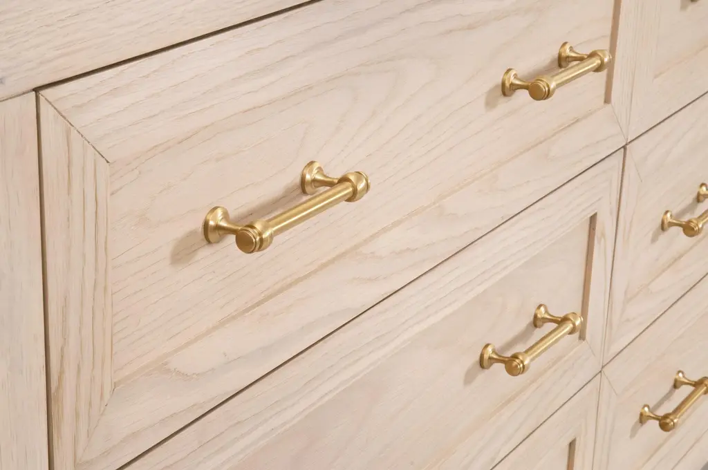 The Stella 6-Drawer Double Dresser from Essentials For Living captures the essence of transitional style, offering elegance and plenty of storage space. Its light honey finish is tastefully accented with brushed brass handles and feet, creating an eye-catching contrast with its classy and light colors. The dresser, which measures 66" wide, 20" deep, and 36" high, is crafted from oak wood, ensuring both durability and timeless charm. This functional dresser is equipped with six drawers, all featuring full extension metal glides for easy and smooth access. An innovative hold-in detent feature ensures safety by preventing unintended drawer rollouts, enhancing the user-friendly appeal of this sophisticated storage solution.