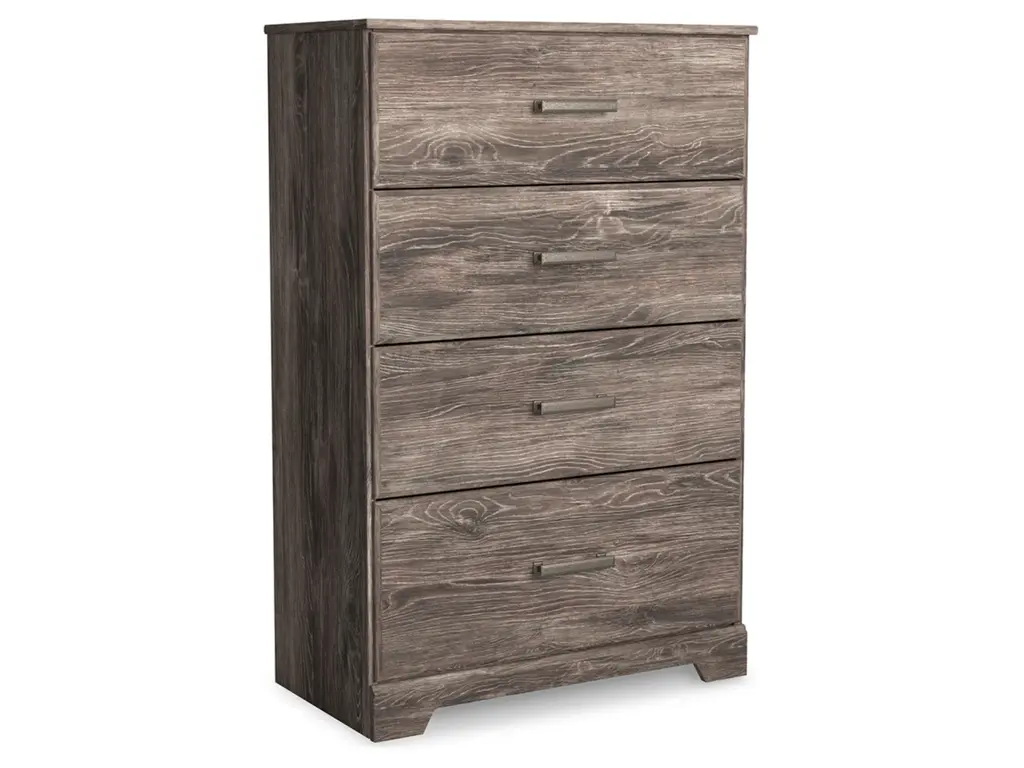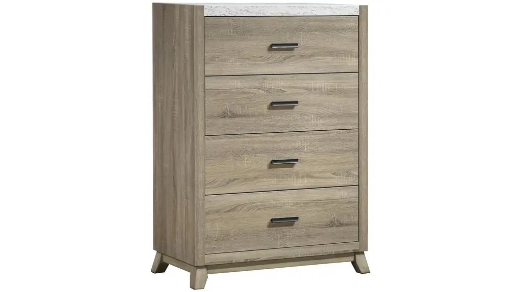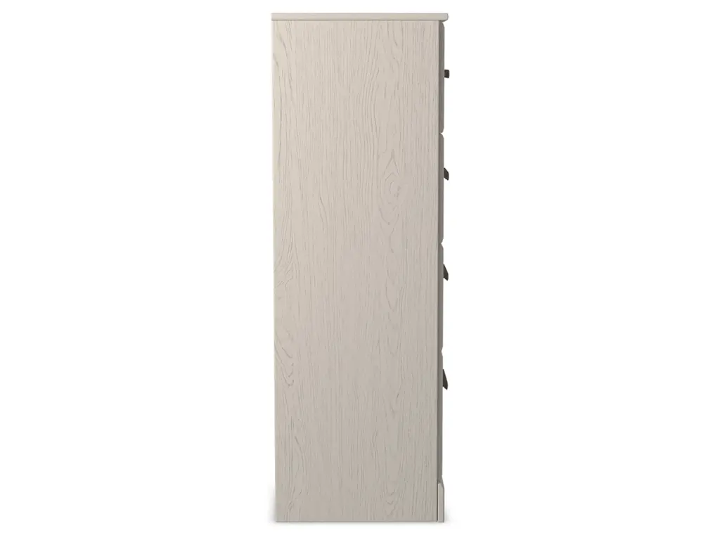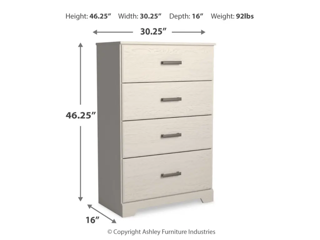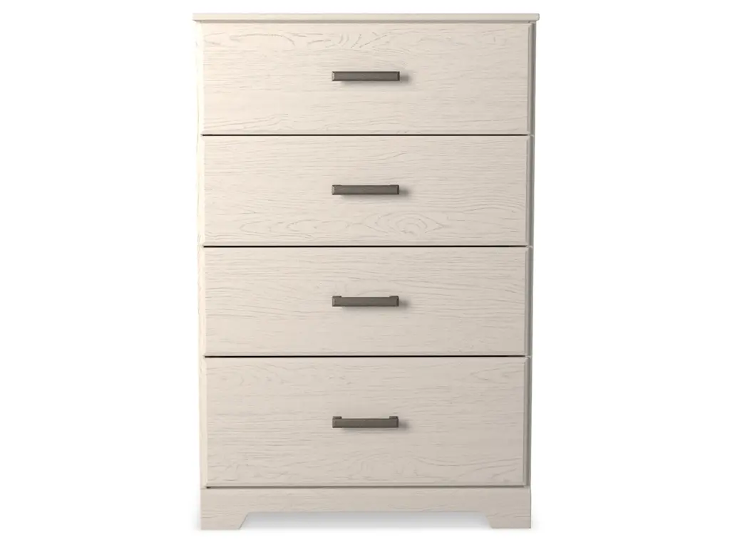With its clean-lined look and modern attitude, the Stelsie chest of drawers is a fresh style awakening. A crisp, white hue over subtle replicated wood grain easily complements other furniture finishes. Smooth drawer fronts with antiqued pewter-tone handles complete the aesthetic.
