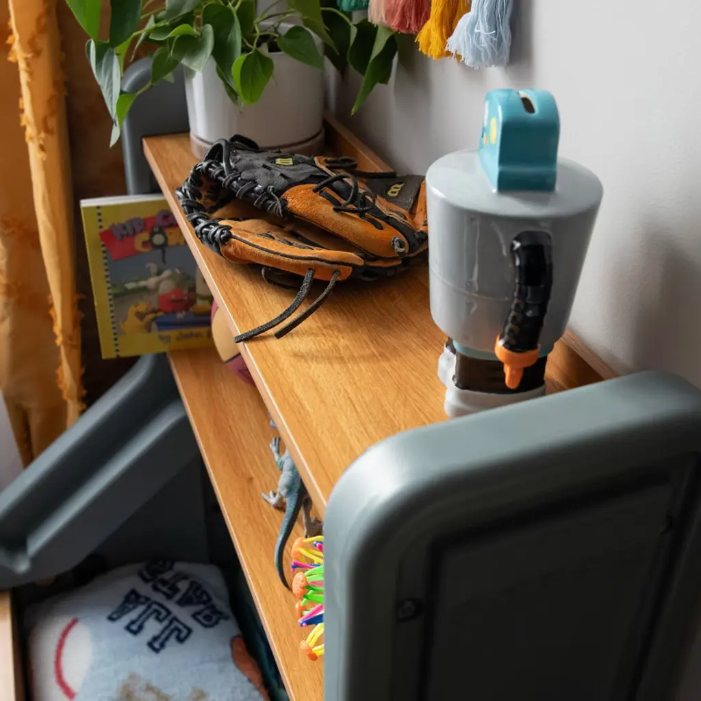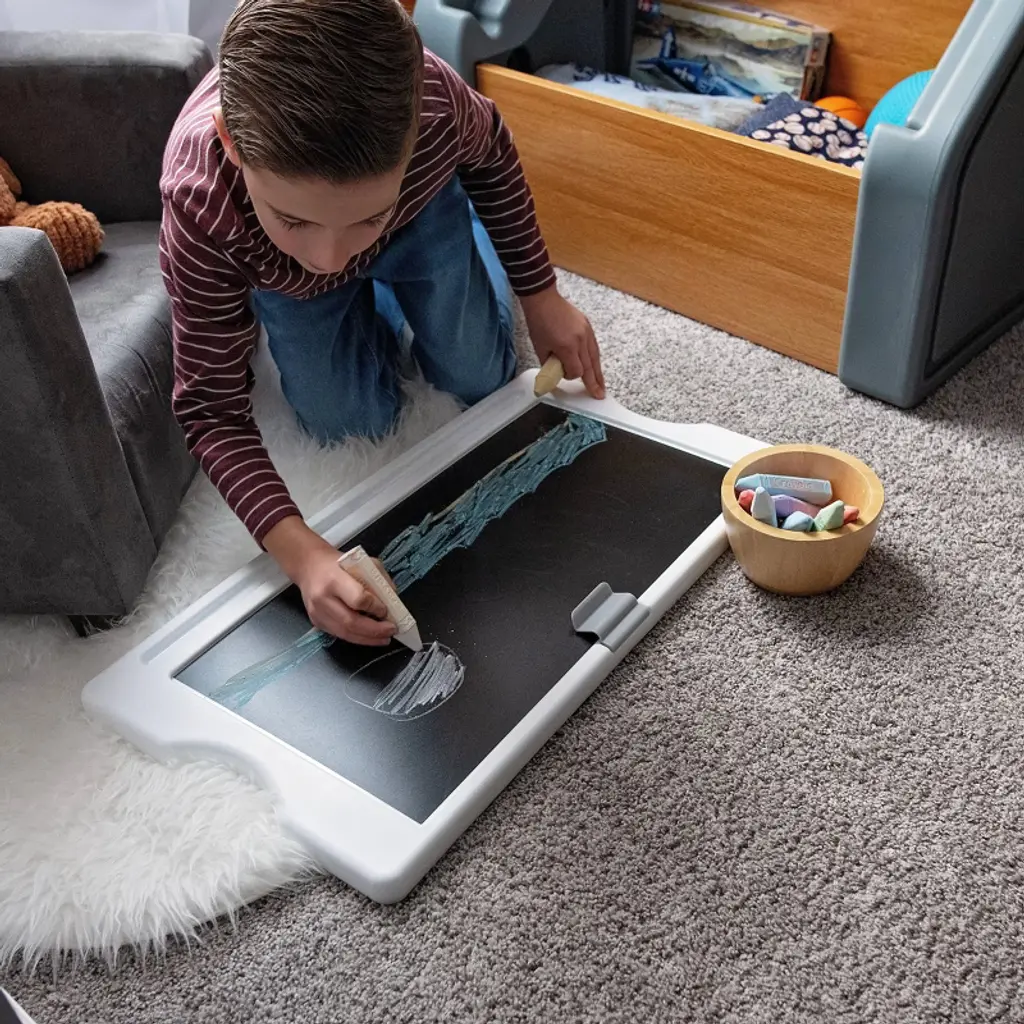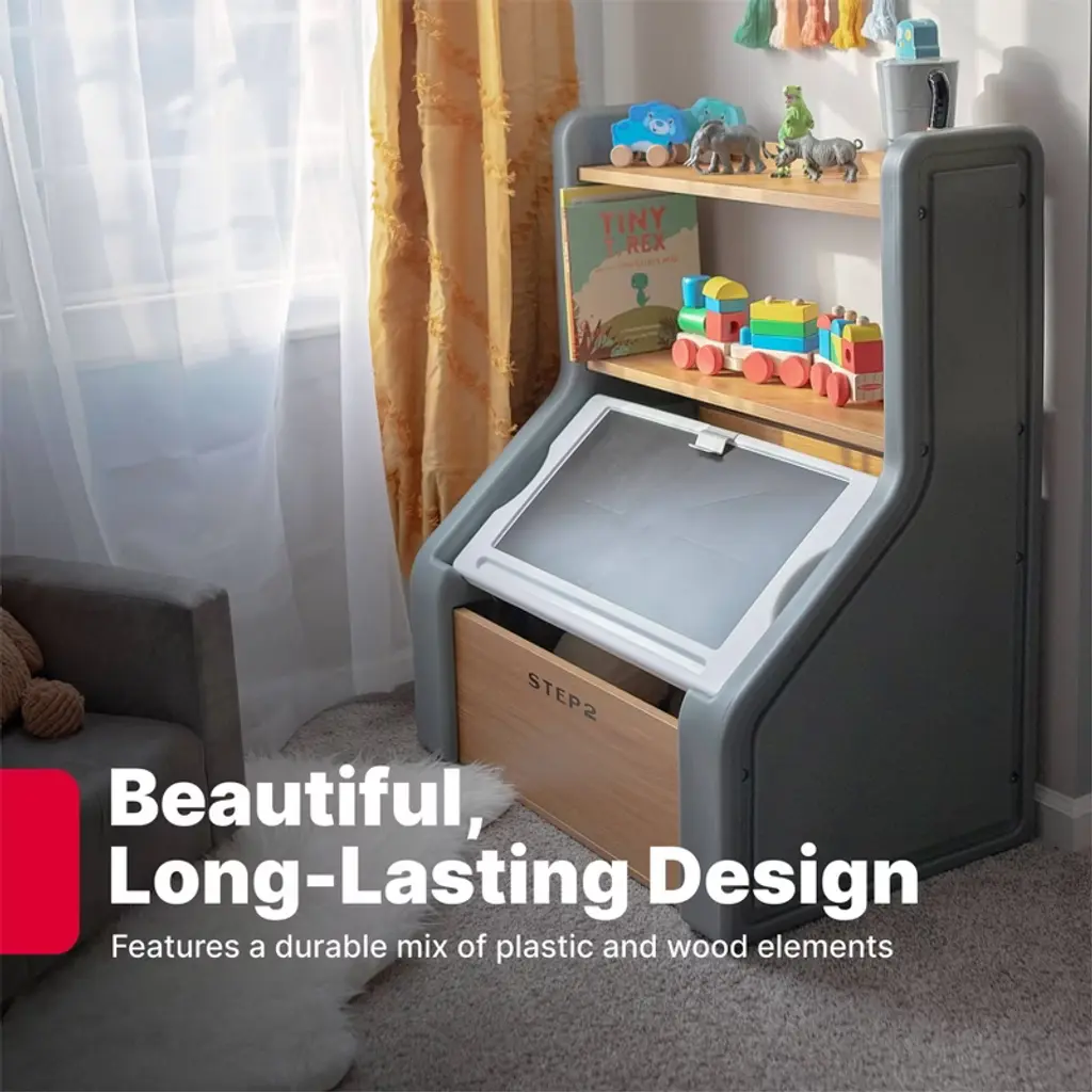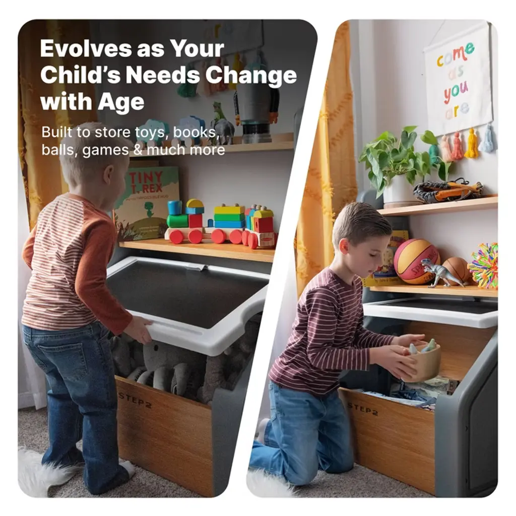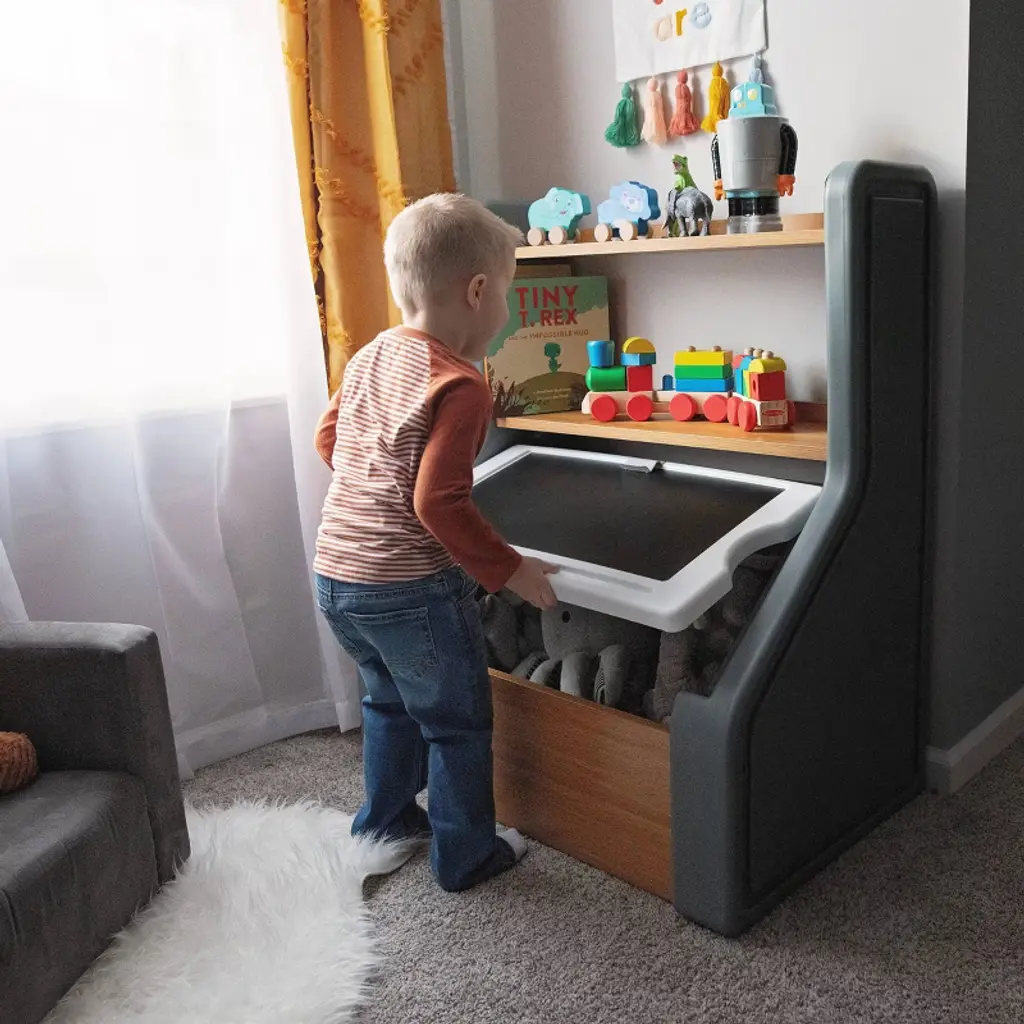 Combining practical storage with thoughtful design, the Harmony Toy Storage Box reimagines how children’s spaces can be both functional and inspiring. Crafted with a harmonious blend of resin and wood elements, this kids’ toy box brings durable sophistication to playtime. The spacious bottom area is large enough to hold stuffed animals and play balls, while the top storage shelves hold books and small toys. As your child grows, this toy organizer evolves to accommodate games, sports equipment, trophies, schoolbooks, and more. The removable lid becomes a stage for creativity a chalkboard surface and artwork clip invite endless storytelling and artistic expression. To top it off, style meets safety with gently rounded corners and a wide, stable base, ensuring peace of mind for parents. This modern toy storage solution grows and adapts with your child, promising years of reliable organization and inspiring countless childhood adventures. Whether you’re looking for a functional toy box for kids or a stylish addition to your living space, this design delivers on all the charm. Made in the USA of US and imported parts.