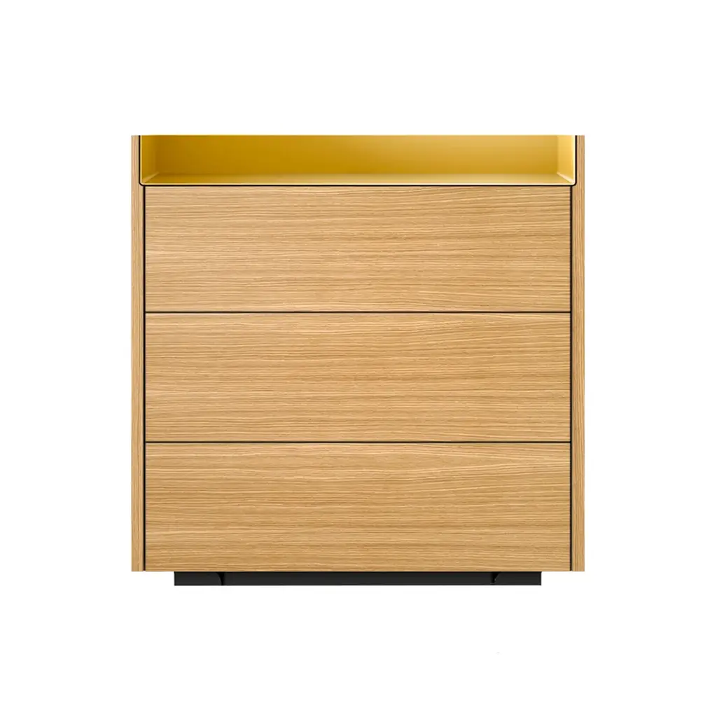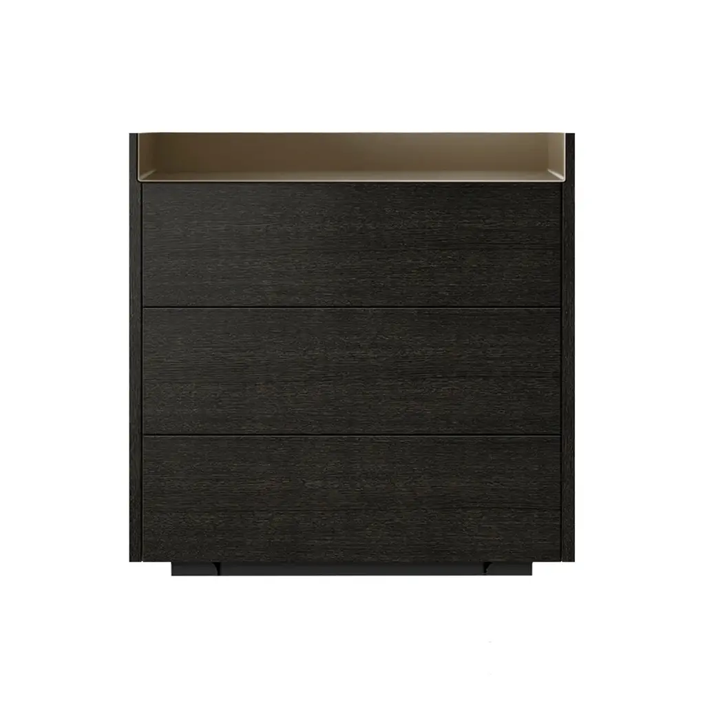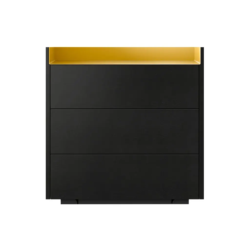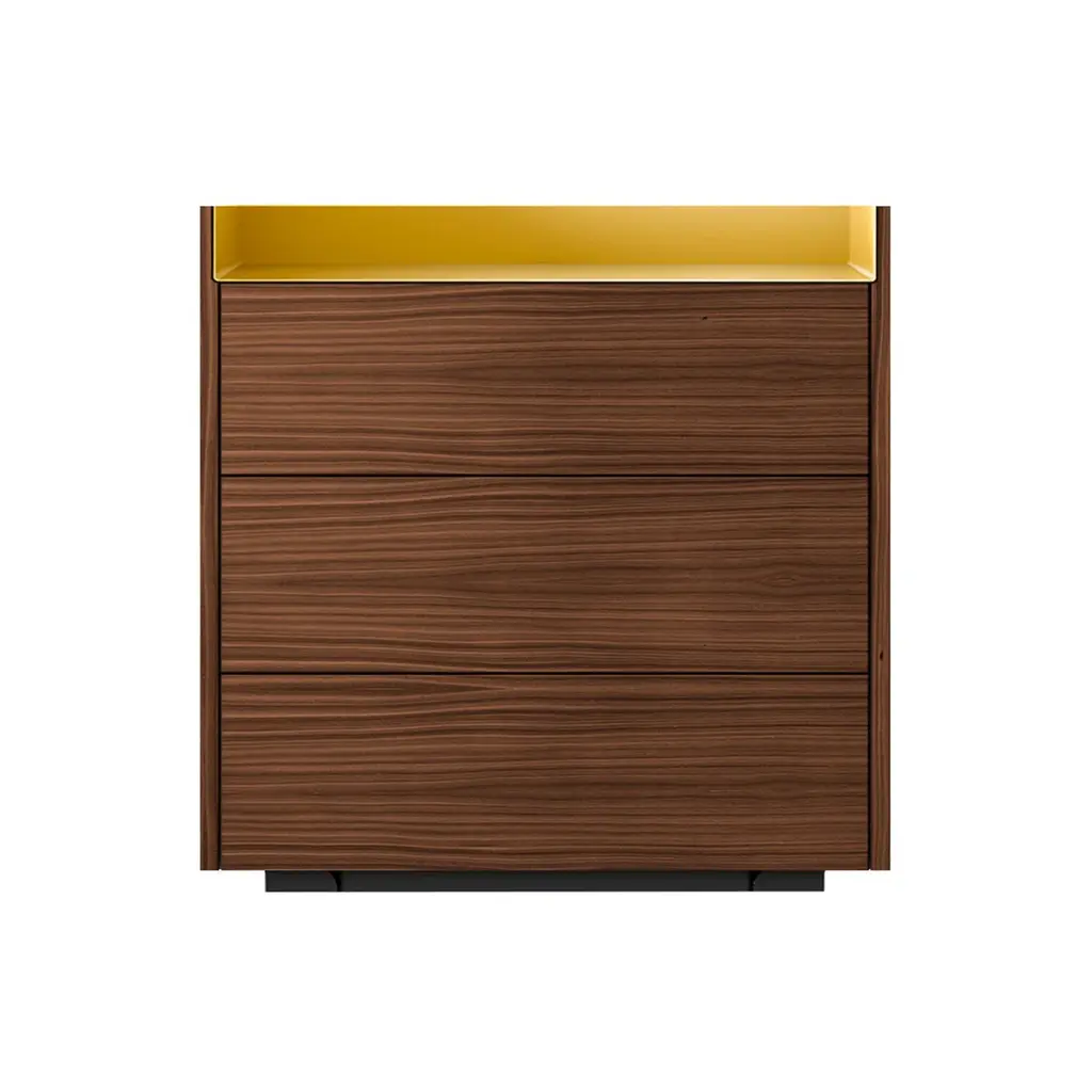The Stockholm STH012 Chest of Drawers is a distinguished piece from the Red Dot 2015 award-winning Stockholm collection. This chest features three spacious drawers, providing ample storage for various items. The top surface is adorned with a unique anodized aluminum finish, available in bronze, gold, black, or chocolate, adding a touch of elegance to the design. Constructed from MDF E1 fiberboard and low-formaldehyde particleboard, it is veneered in natural oak or walnut, offering a choice of finishes to complement diverse interiors. The chest rests on steel legs with adjustable feet, ensuring stability on various surfaces. The Stockholm STH012 Chest of Drawers seamlessly blends functionality with sophisticated design.