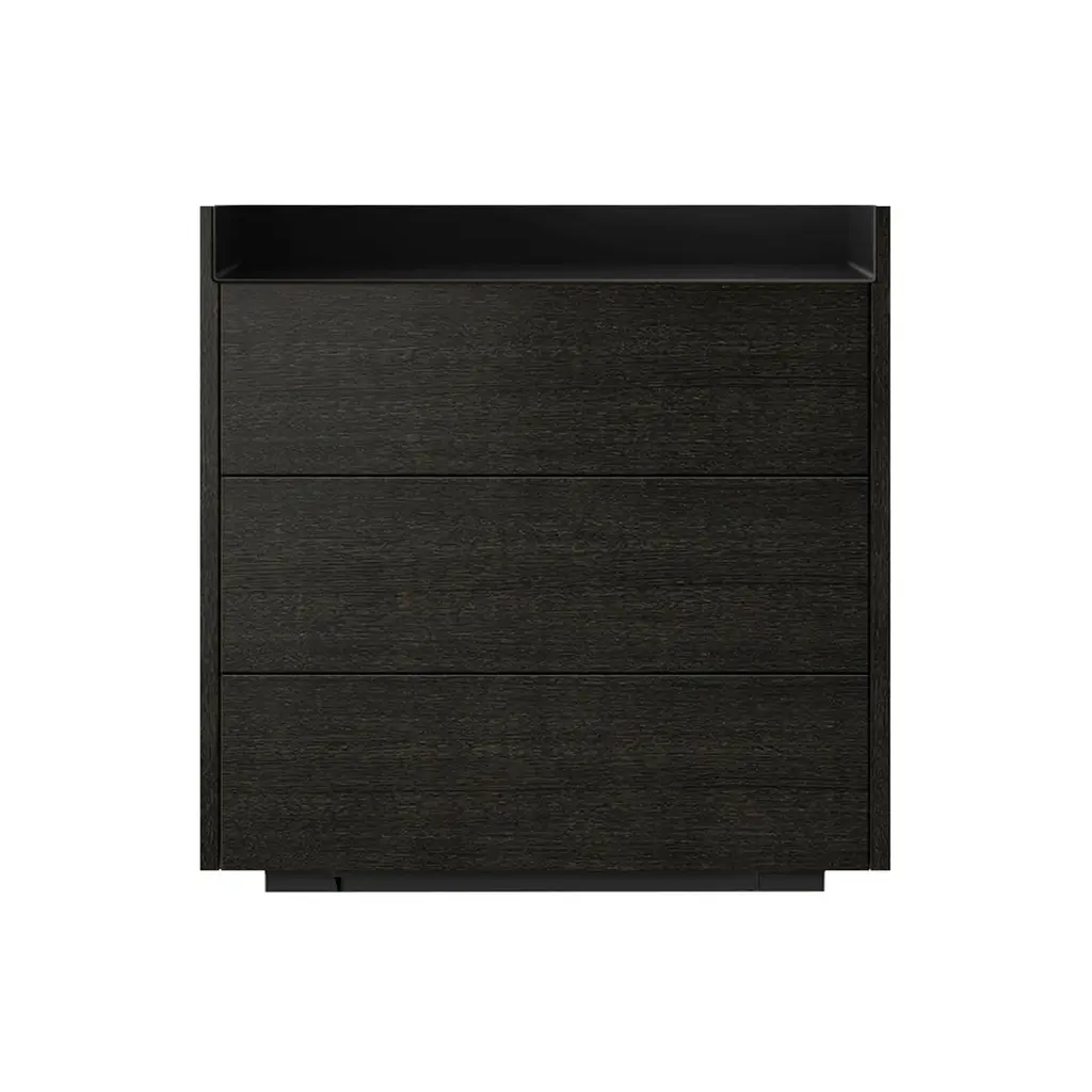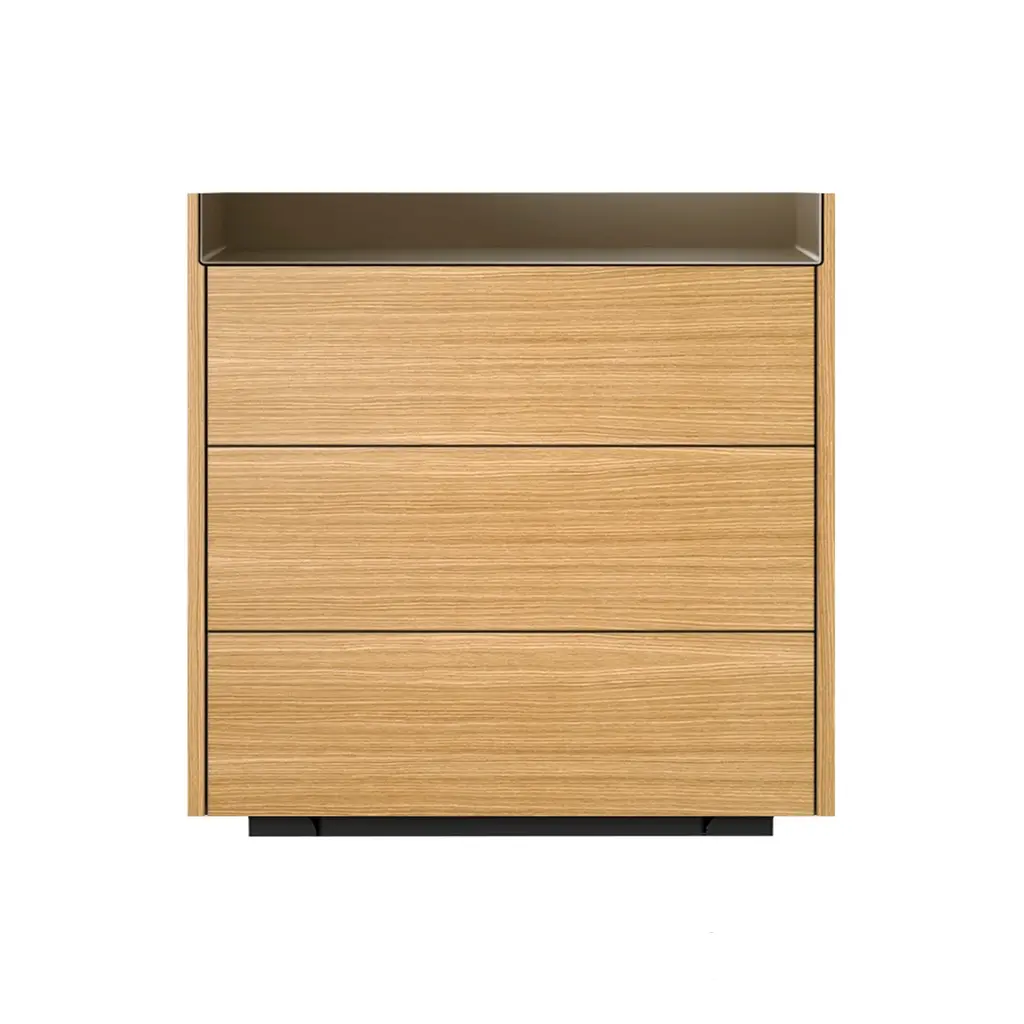 The Stockholm STH012 Chest of Drawers is a distinguished piece from the Red Dot 2015 award-winning Stockholm collection. This chest features three spacious drawers, providing ample storage for various items. The top surface is adorned with a unique anodized aluminum finish, available in bronze, gold, black, or chocolate, adding a touch of elegance to the design. Constructed from MDF E1 fiberboard and low-formaldehyde particleboard, it is veneered in natural oak or walnut, offering a choice of finishes to complement diverse interiors. The chest rests on steel legs with adjustable feet, ensuring stability on various surfaces. The Stockholm STH012 Chest of Drawers seamlessly blends functionality with sophisticated design.