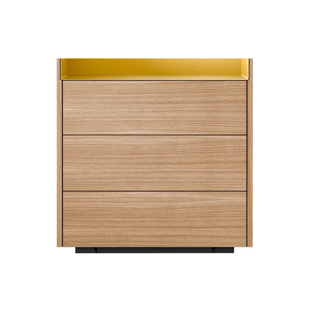 The Stockholm STH012 Chest of Drawers is a distinguished piece from the Red Dot 2015 award-winning Stockholm collection. This chest features three spacious drawers, providing ample storage for various items. The top surface is adorned with a unique anodized aluminum finish, available in bronze, gold, black, or chocolate, adding a touch of elegance to the design. Constructed from MDF E1 fiberboard and low-formaldehyde particleboard, it is veneered in natural oak or walnut, offering a choice of finishes to complement diverse interiors. The chest rests on steel legs with adjustable feet, ensuring stability on various surfaces. The Stockholm STH012 Chest of Drawers seamlessly blends functionality with sophisticated design.