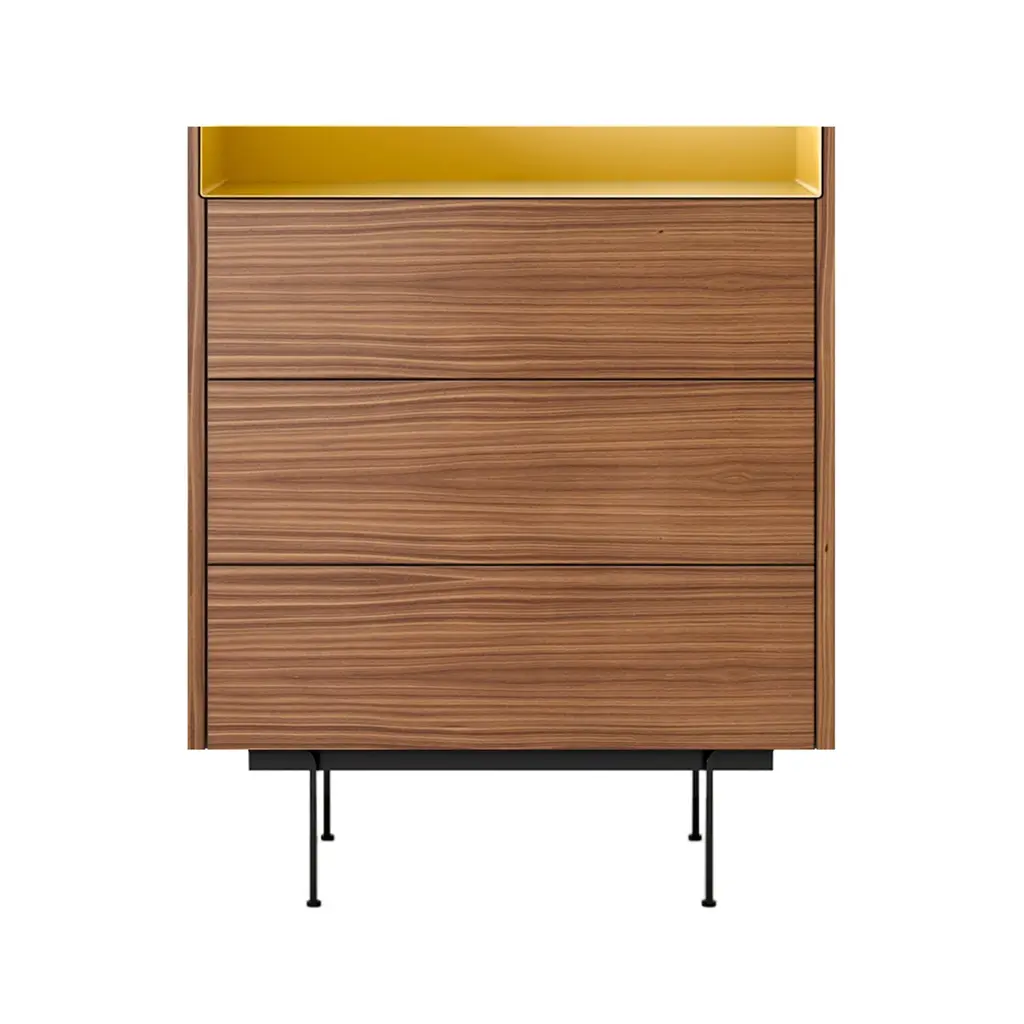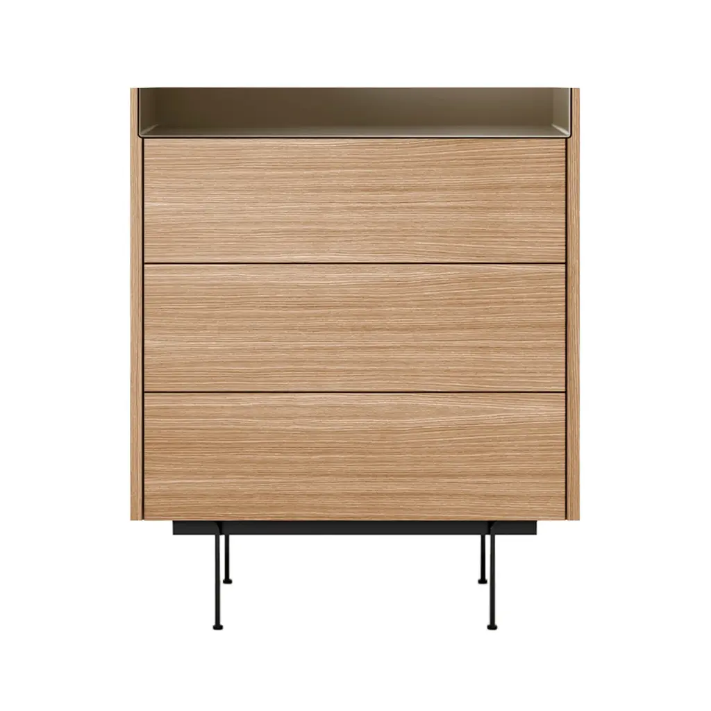 The STH012 Chest of Drawers offers ample storage with its three spacious drawers. Its top surface features an anodized aluminum finish in bronze, gold, black, or chocolate, adding a refined touch. Constructed from MDF E1 fiberboard and low-formaldehyde particleboard, the chest is veneered in natural oak or walnut to suit various interiors. It stands on steel legs with adjustable feet for stability on different surfaces. The STH012 Chest of Drawers combines practical storage with a refined design.