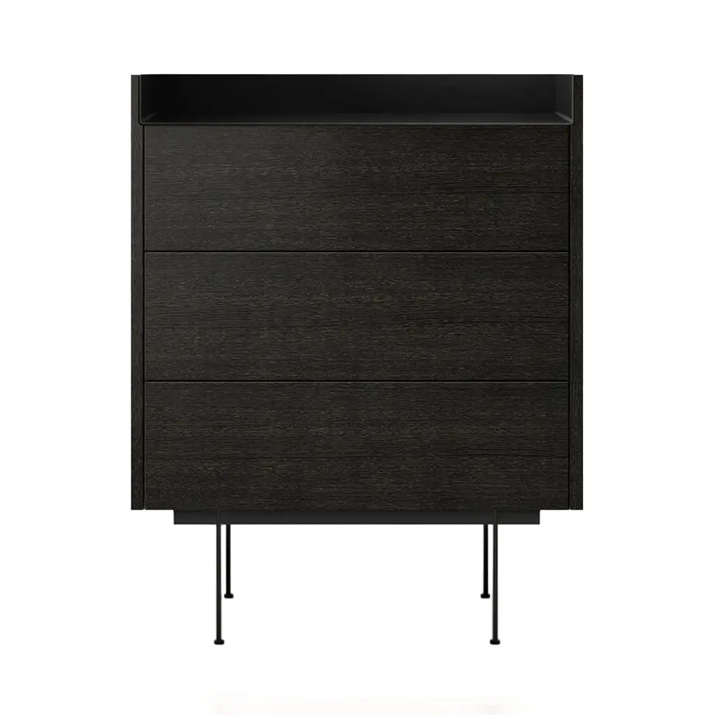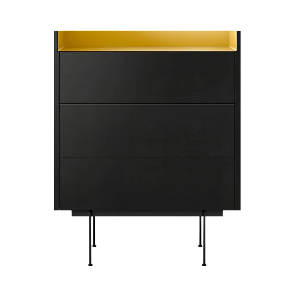 The STH012 Chest of Drawers offers ample storage with its three spacious drawers. Its top surface features an anodized aluminum finish in bronze, gold, black, or chocolate, adding a refined touch. Constructed from MDF E1 fiberboard and low-formaldehyde particleboard, the chest is veneered in natural oak or walnut to suit various interiors. It stands on steel legs with adjustable feet for stability on different surfaces. The STH012 Chest of Drawers combines practical storage with a refined design.