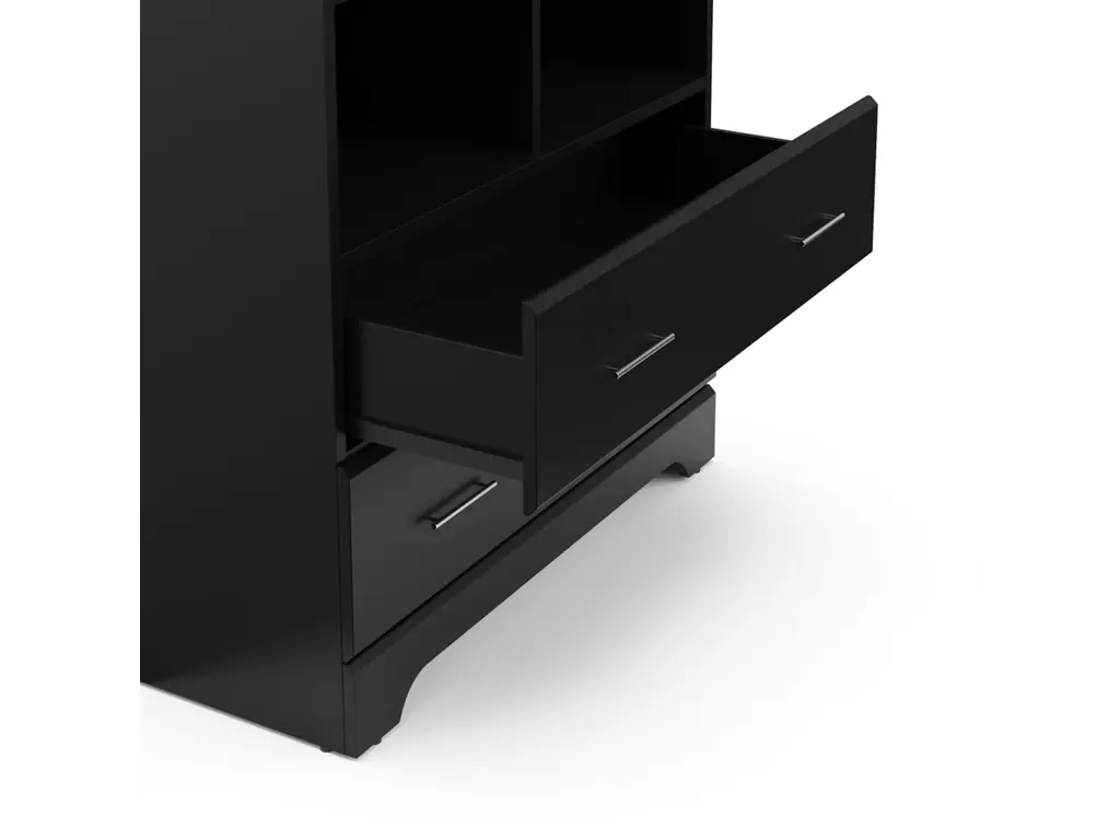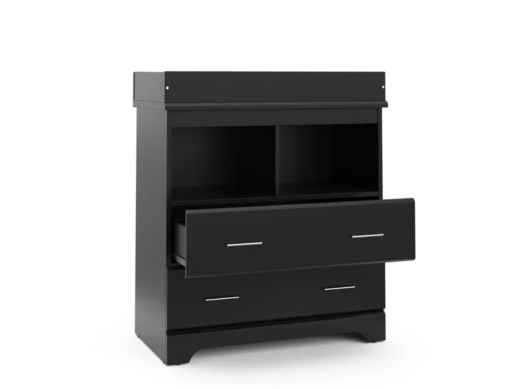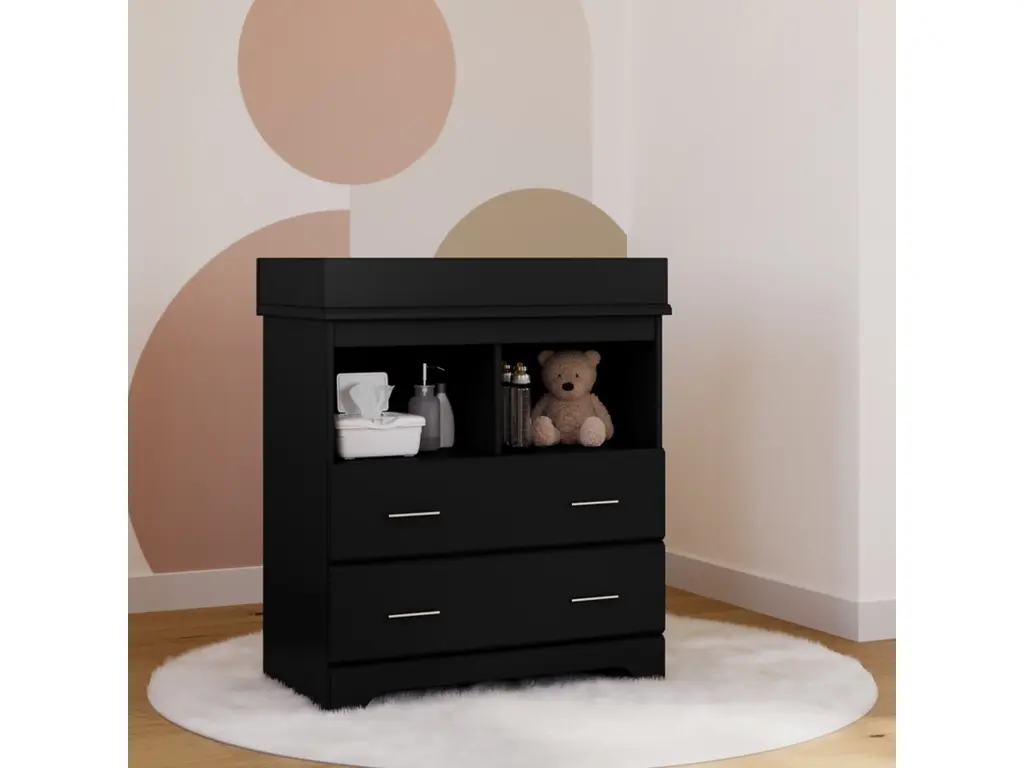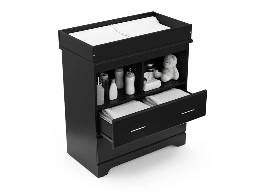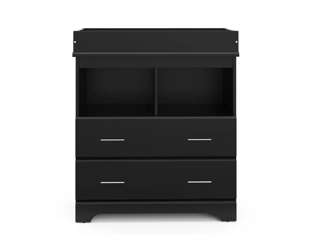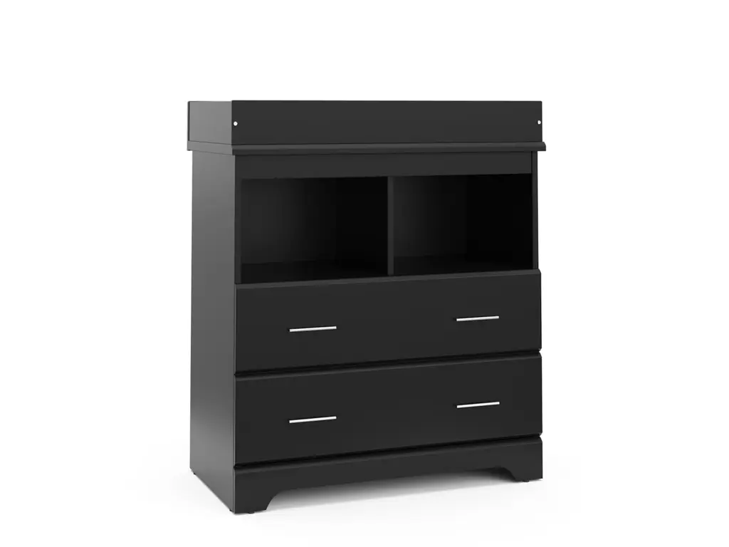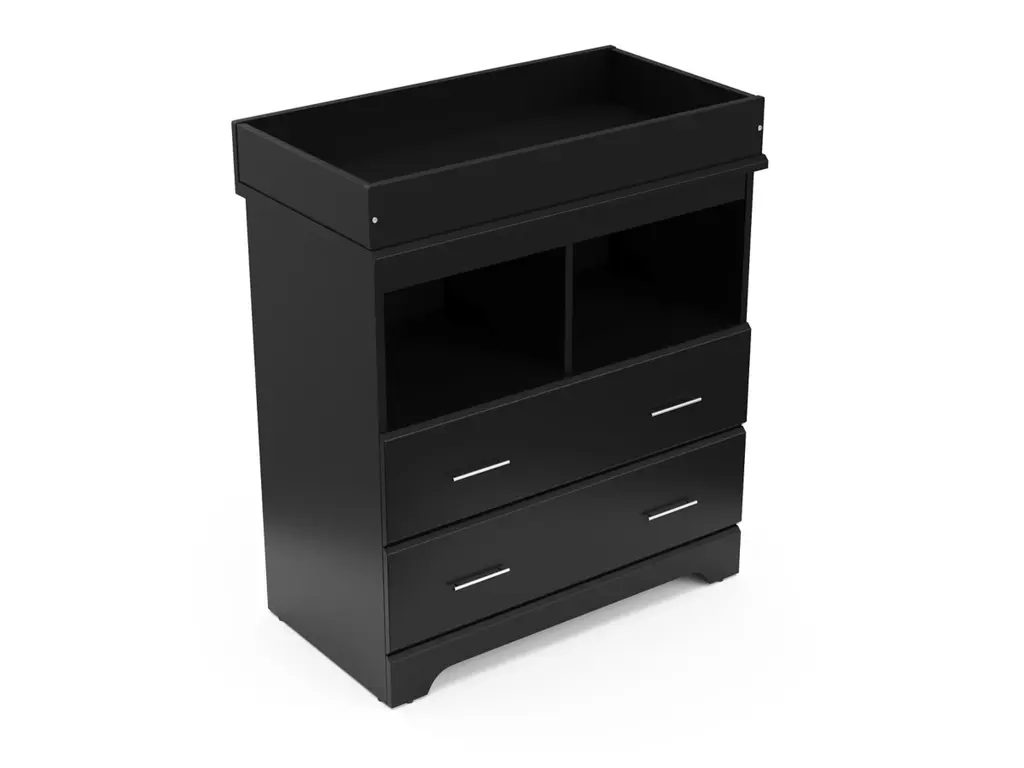 Part of Storkcraft's exclusive Brookside Collection, the Storkcraft Brookside 2 Drawer Changing Chest offers families a stylish, compact nursery chest with 2 open shelves and a built-in changing topper. The Brookside's built-in changing topper was designed to fit any standard-size baby changing pad, while its 2 open shelves and 2 organizer drawers offer storage of nursery items and essentials. Featuring 2 spacious drawers and 2 open shelves to store and organize your nursery or kids bedroom essentials, the Brookside is constructed with sturdy, durable, high-quality engineered wood - a warp-resistant and twist-resistant material that is sure to last the test of time. The Brookside’s quality craftsmanship includes smooth-gliding Euro-glide drawers with safety stops, and German cam locks. Also, the Brookside’s stain-resistant surface is easy to wipe clean, and its universal design and easy-to-match style makes it perfect for any nursery or kids room. Rigorously tested and crafted with care, the Storkcraft Brookside 2 Drawer Changing Chest meets or exceeds all applicable federal and anti-tipping safety standards. Also, Storkcraft is the proud recipient of the 2023 Women's Choice Award for 9 out of 10 Customer Recommended Baby & Kids Furniture. Crafted with love, passion, and care by Storkcraft - the longest-standing name in baby cribs, with over 75 years of experience in nursery and kids furniture. Complete the Brookside Collection with the Brookside’s matching 6 Drawer Double Dresser. Easy assembly required. Backed by Storkcraft’s limited 1-year manufacturer’s warranty and supportive customer care team. Changing pad not included.