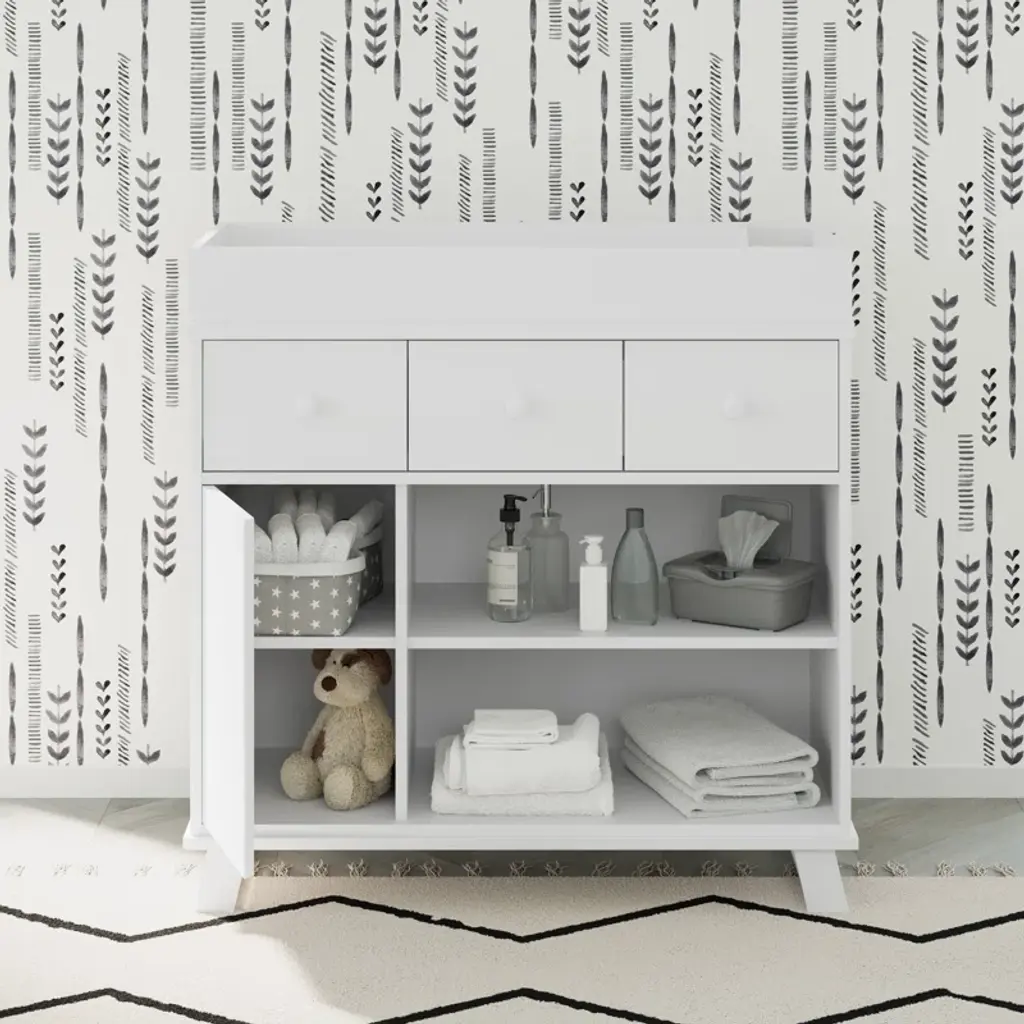 Introducing the Storkcraft Equinox 3-in-1 Convertible Crib, a truly unique crib with a modern structure, distinguished by its strong frame lines and a two-tone design. The Equinox is made with high-quality pine wood and composites. The Equinox features a 3-position adjustable height mattress support base. Like all Storkcraft cribs, the Equinox is certified by the Juvenile Products Manufacturers Association (JPMA) and is meticulously tested to meet or exceed all applicable federal safety standards to ensure the safest sleeping environment for your child. Size: Length (58.15 inches); Width (29.53 inches); Height (35.02 inches); Weight (69.3 pounds); Maximum recommended child weight for toddler bed and daybed stages (50 pounds); Fits standard size crib mattress (sold separately). Limited 1-year manufacturer’s warranty; assembly required; mattress not included; Storkcraft Toddler Guardrail sold separately. Add unparalleled, modern style and function to your nursery with the all-new Storkcraft Modern Nursery Changing Table Dresser. This stylish, sturdy, 2-tone dresser features a changing table topper with 2 compartments: one for your baby’s changing pad (fits all standard-sized changing pads), and to fit your changing essentials. In addition to the changing table topper, the Storkcraft Modern Nursery Changing Table Dresser features 2 spacious drawers (complete with Euroglide drawer tracks and durable steel hardware), 2 open storage shelves, and an enclosed storage cabinet with 2 adjustable-height shelves inside. Crafted from durable engineered wood, the Storkcraft Modern Nursery Changing Table Dresser complies with all applicable federal safety standards. Also, the changing topper is JPMA Certified. To complete your nursery, pair the Storkcraft Modern Nursery Changing Table Dresser with any of our other matching 2-tone cribs: the Storkcraft Equinox 3-in-1 Convertible Crib, Storkcraft Orchard 5-in-1 Convertible Crib, or our modern Storkcraft Beckett 3-in-1 Convertible Crib. Exclusively from Storkcraft, the longest standing name in baby furniture and proud recipient of the 2020 Women's Choice Award for 9 out of 10 Customer Recommended Baby & Kids Furniture Easy assembly required. Backed by Storkcraft’s 1-year limited warranty and expert customer care.