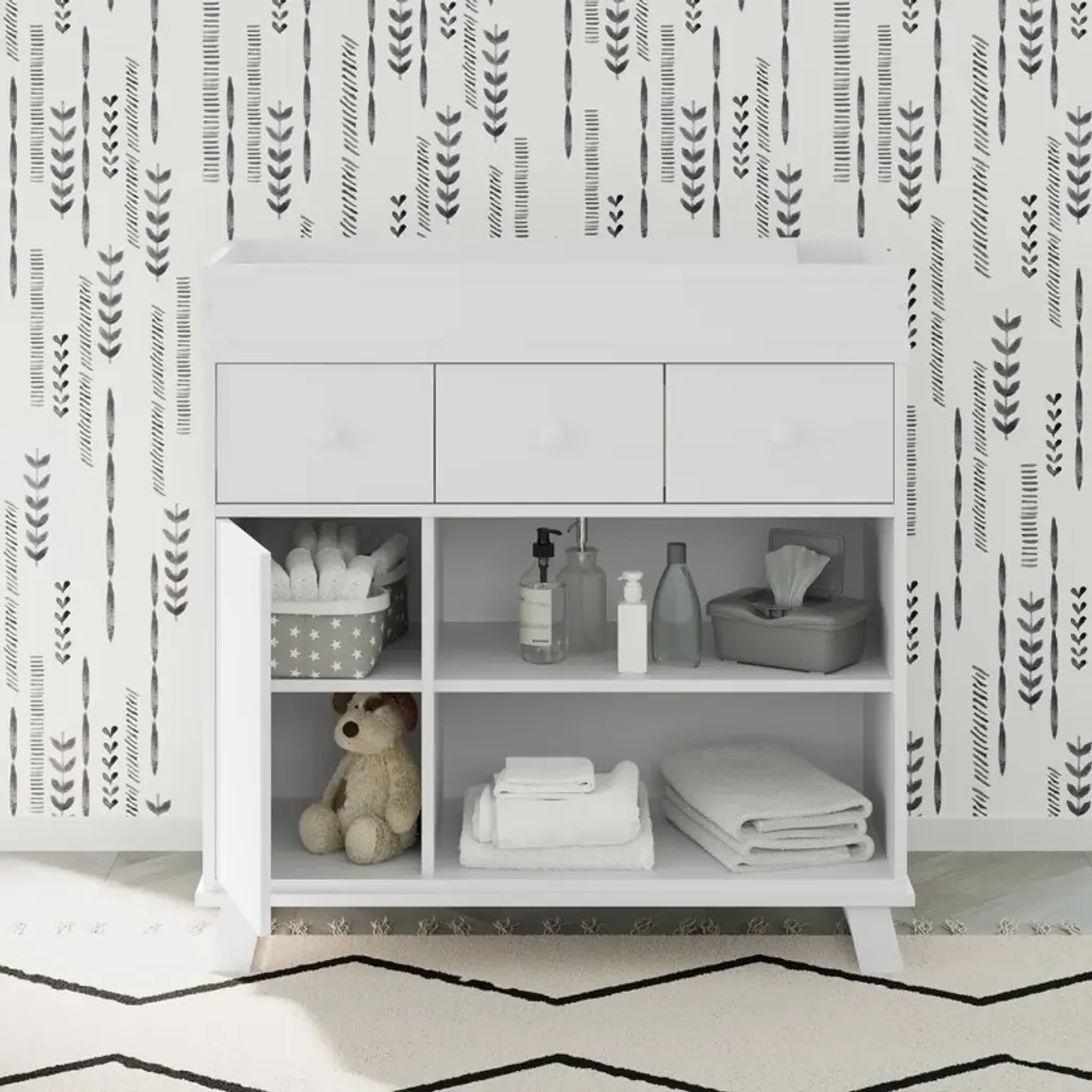 Add unparalleled, modern style and function to your nursery with the all-new modern nursery-changing table dresser. This stylish, sturdy, 2-tone dresser features a changing table topper with 2 compartments: One for your baby’s changing pad (fits all standard-sized changing pads), and one to fit your changing essentials. In addition to the changing table topper, the modern nursery changing table dresser features 2 spacious drawers (complete with Euro glide drawer tracks and durable steel hardware), 2 open storage shelves, and an enclosed storage cabinet with 2 adjustable-height shelves inside. Crafted from durable engineered wood, and non-toxic finishes.