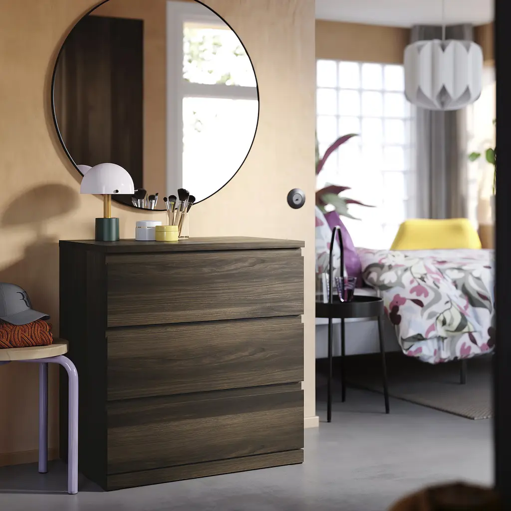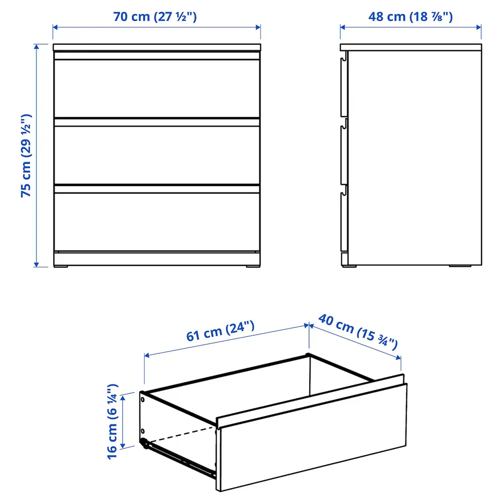 STORKLINTA 3-drawer chest - dark brown/oak effect anchor/unlock function 27 1/2x18 7/8x29 1/2 ". Our safety feature Anchor and unlock enhances the safety of your chest of drawers by significantly reducing, but not completely eliminating, the tip-over risk.