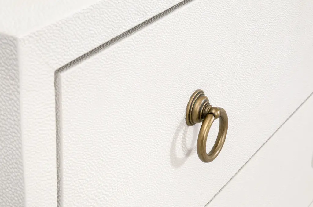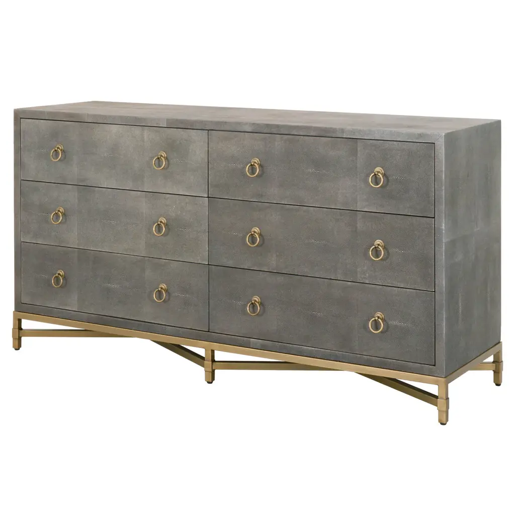 Transitional style six drawer dresser with a pearl or grey faux shagreen finish and gold hardware. Details Overall Dimensions: W:68" D:20" H:37.5" Faux Shagreen Resin Full Extension Metal Drawer Glides Brushed Gold Ring Pulls Hold-In Detent Prevents Drawer Roll Out Faux Shagreen Resin Panels Made to Mimic Natural Shagreen Skin, Including Seams of Variable Degree Tip Kit Included Materials: Faux Shagreen Resin, Solid Acacia Wood, Plywood, MDF, Steel PO Hardware: Brushed Gold Ring Pulls Drawer Interior Dimensions: 30.25" x 15" x 5.5" Free shipping in the continental U.S.