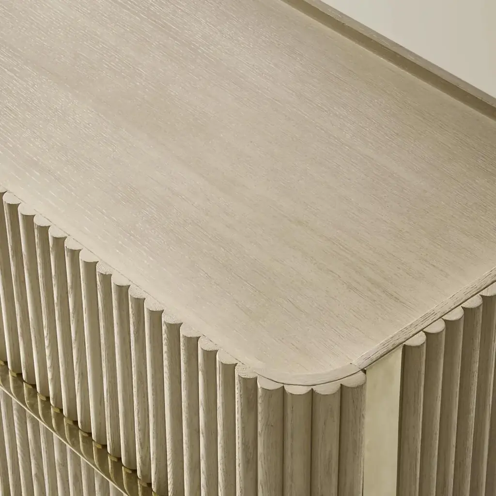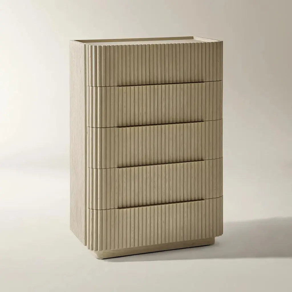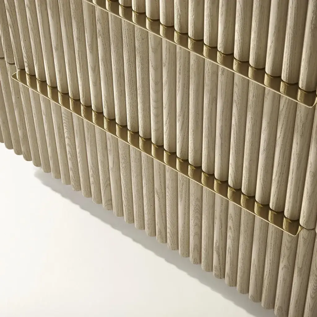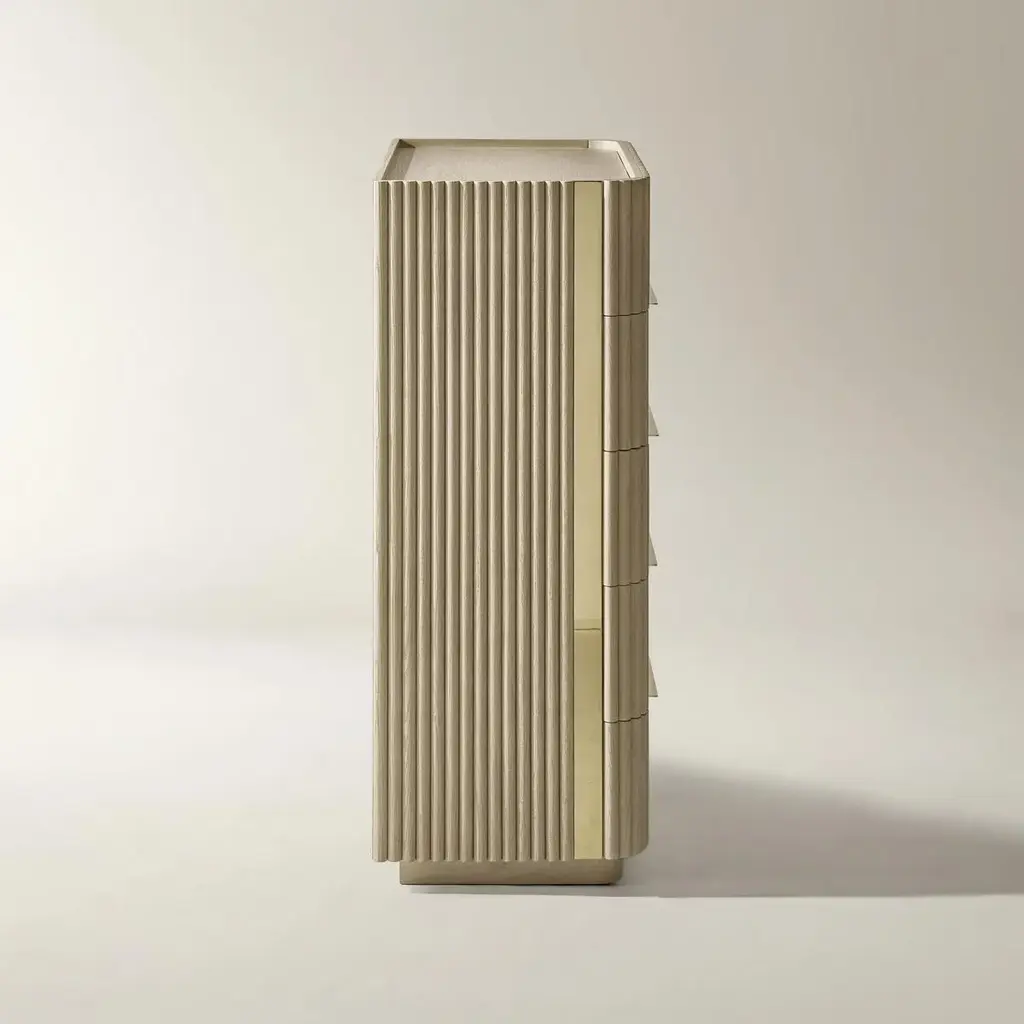 The Stria 5-Drawer Chest offers a sculptural approach to everyday storage. Its tall, vertical profile is wrapped in reeded solid oak, creating a tactile rhythm of shadow and texture. Light gold-plated trim and polished stainless steel end caps add refined contrast, making this reeded wood chest as visually striking as it is functional. Inside, five soft-close drawers open with a whisper and close with a satisfying hush, while a felt-lined top drawer protects your most delicate belongings. Thoughtfully engineered for quiet luxury and built to endure, this oak and gold chest brings vertical elegance to bedrooms, dressing areas, or curated corners throughout the home.ZG Exclusive