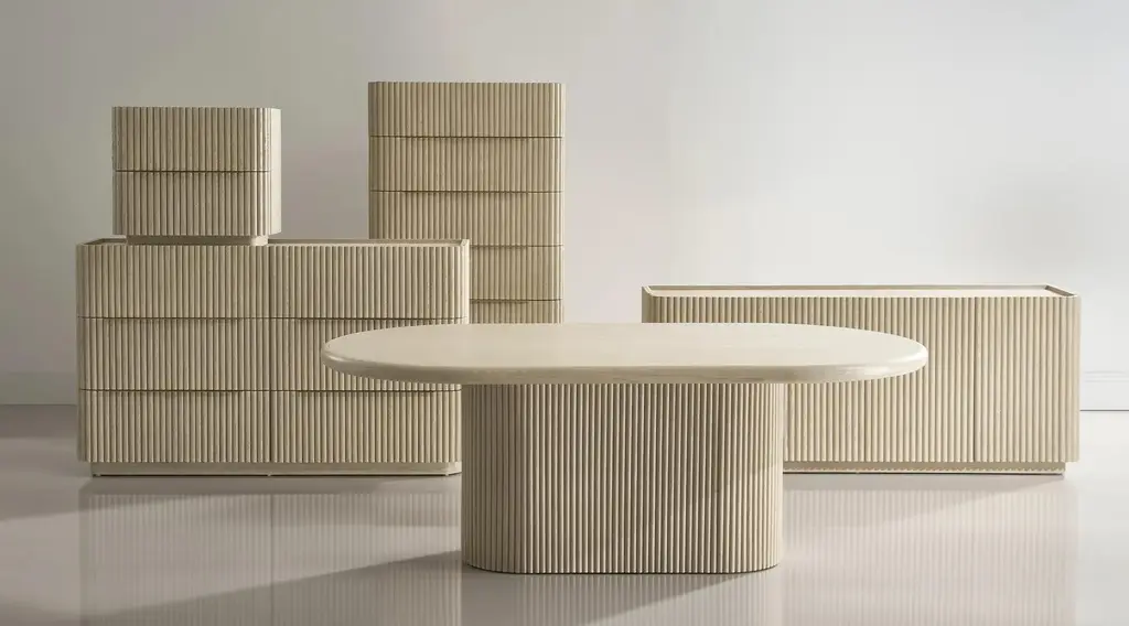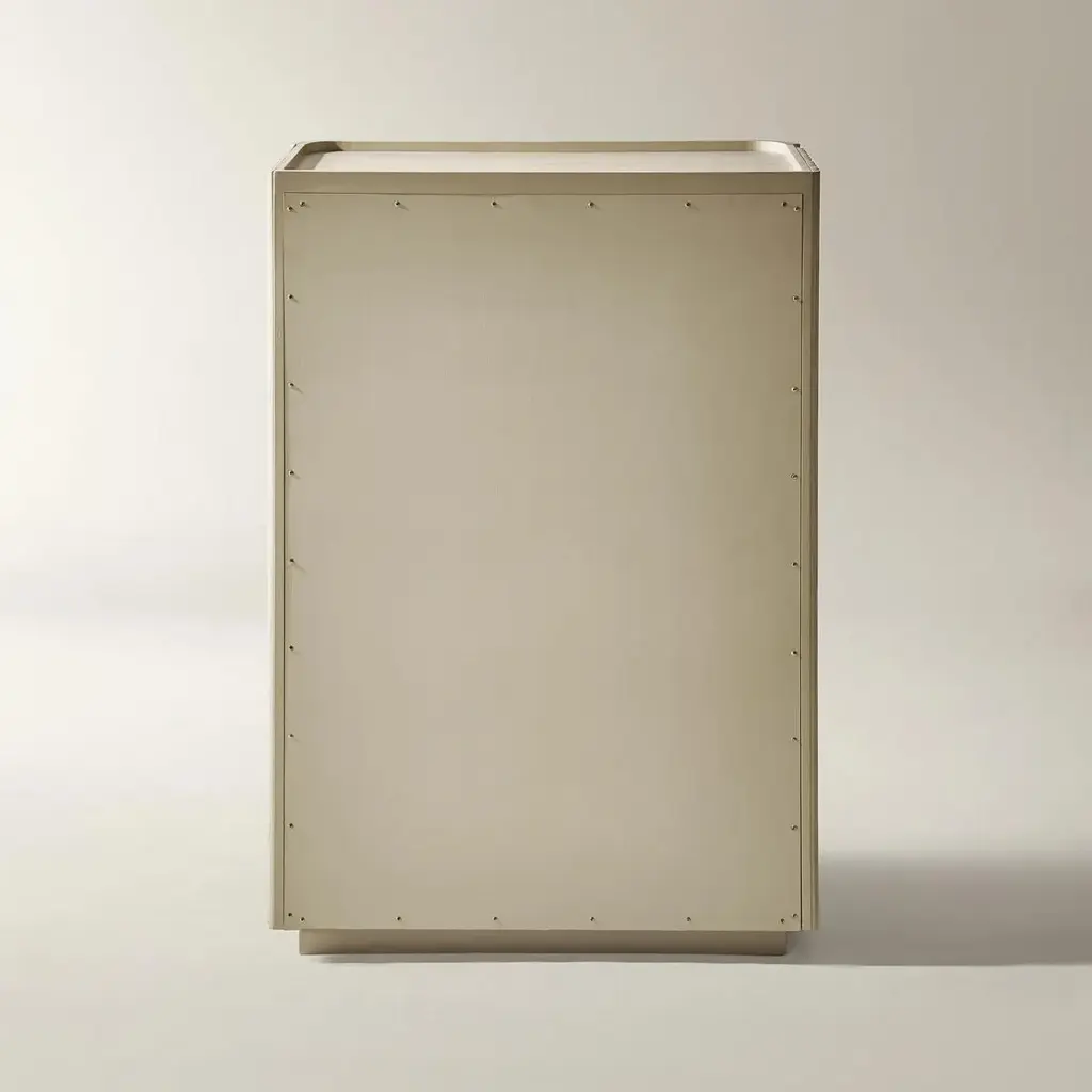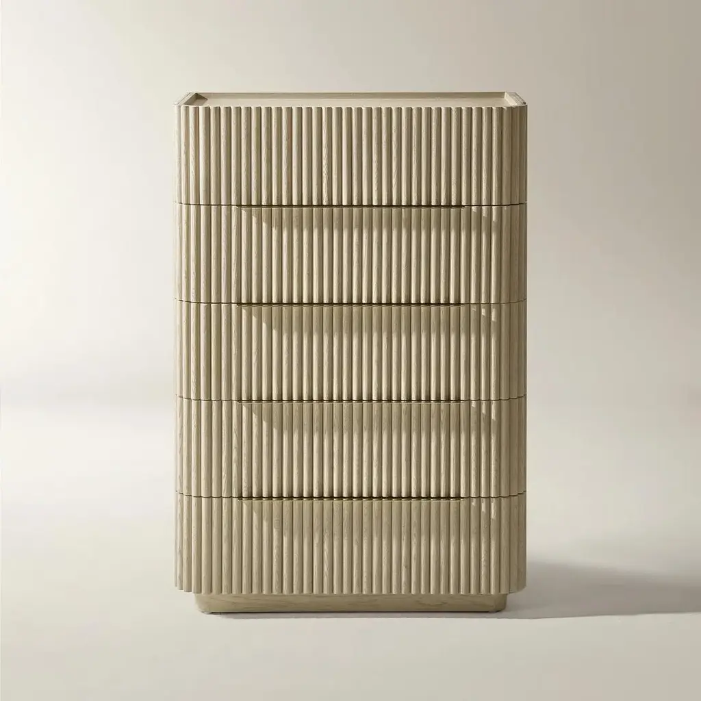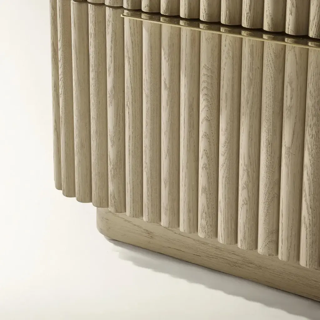 The Stria 5-Drawer Chest offers a sculptural approach to everyday storage. Its tall, vertical profile is wrapped in reeded solid oak, creating a tactile rhythm of shadow and texture. Light gold-plated trim and polished stainless steel end caps add refined contrast, making this reeded wood chest as visually striking as it is functional. Inside, five soft-close drawers open with a whisper and close with a satisfying hush, while a felt-lined top drawer protects your most delicate belongings. Thoughtfully engineered for quiet luxury and built to endure, this oak and gold chest brings vertical elegance to bedrooms, dressing areas, or curated corners throughout the home.ZG Exclusive