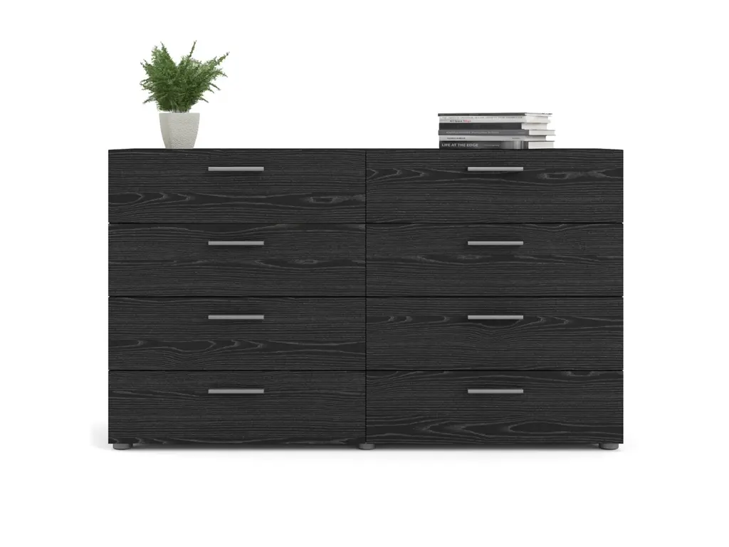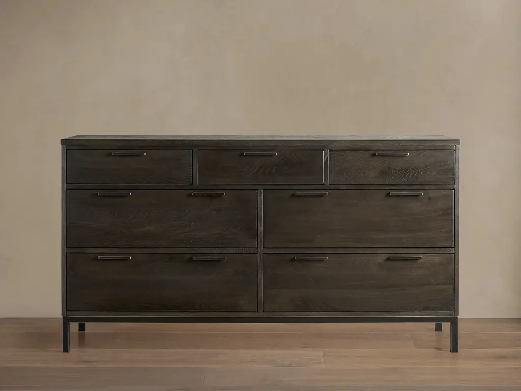 Simple sophistication with a modern edge. Solid acacia forms long, clean lines to lighten the natural depth of a burnished black finish. Brass-finished hardware adds a sleek touch to nine spacious drawers.