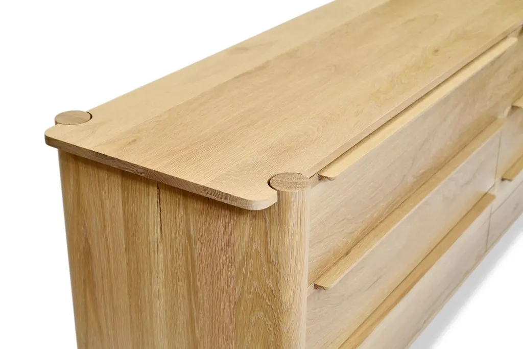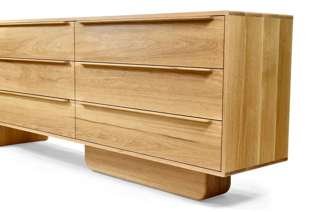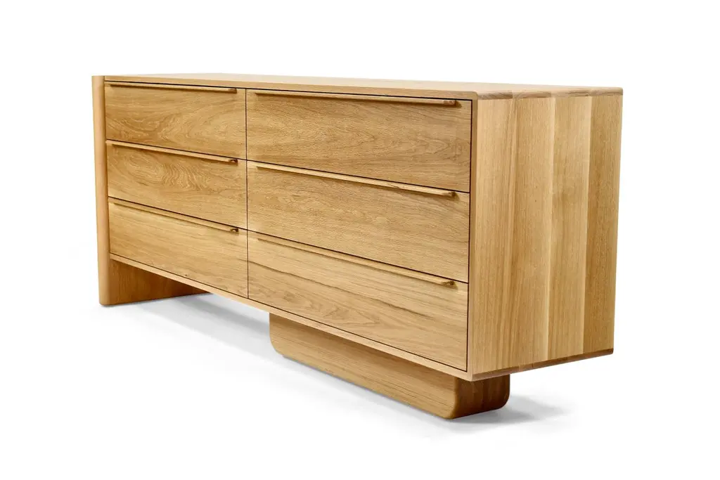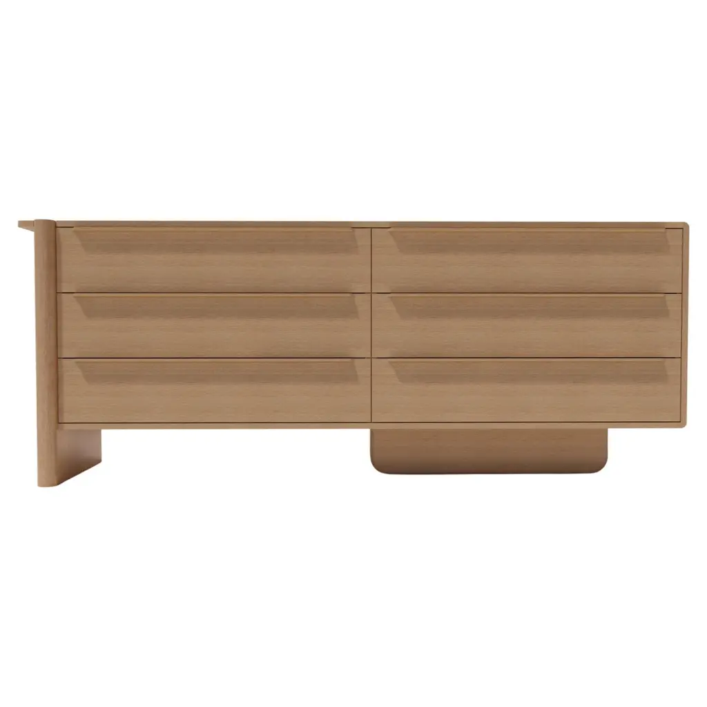 The Sulaco Six Drawer Dresser champions the foundations of the Danish Modern Movement. Rooted in functionality, every curve and feature is meticulously crafted to ensure aesthetics and utility go hand in hand. A modern sculpted design that embraces the traditions of natural materials applied in a sustainable and timeless approach. Available in Left or Right configuration.FSC certified solid wood construction. Made to Order. Available in three wood types and seven standard finishes.All storage pieces come standard with anti-tipping hardware, to be installed by the client.Handcrafted in Los Angeles