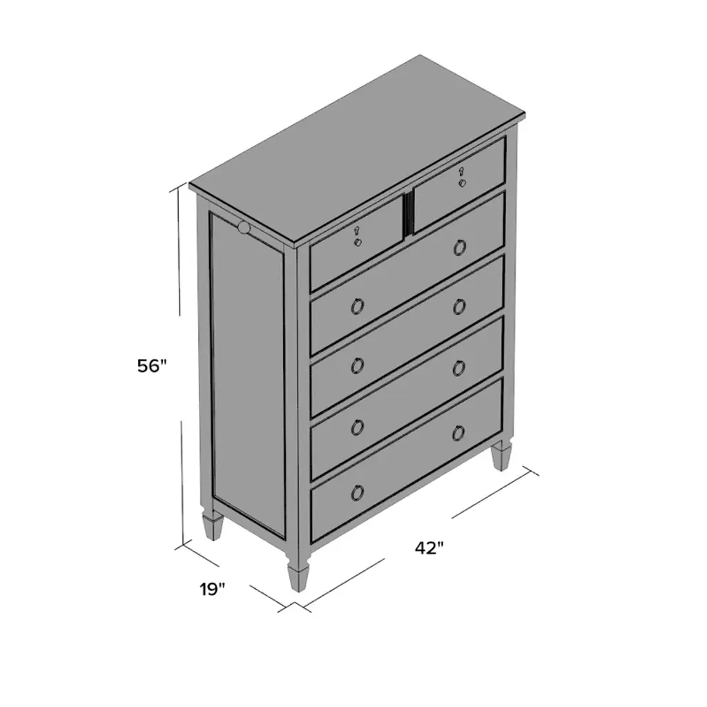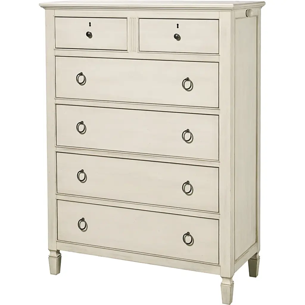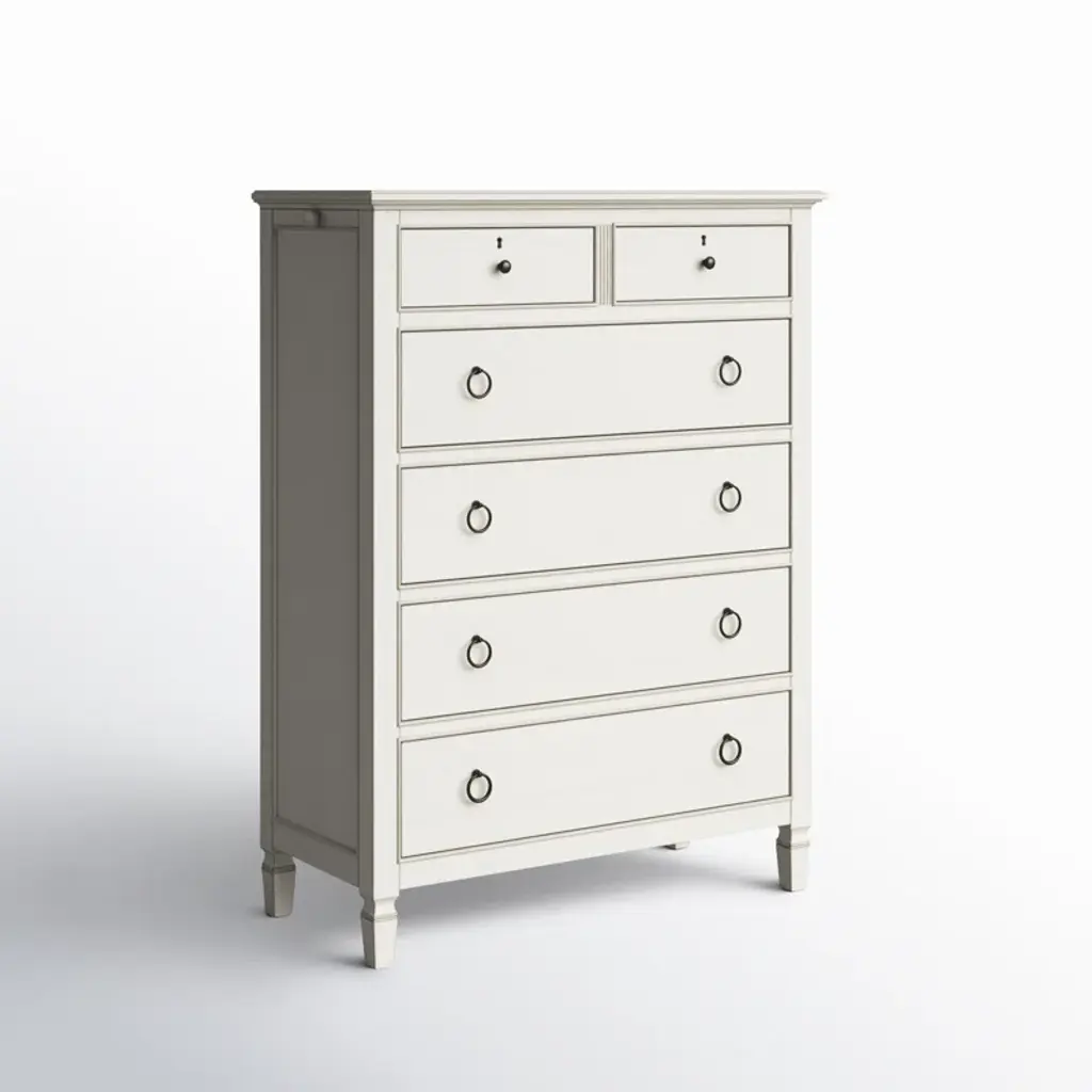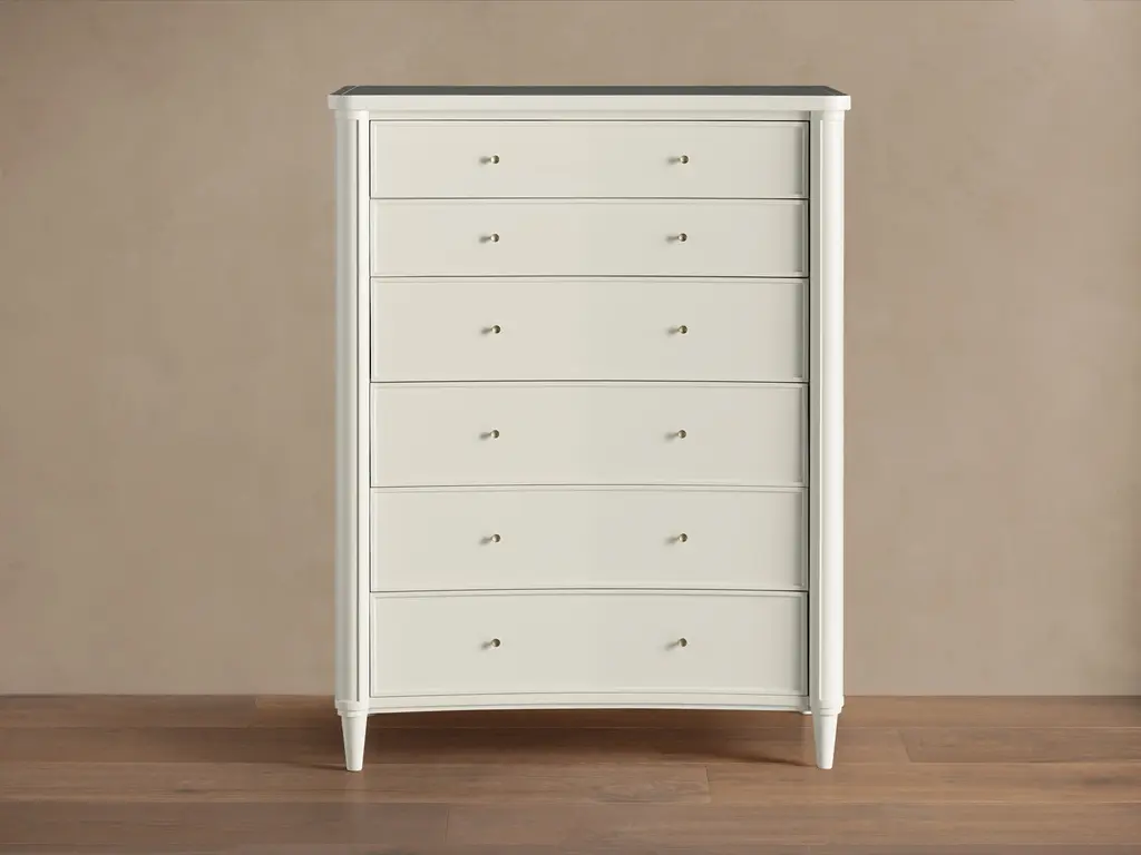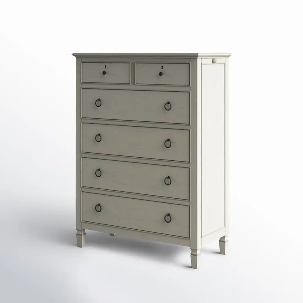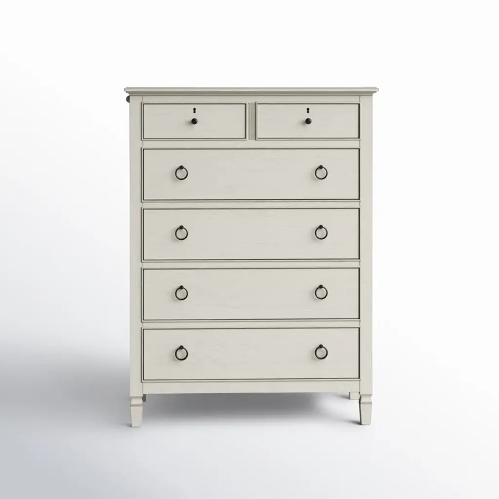 Add a lovely touch to your master suite or guest room with this 6 Drawer Chest, showcasing a cotton or midnight finish and drop-front compartment. Showcasing drawers and a neutral-toned finish, with a removable handle.