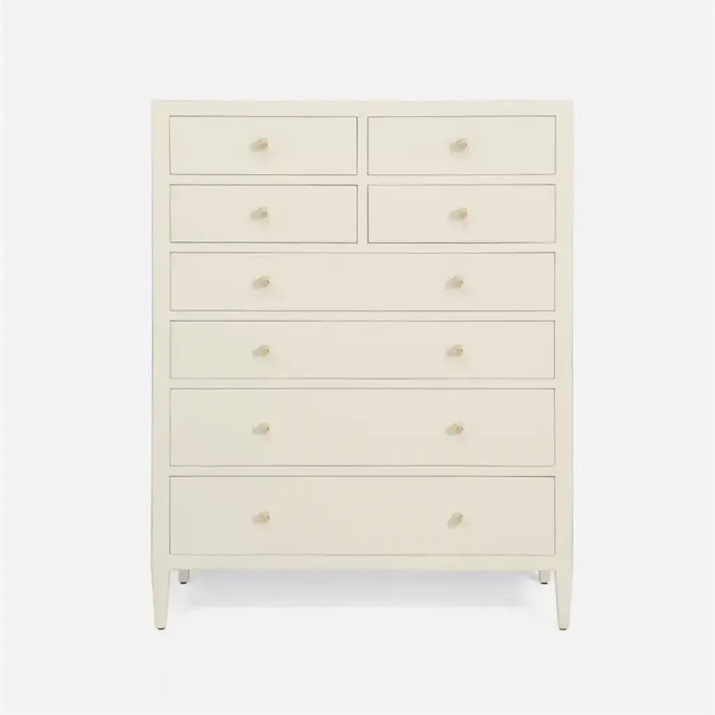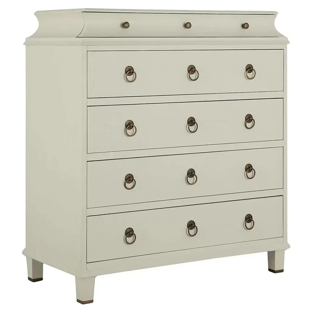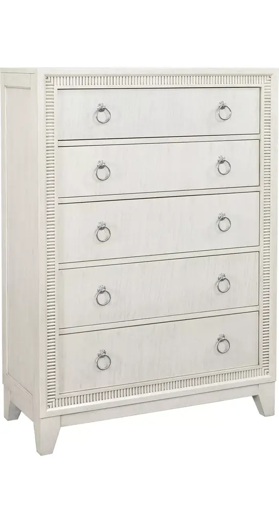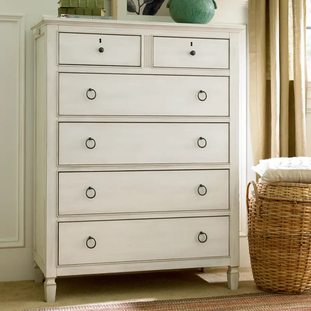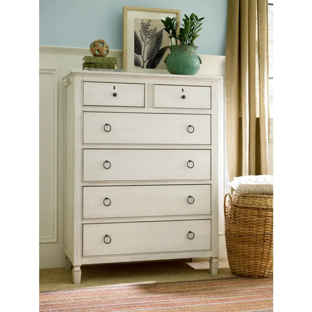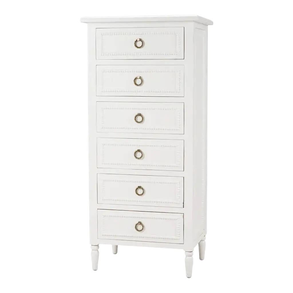 Add a lovely touch to your master suite or guest room with this 6 Drawer Chest, showcasing a cotton or midnight finish and drop-front compartment. Showcasing drawers and a neutral-toned finish, with a removable handle.