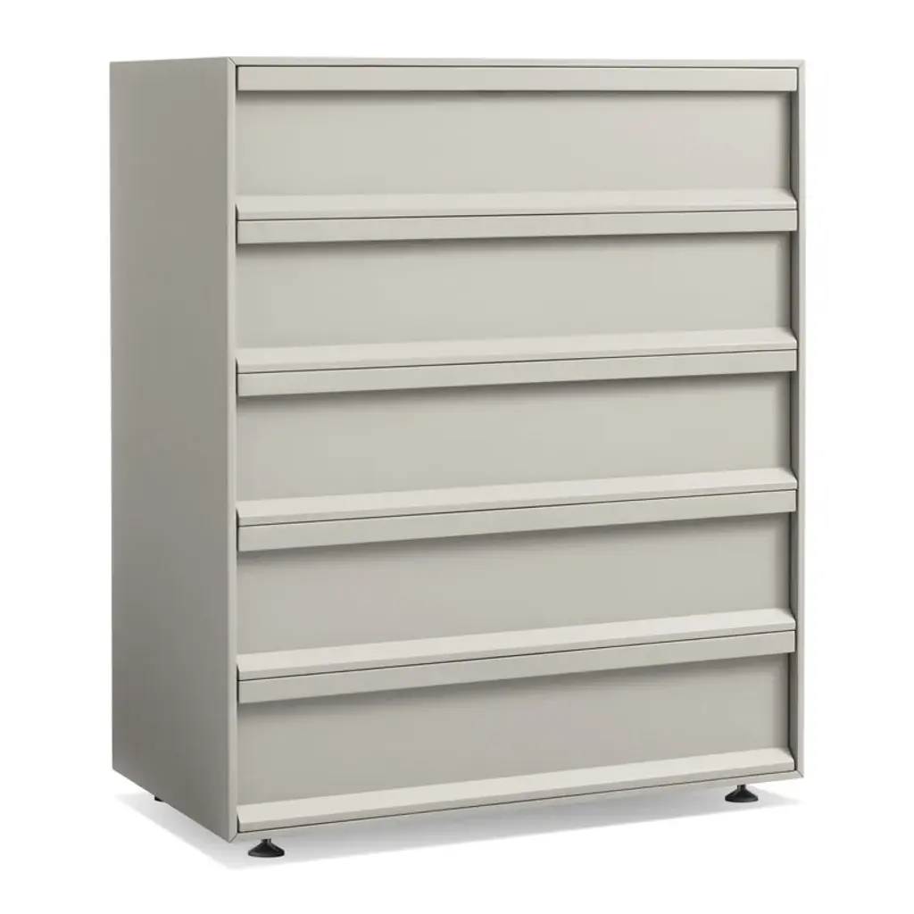 Uncomplicated storage for messy times. Beveled relief drawer pulls are set off by a matte painted finish. Soft close drawers keep the action smooth and serene.