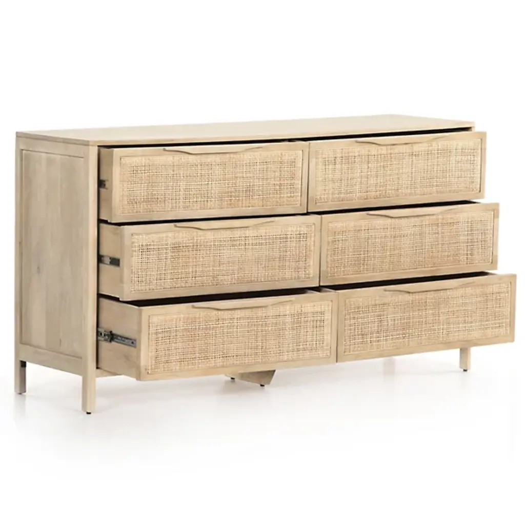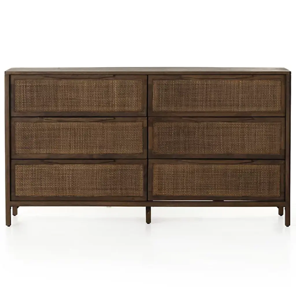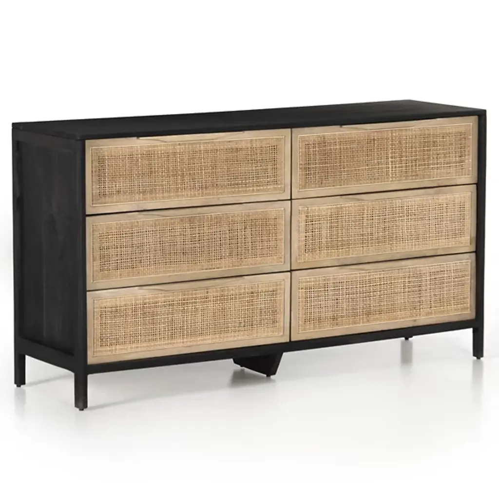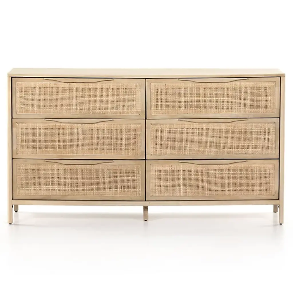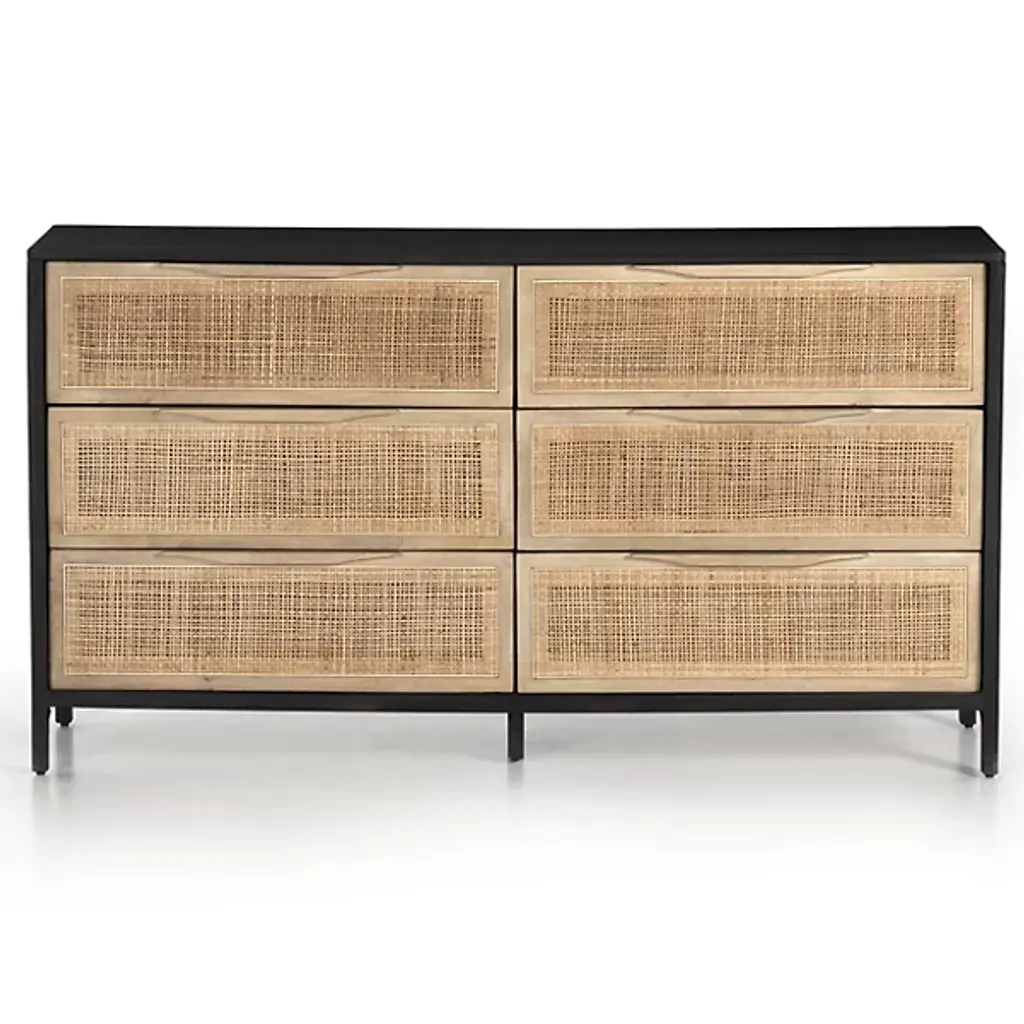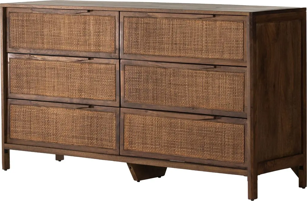 Enhance interiors with the rustic modern intricacy of the Sydney 6 Drawer Dresser from Four Hands. A robust rectangular construction rising from four short legs and a central fin, it uses durable mango wood to enclose six drawers fashioned from woven cane. The grid pattern of the drawer faces features just enough variation to add a welcome natural presence, while the naturally-grained surface of the frame housing captures attention, easing into a cohesive character.