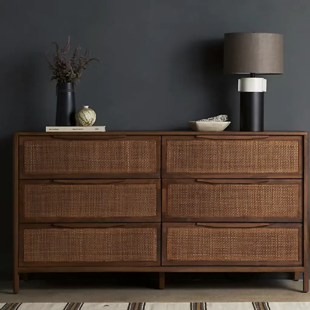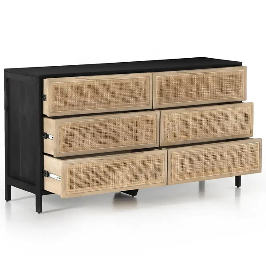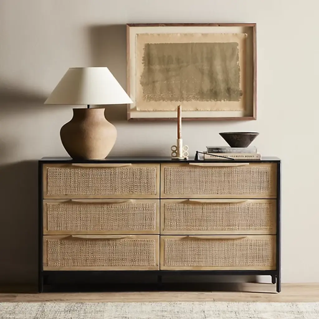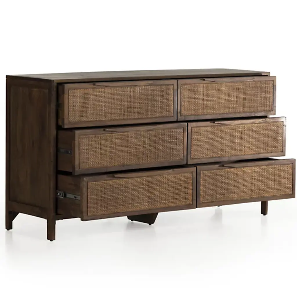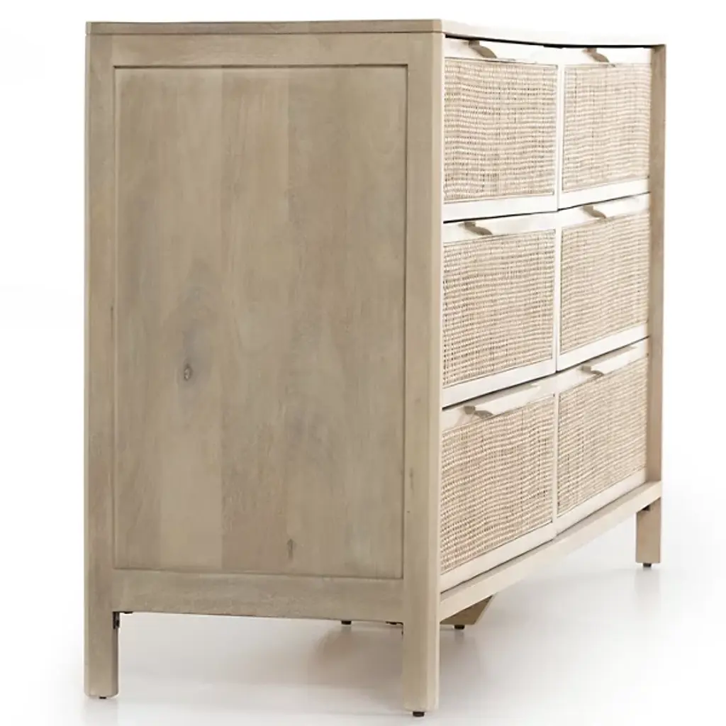 Enhance interiors with the rustic modern intricacy of the Sydney 6 Drawer Dresser from Four Hands. A robust rectangular construction rising from four short legs and a central fin, it uses durable mango wood to enclose six drawers fashioned from woven cane. The grid pattern of the drawer faces features just enough variation to add a welcome natural presence, while the naturally-grained surface of the frame housing captures attention, easing into a cohesive character.