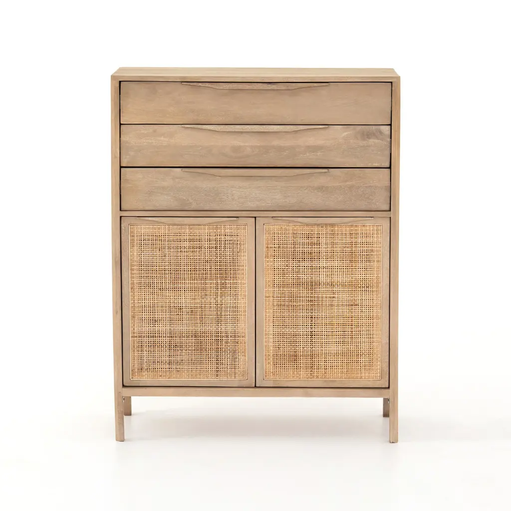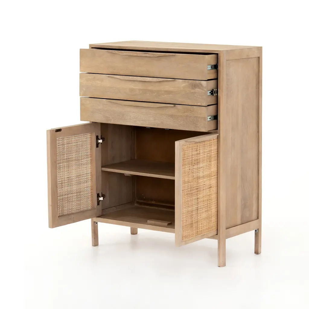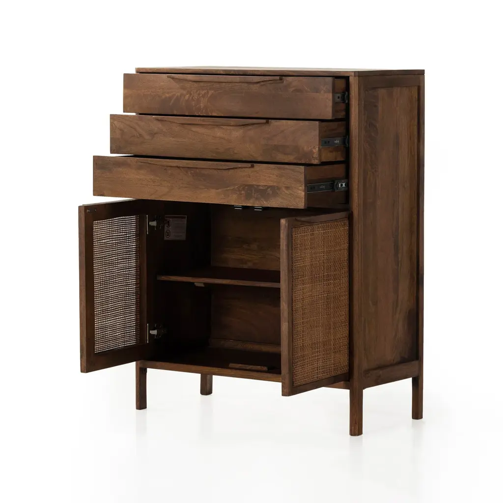 Store your belongings in style with the Sydney Tall Dresser from Four Hands. Crafted with mango wood framing and featuring a front cabinet of woven cane, this dresser adds a touch of texture and organic charm to any bedroom. With three spacious drawers and an adjustable shelf, you'll have plenty of storage space for all your needs. Highlights