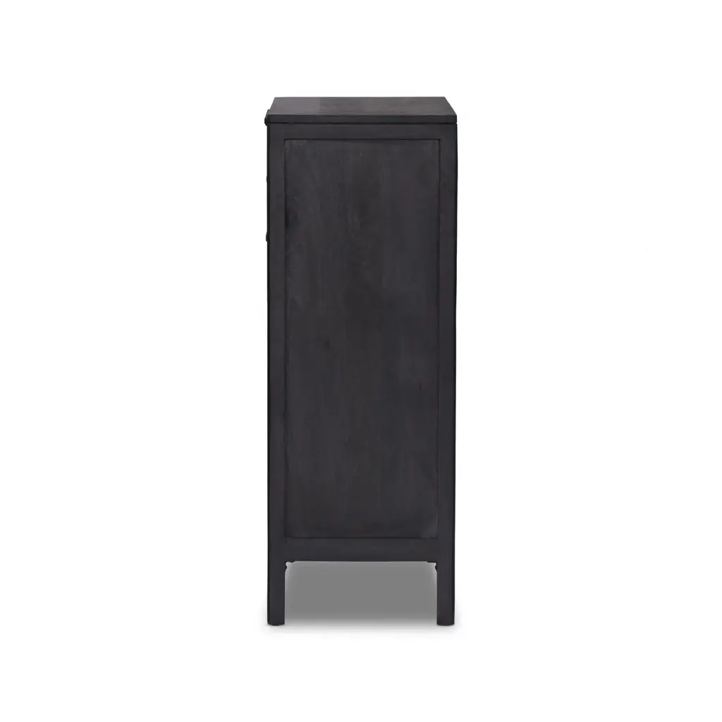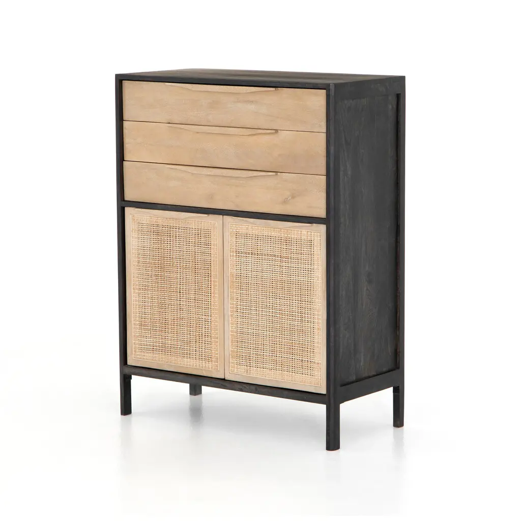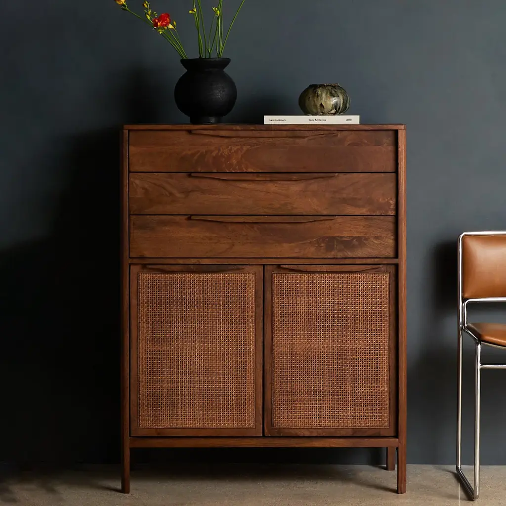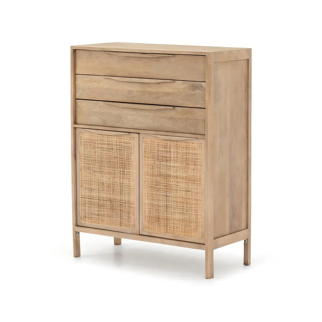 Store your belongings in style with the Sydney Tall Dresser from Four Hands. Crafted with mango wood framing and featuring a front cabinet of woven cane, this dresser adds a touch of texture and organic charm to any bedroom. With three spacious drawers and an adjustable shelf, you'll have plenty of storage space for all your needs. Highlights