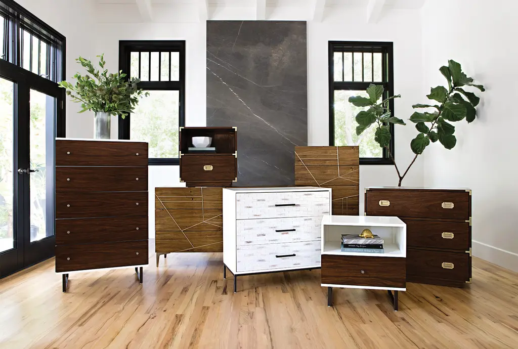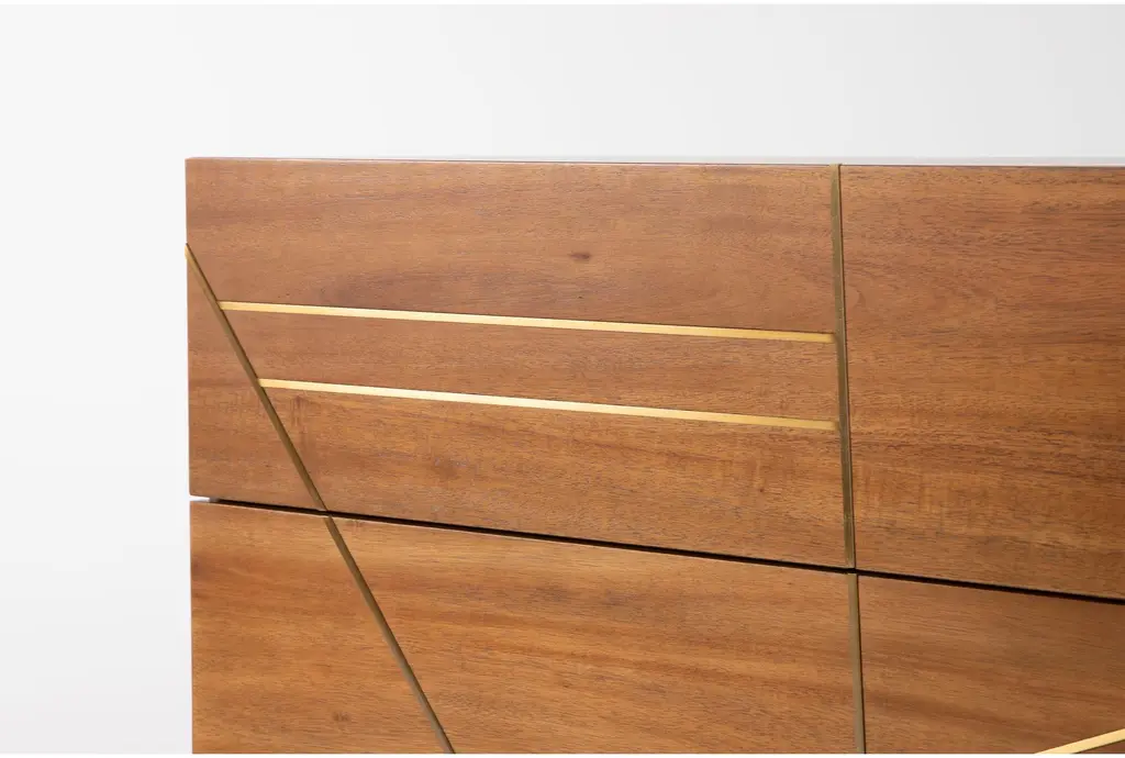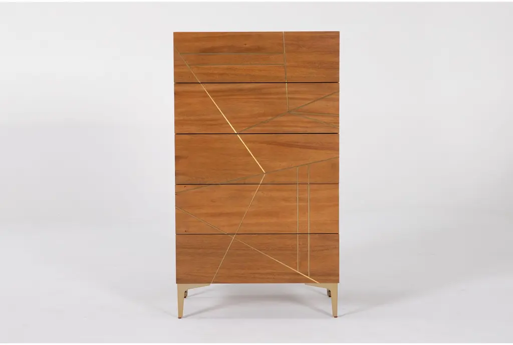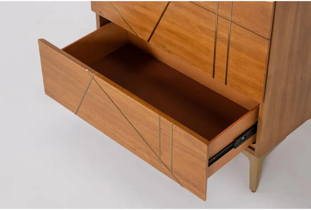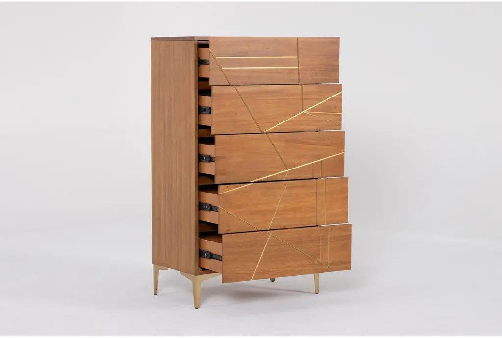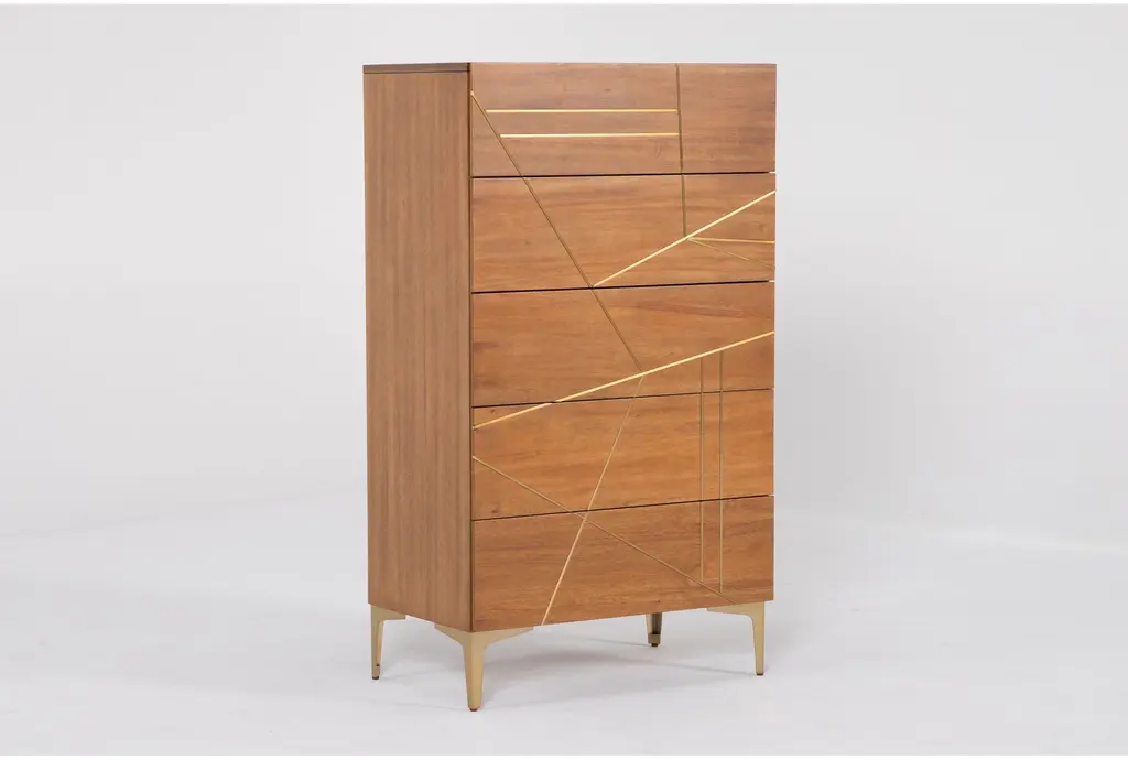 With gold metal inlays in an abstract geometric pattern, our Talbert chest of drawers brings graphic flair to your bedroom. The design also boasts distinctive gold metal legs, a solid poplar frame and sturdy drawers constructed to provide secure, stylish storage. Perfect for mixing and matching with other bedroom furniture, this piece allows you to create a truly custom retreat. You will love having this chest of drawers in your bedroom.