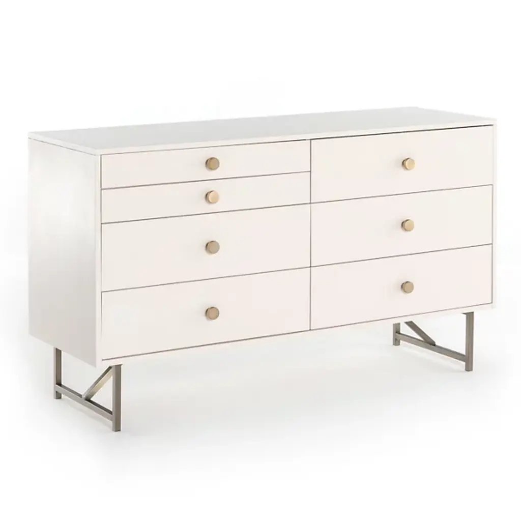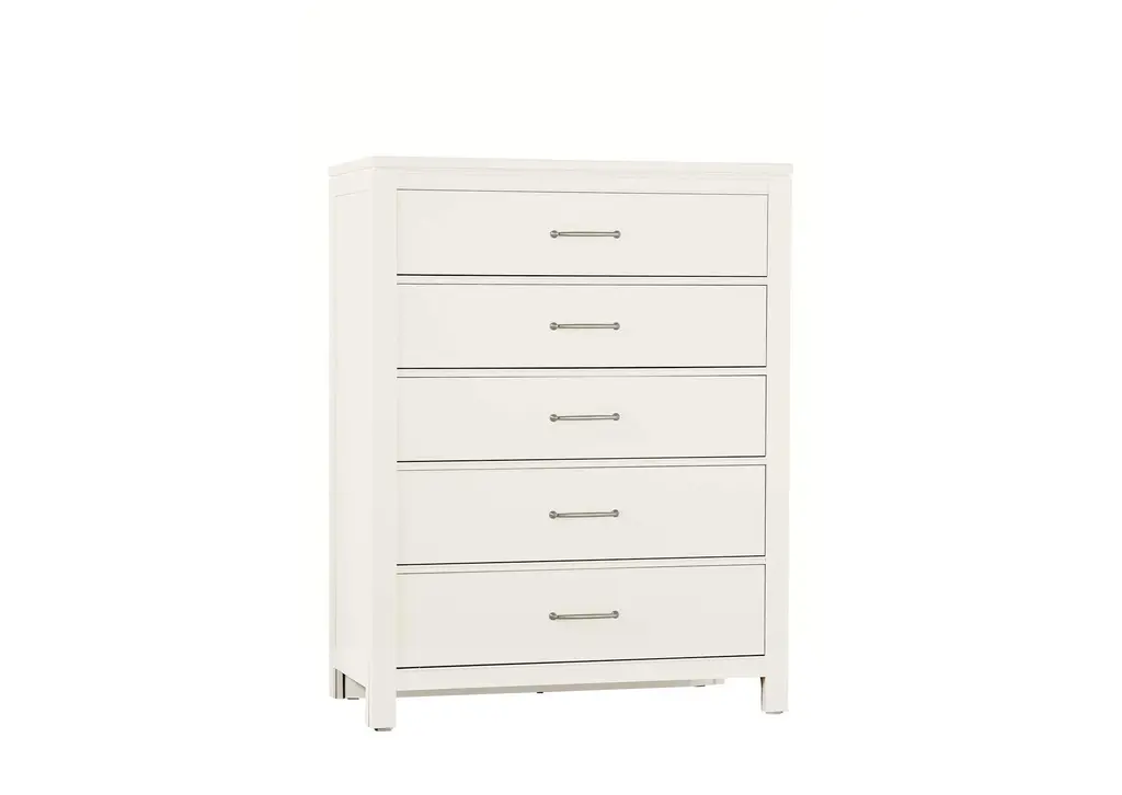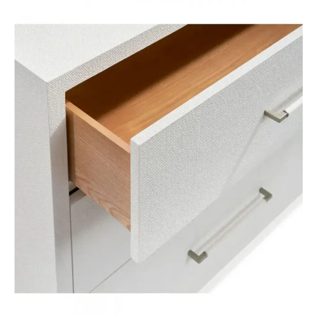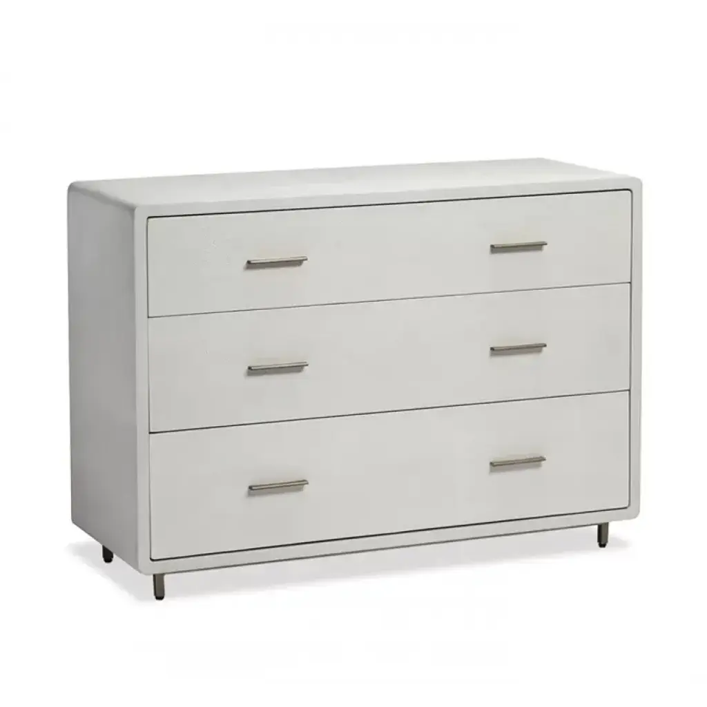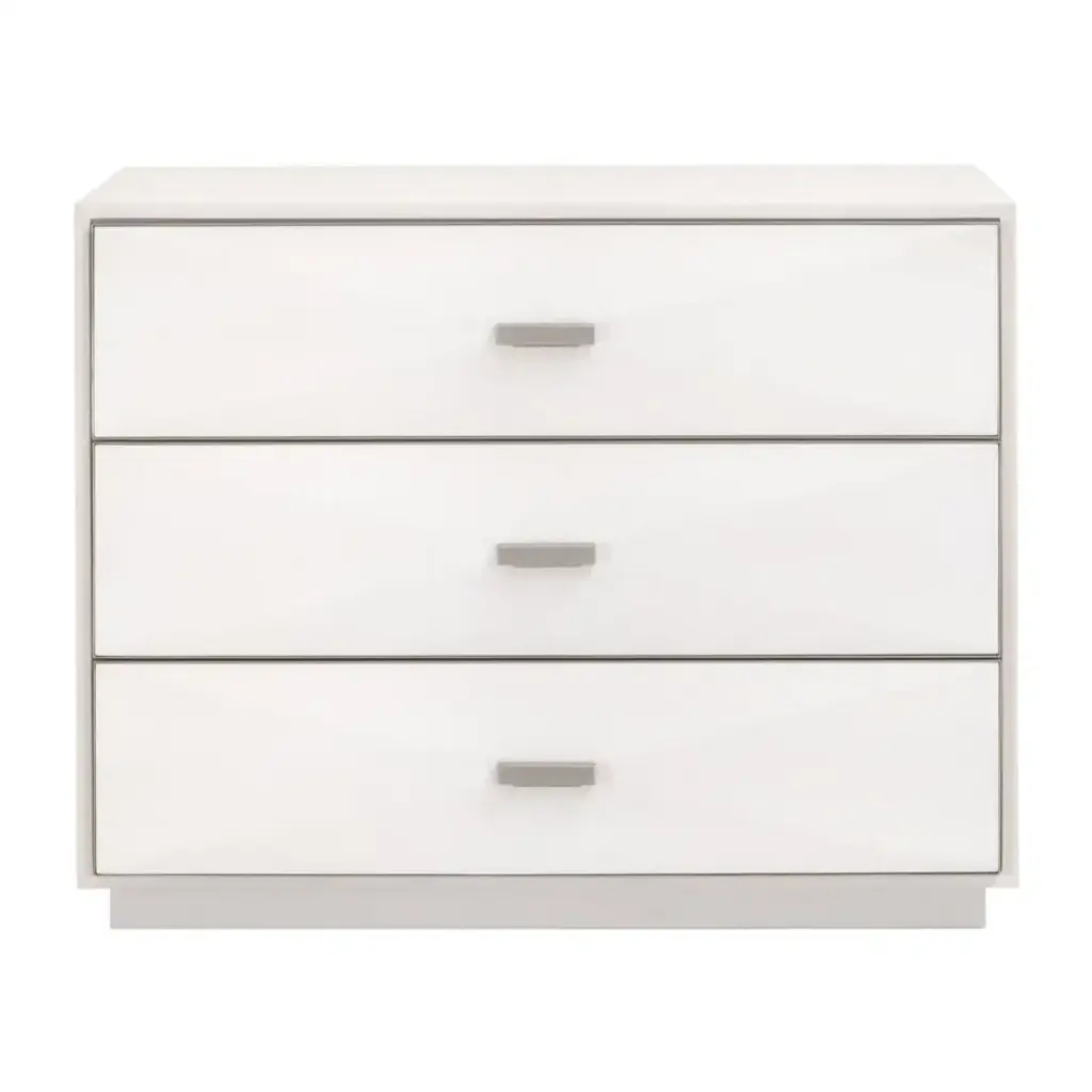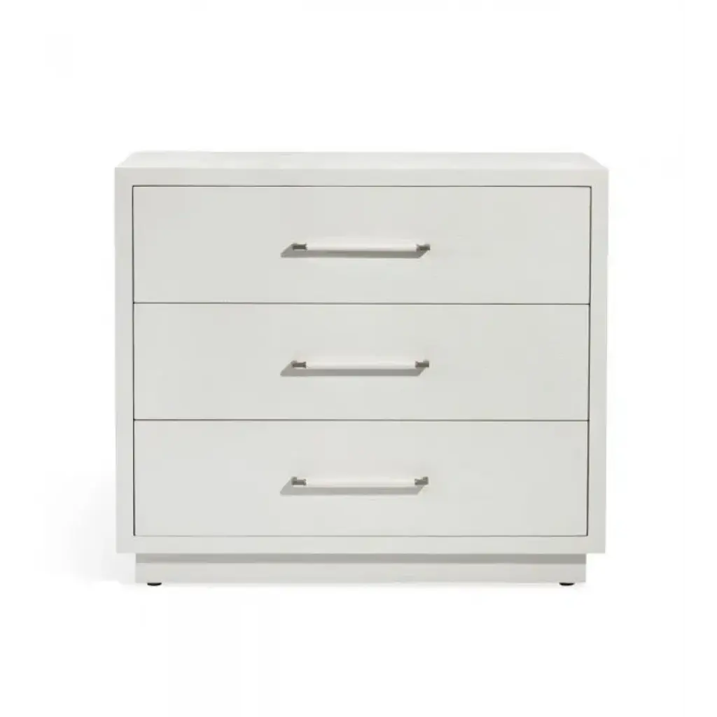 The clean lines of the Taylor 3 Drawer Chest are transformed into a statement piece thanks to a surface of white faux linen and metal pulls in champagne silver.
