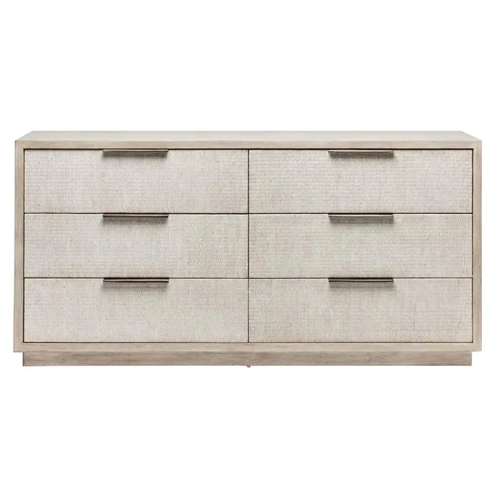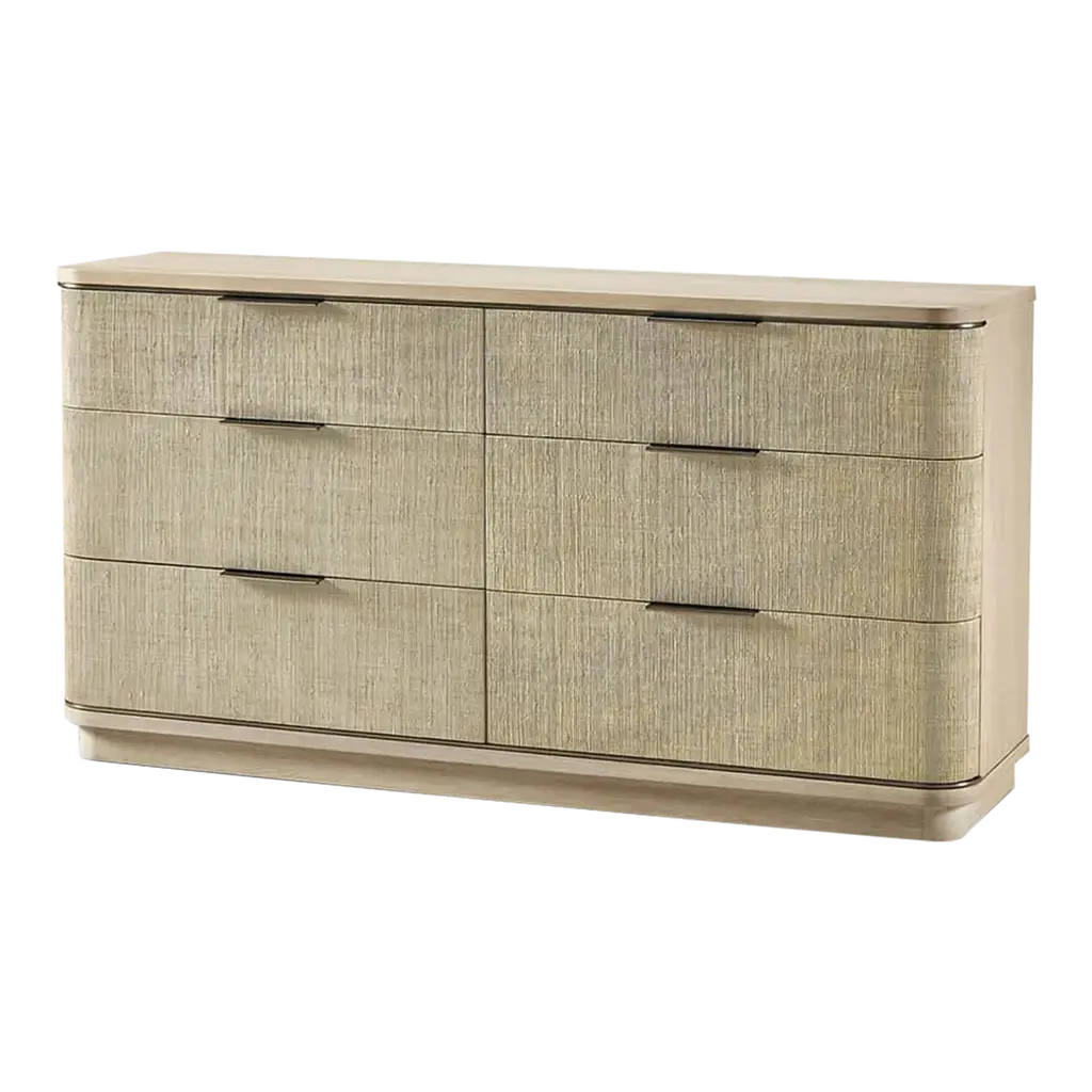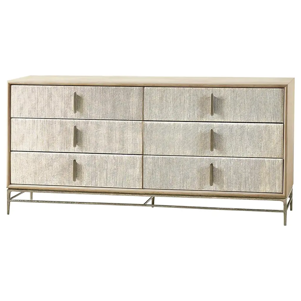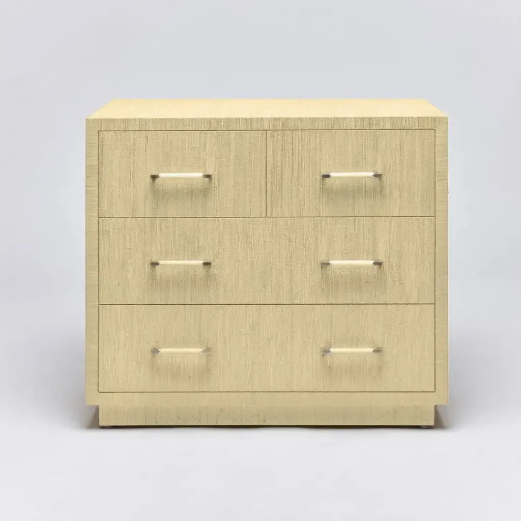 The clean lines of the Taylor 4 Drawer Chest are transformed into an organic statement piece thanks to a natural sisal texture and iron pulls in champagne silver. Sisal is made from hand-woven strands of natural fibers on a rice paper backing. The texture and coloration of all natural fibers will vary and will patina with time and use. Each piece will have its own charm, character and coloration and should be celebrated for its uniqueness.