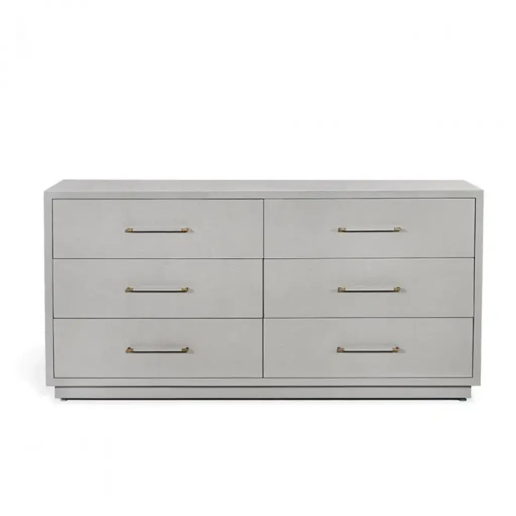 The clean lines of the Taylor 6-Drawer Chest are transformed into a statement piece thanks to a surface of light grey faux linen and metal pulls in an antique brass finish.