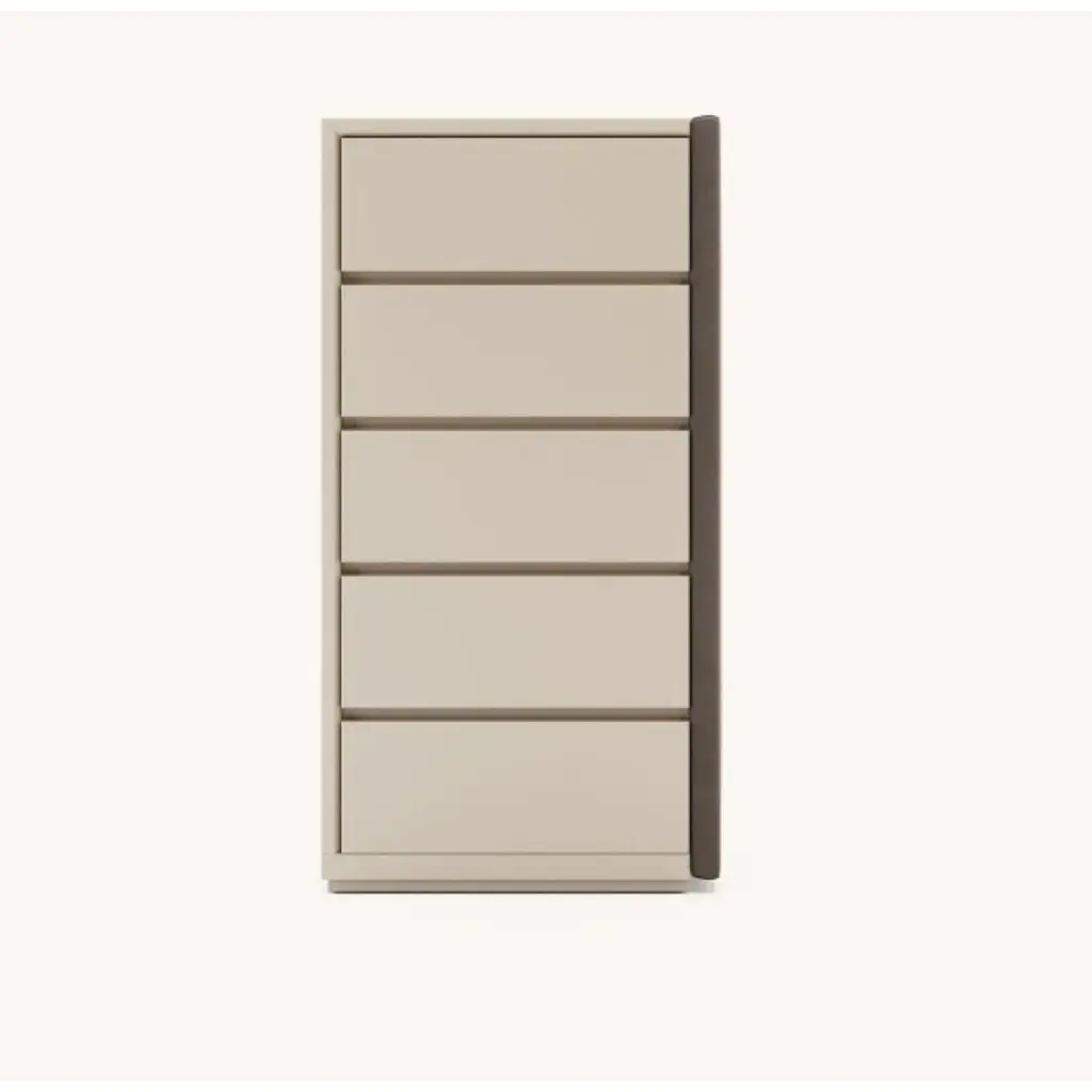 Taylor dresser with 5 drawers by DomkapaDimensions: W 61 x D 60 x H 120 cm.Materials: Moka lacquered matte, microfiber (Tarn 05).Also available in different materials.Taylor is a set of three-bedroom furniture pieces for cozy decor. Composed of a nightstand, a tall dresser, and a chest of drawers, the structure is mainly made in wood but the highlight goes to one side. This side is upholstered in a fabric of your choosing upgrading the final result to a combination of great taste and exquisite materials.Like all Domkapa’s designs, Taylor bedroom can be customizable as well as be sold separately.Domkapa holds a tremendous passion for detailed stitching, presenting several similarities to the haute-couture philosophy focused on the value of a “made by hand”. Based in Portugal, Domkapa was founded in 2009 as a Private Label. The long and fruitful path, full of experience and achievements inspired the brand’s new identity and independence, in 2017.Domkapa challenges its team to create the perfect daily meeting between design and comfort in each piece of the brand’s collections. Our design team works side by side with the production, and this organic synergy allows the creation of innovative designs.