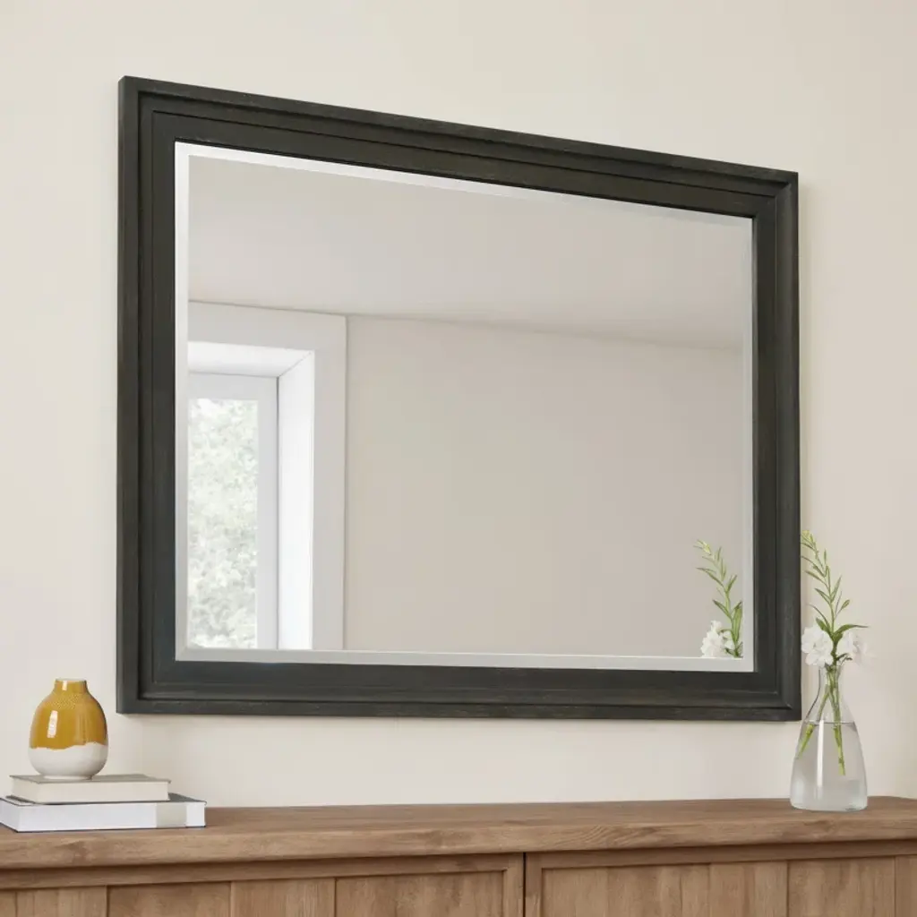 Elevate a dresser into a vanity set up in your contemporary bedroom with the transitional style of the Temani Mirror. Sleek and minimal, the gray finish frame outlines the silhouette and offers an understated touch. The rubberwood frame also rests elegantly on top of a dresser top for a combined bedroom furniture piece. A minimal knock assembly makes it easy to put together.