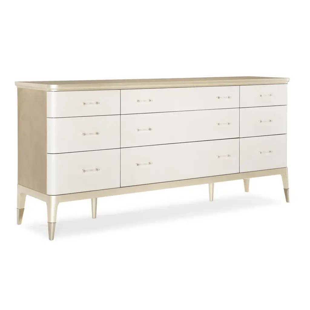 Dramatically defined by a top box wrapped in an Alabaster-painted faux shagreen, the Tempo dresser celebrates the art of adornment in contemporary form. A creamy Cappuccino finish highlights the linear grains of Coffee Platano veneers, accentuated by decorative backplates in a Whisper of Gold and custom hardware with a ceramic inset. Outwardly curving legs capped in metal ferrules emulate the soft flowing swag along the top and base railing.