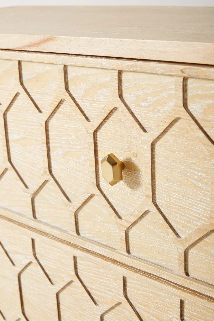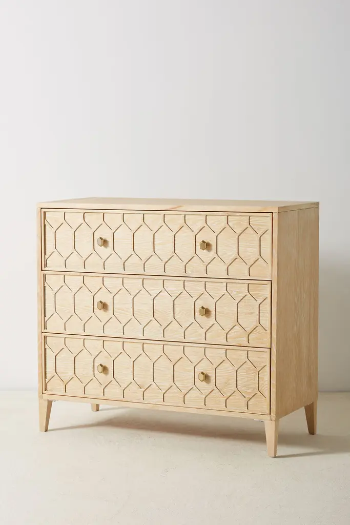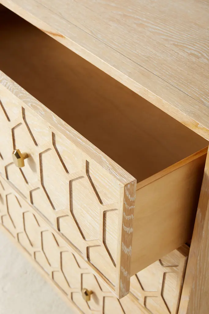 Like the garden trellises that inspired its design, our Textured Trellis collection invites a fresh perspective into your home. Complete with a raised motif on its ash wood facade, as well as faceted brass pulls, the timelessness of this dresser is found in both its details and stately silhouette. For ordering assistance and more, please contact us. For aesthetic advice and tips to help decorate your space, enjoy our complimentary home styling services.