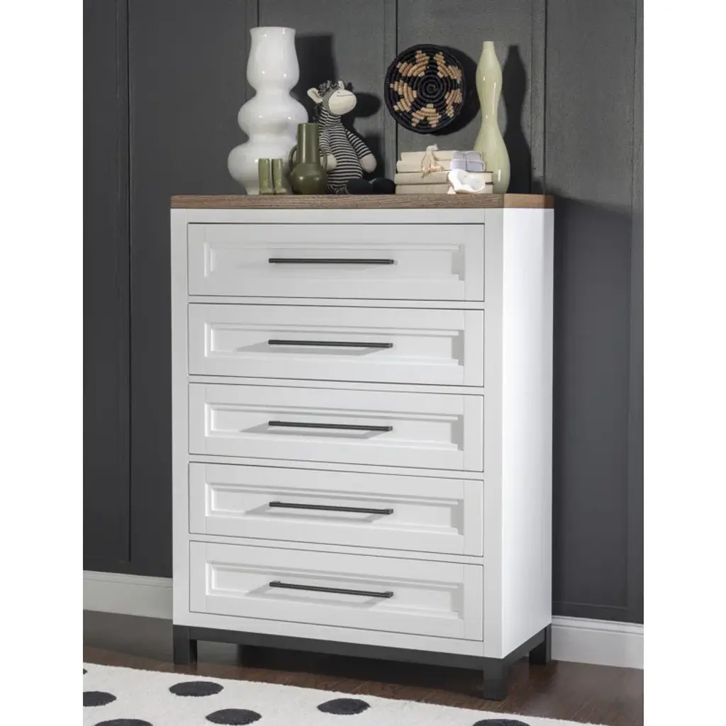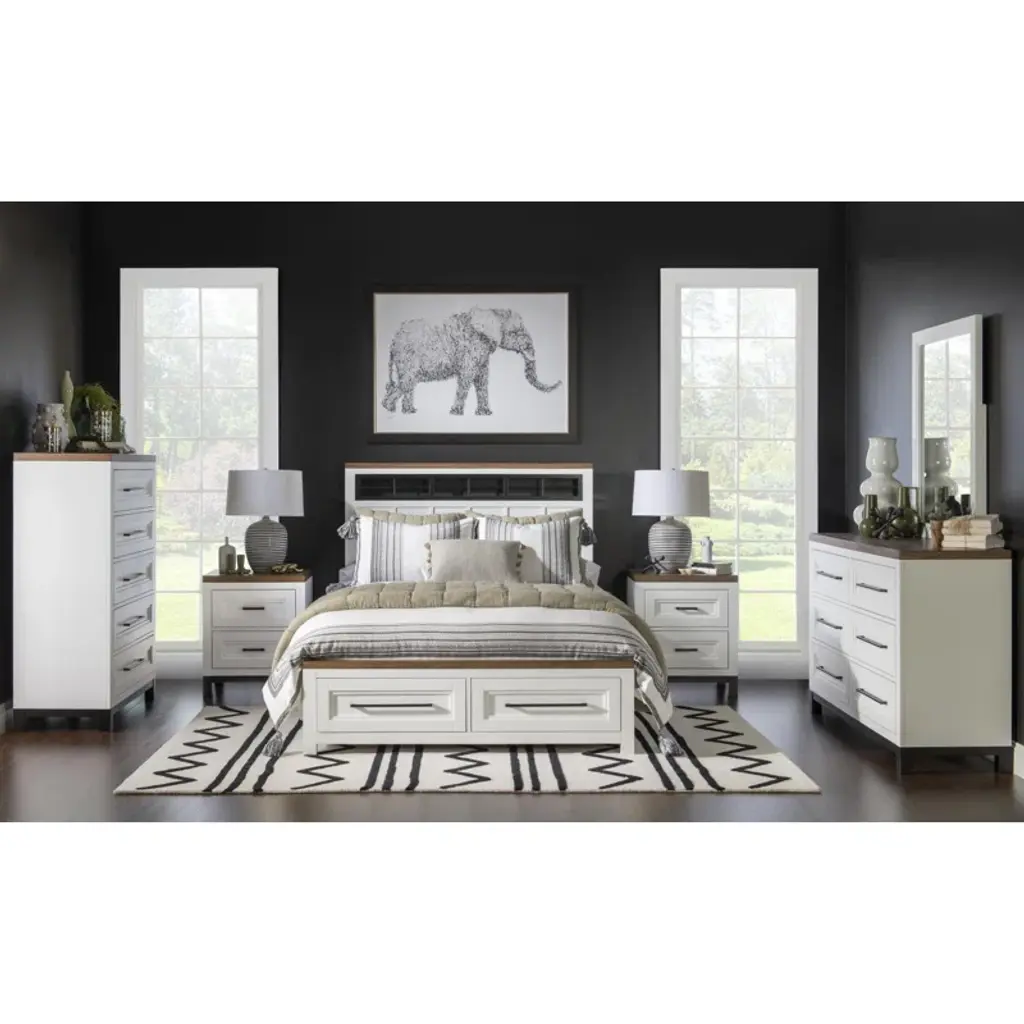 Crisp, bold design and a painted white finish create a modern farmhouse appeal in the Ashna Youth Bedroom by Legacy Classic - Youth. Crafted of Hardwood with Flat-Cut White Oak Veneer tops and Birch Veneer bases, the collection contrasts a painted white finish on the cases with Toasted Oak tops. Black accents include raised leg bases, simple bar-pull hardware, and a black metal windowpane detail in the headboard. Featuring English Dovetail fronts and backs and ball-bearing metal drawer guides mounted to the drawer sides, the collection offers a storage footboard option for extra storage space. With an updated sophisticated look, this collection is suitable for tweens, teens, young adults and for second bedrooms.