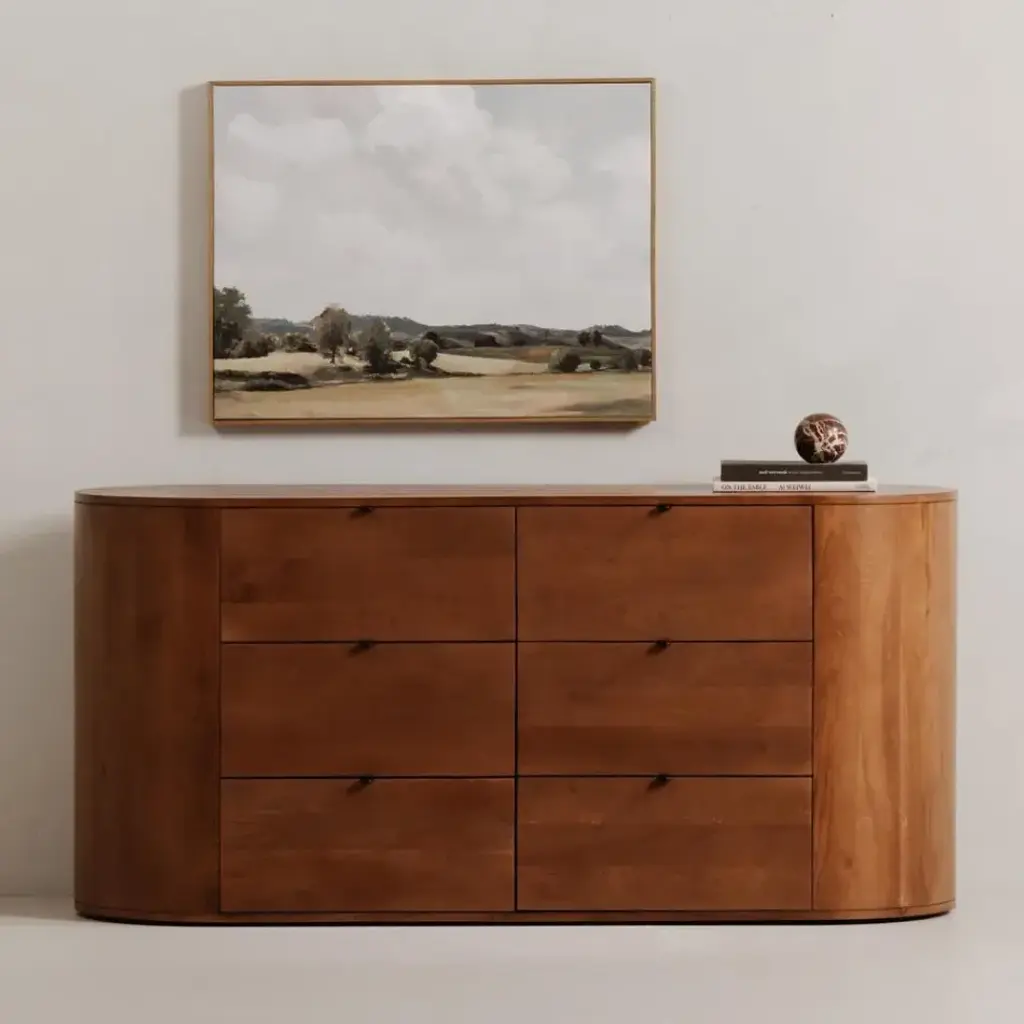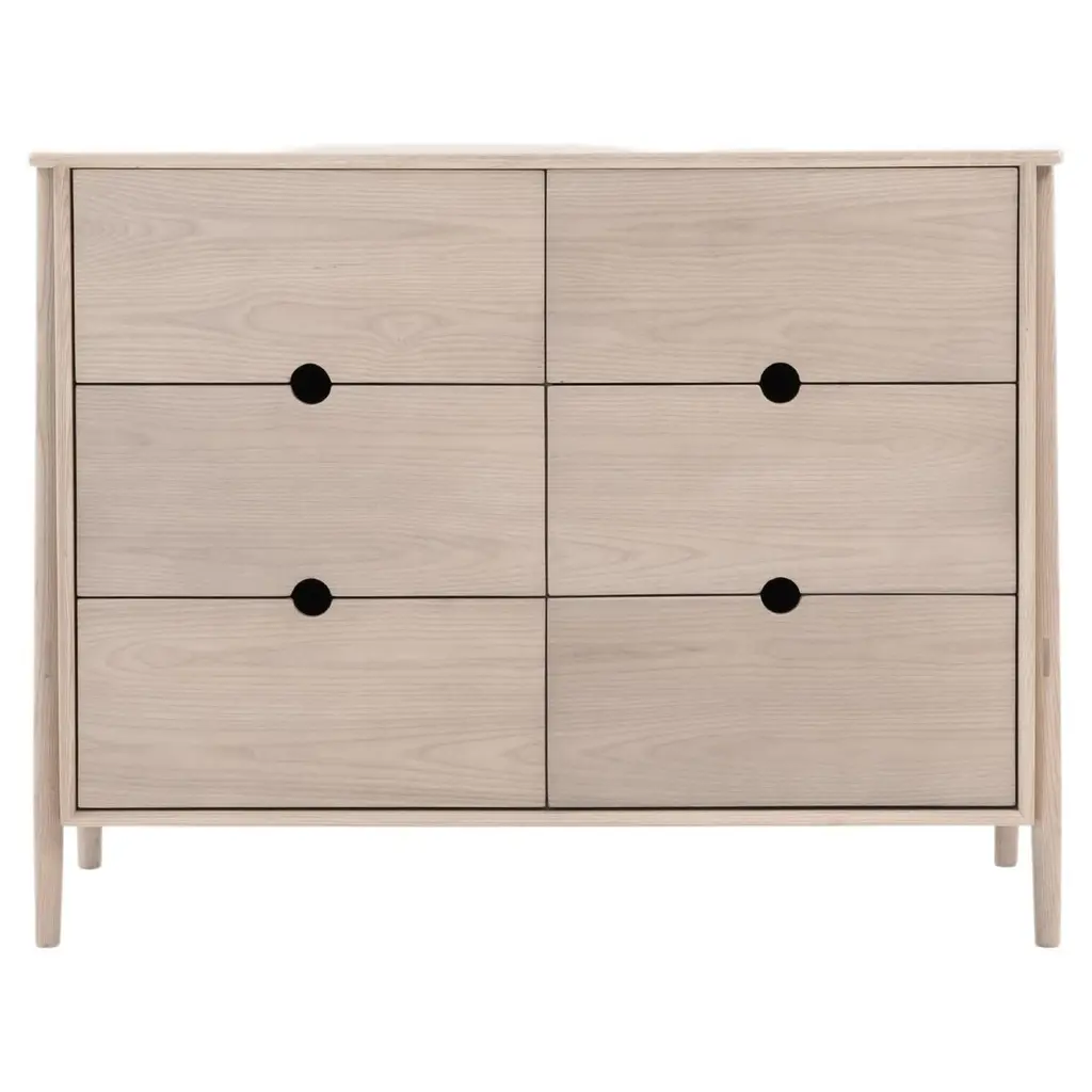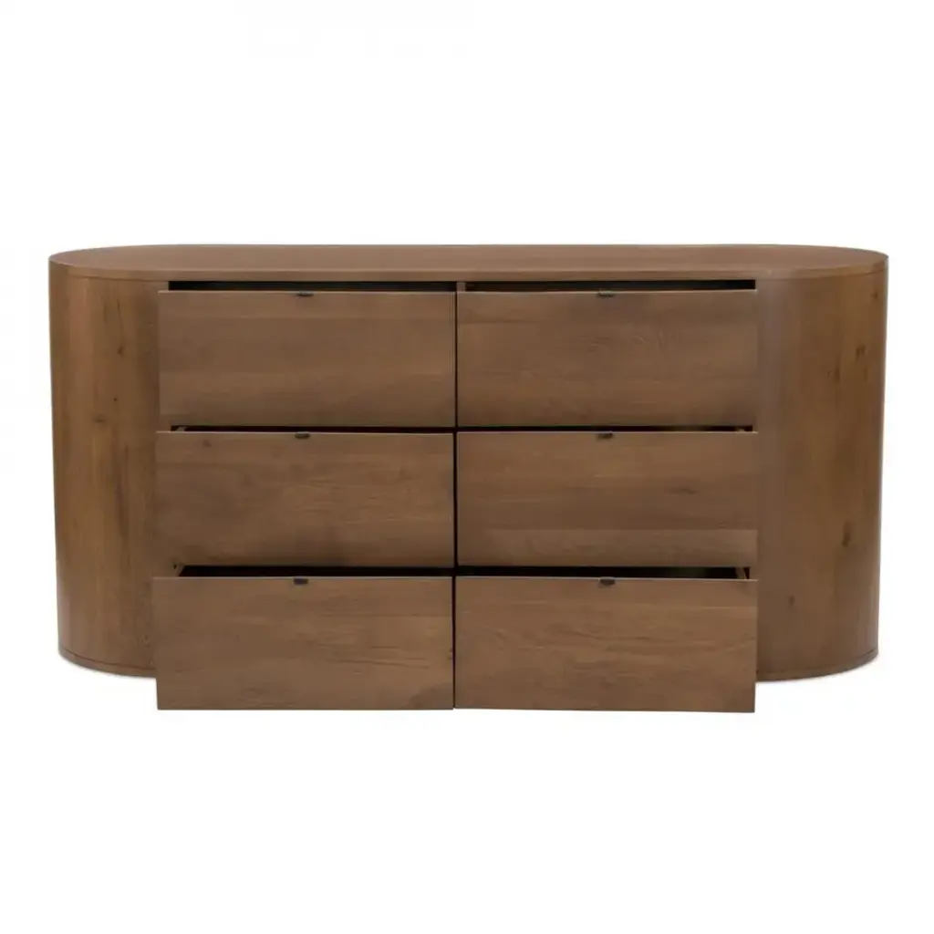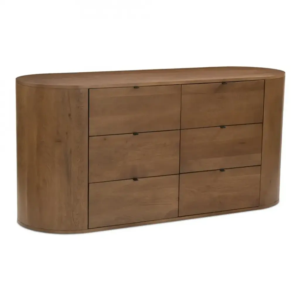 Full of natural appeal in solid oak, the Theo 6 drawer dresser features a curved, minimalist design. Beautifully simple and functional, this dresser features 6 drawers with soft-close glides and drawer safety stop.