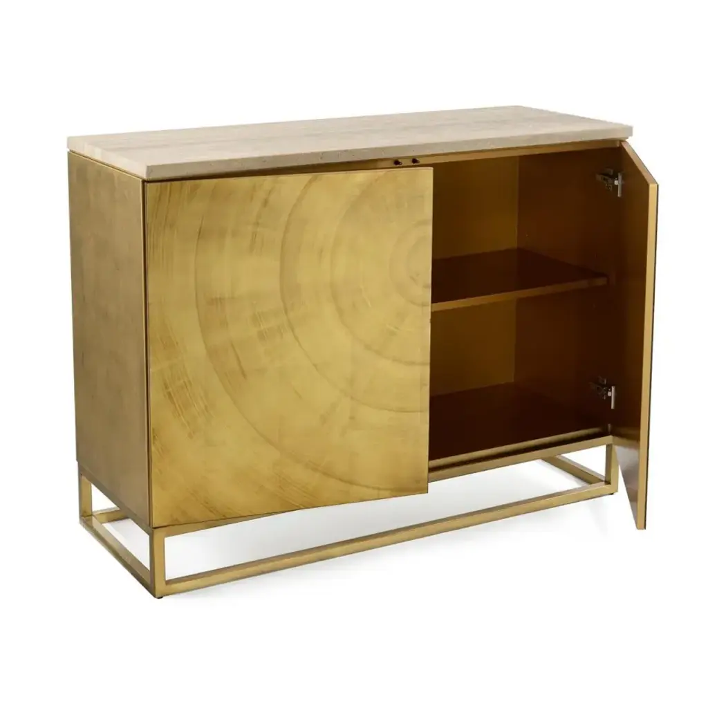 The two doors on this chest feature a radiating circular pattern hand-painted on glass in an antique brass finish. The case and metal base are in a gold coast finish, topped with a honed travertine marble top.
