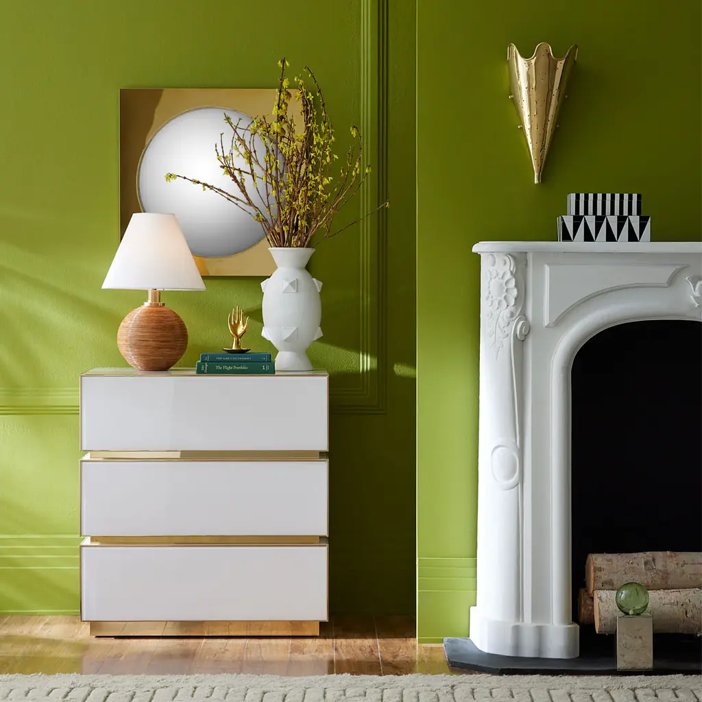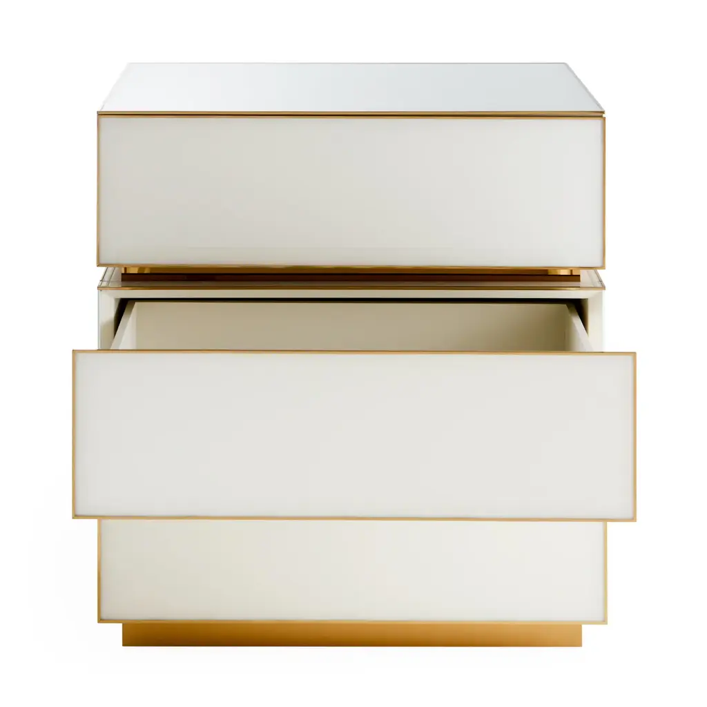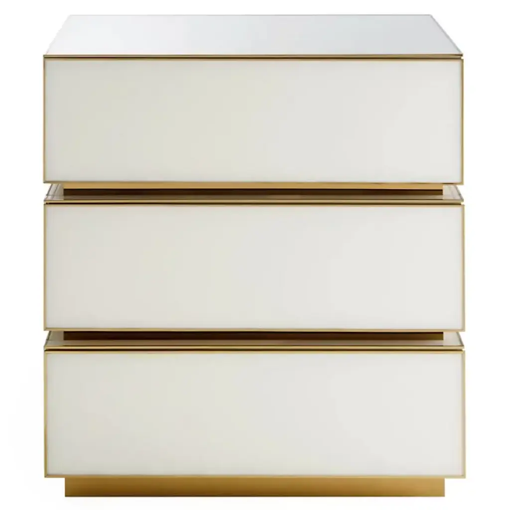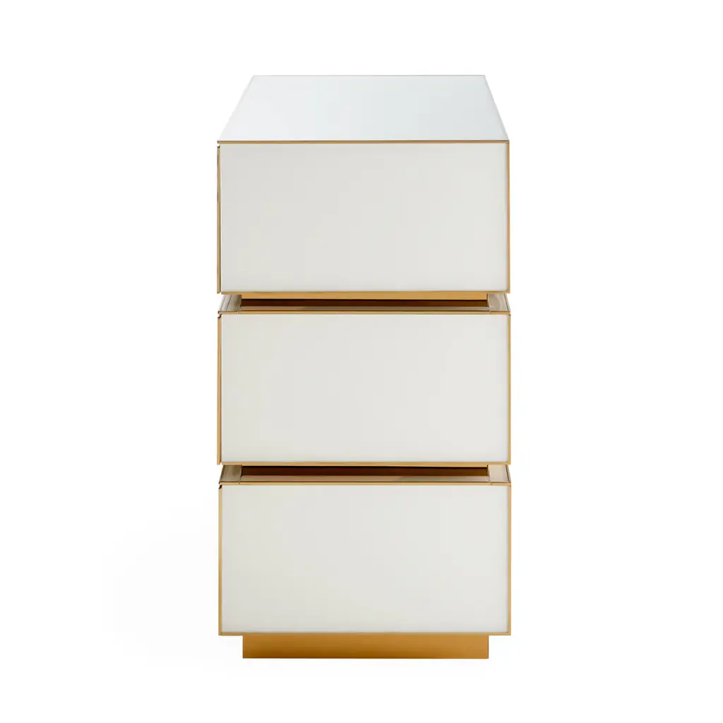 Future Classique . Pairing bright white with a warm golden glow, our Torino dresser delivers a classic mod-meets-glamour moment. Featuring three generous soft-close drawers crafted from white back painted glass with bold brass edges and stacked on a brass recessed base. A chic solid in an already-bold home or modern bling for a neutral abode. The perfect small-space console or partner for your sofa or chair.