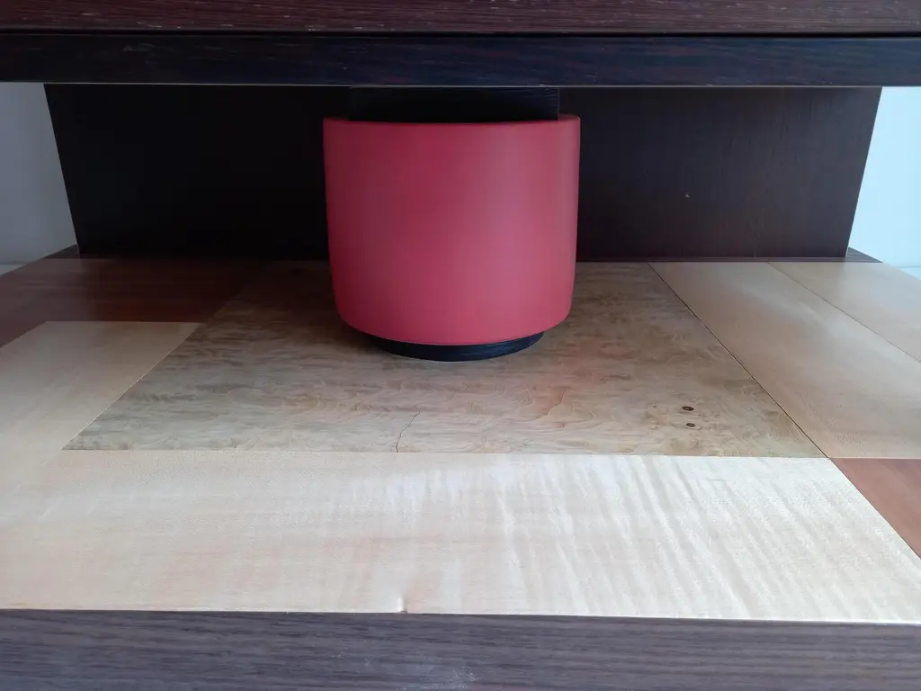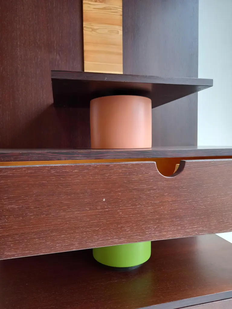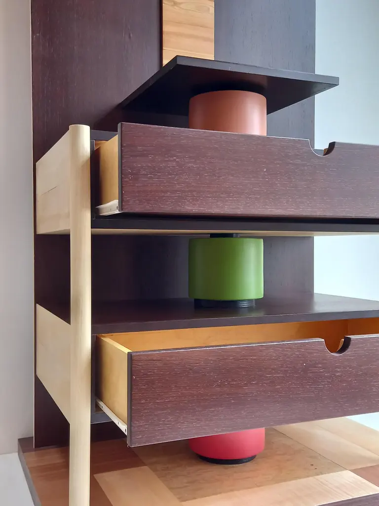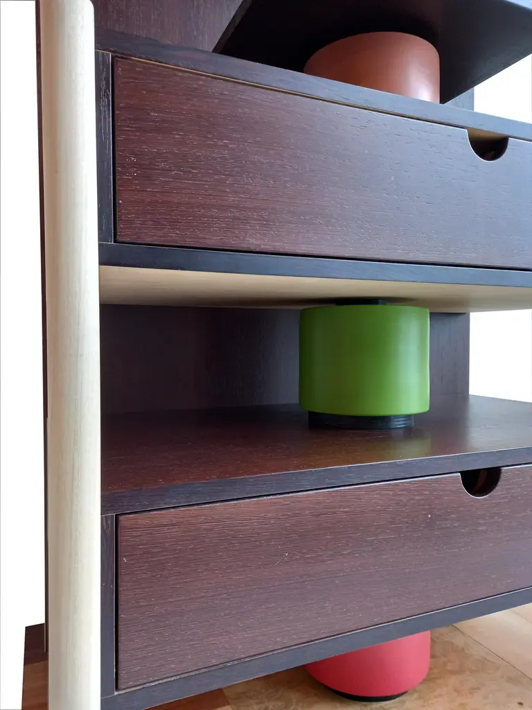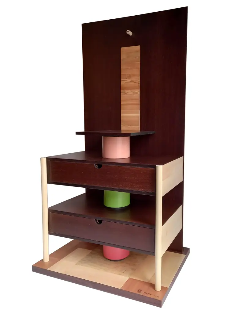 Totem by Pietro Meccani for Meccani Design Interesting totem chest of drawers designed by the author in 1989 and the prototype created in the same year. It is proposed again by the Meccani company; the piece of furniture is handmade in various wood essences with three colored terracotta elements. Dimensions (cm): 101 x 71 x h 195.5 Signed by Maker