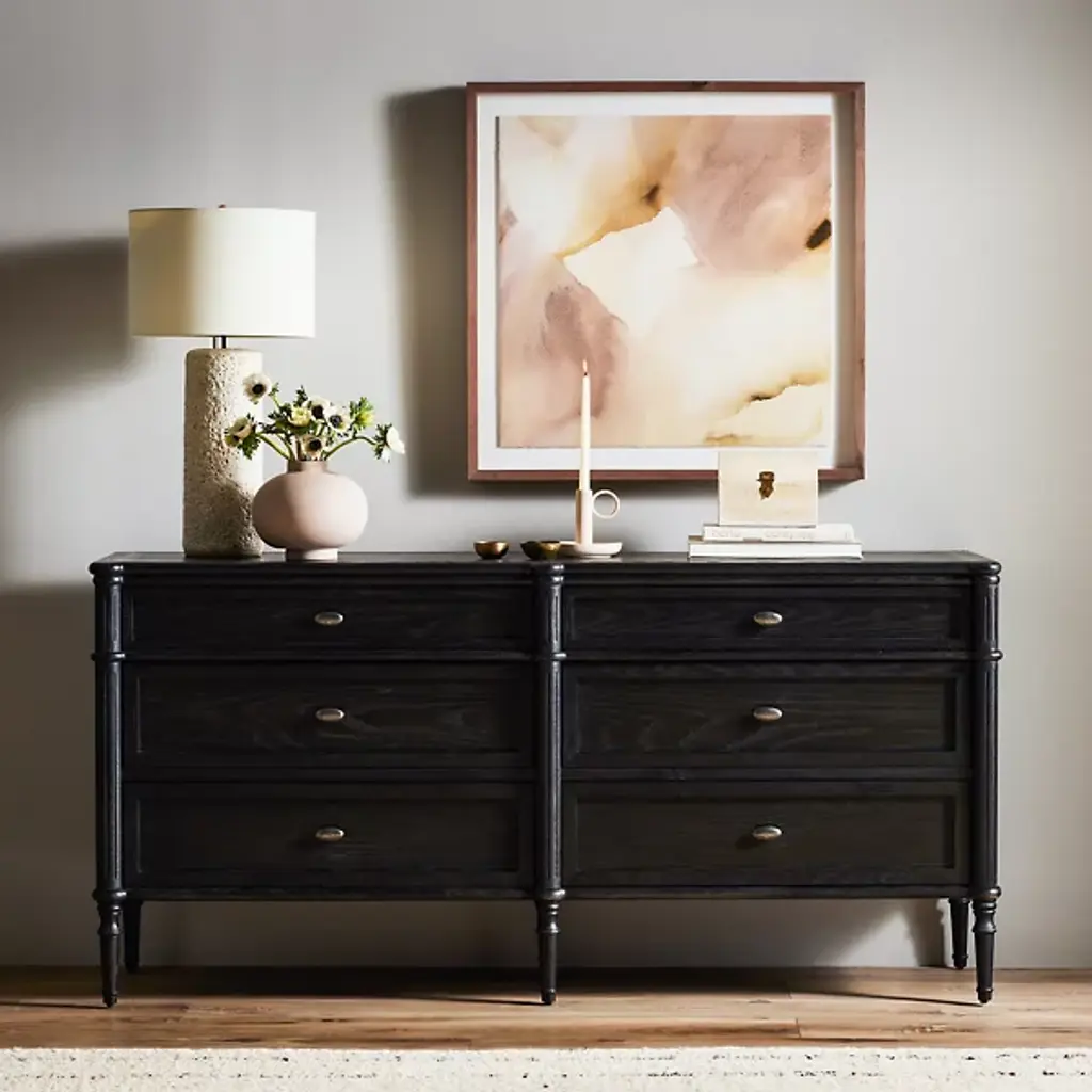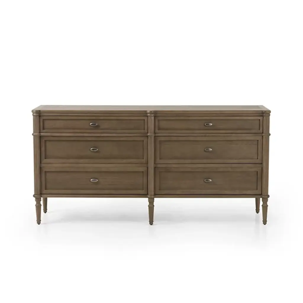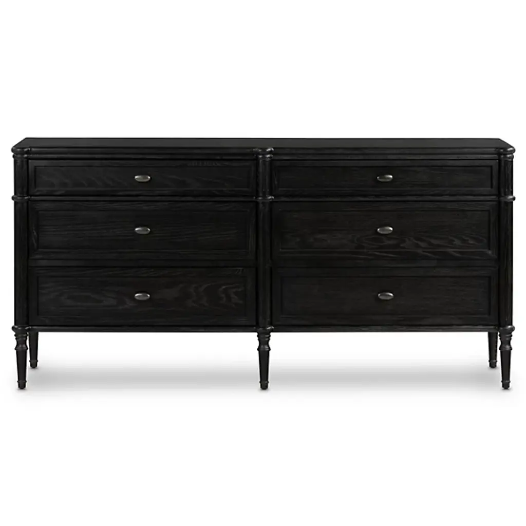 The Toulouse 6 Drawer Dresser from Four Hands enlivens living spaces with an intricate interplay of style and storage. An inspired display of dark veneer and solid wood rising from pointed legs juxtaposes rounded accents on corners and midpoints with the flat planes of the drawers and rectangular frames. A top layer of short drawers offers small accessory storage above two larger drawers, while rounded pulls set into the middle front of each drawer offer easy access.