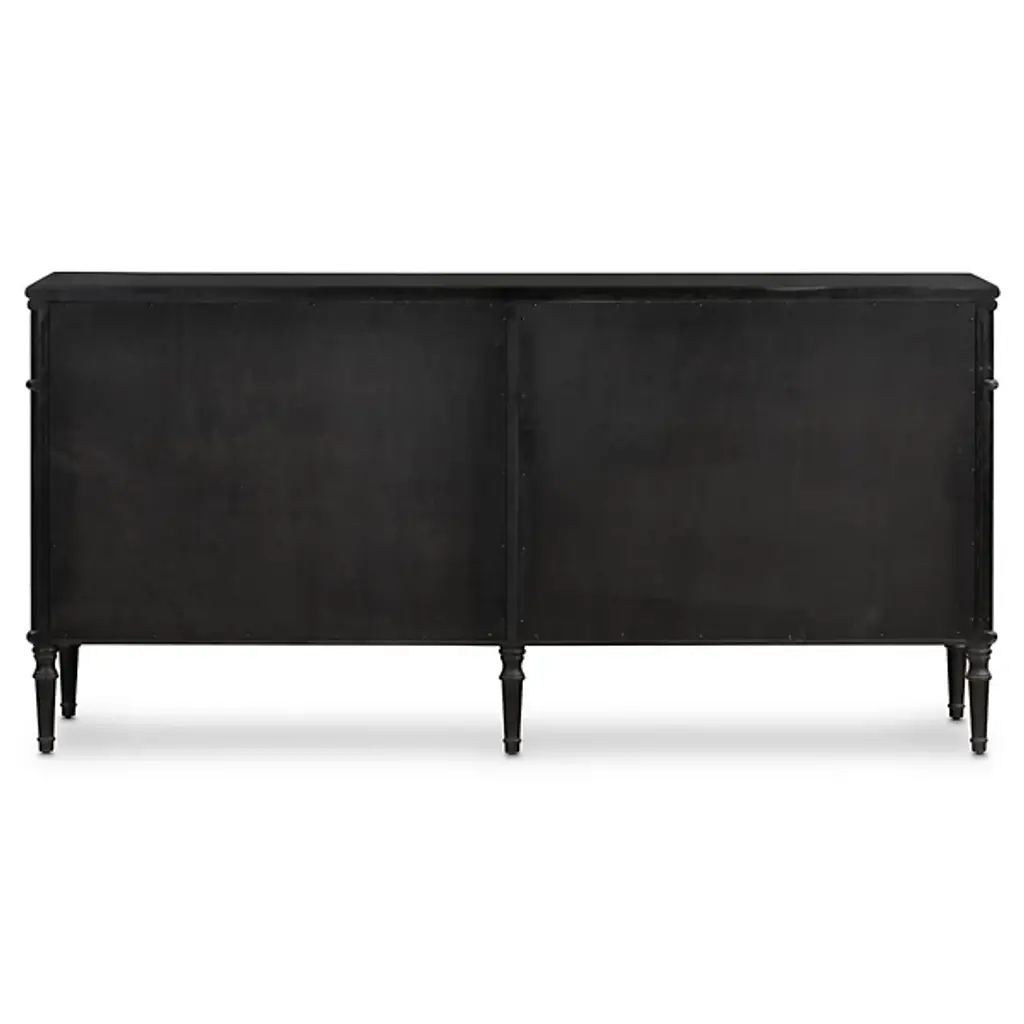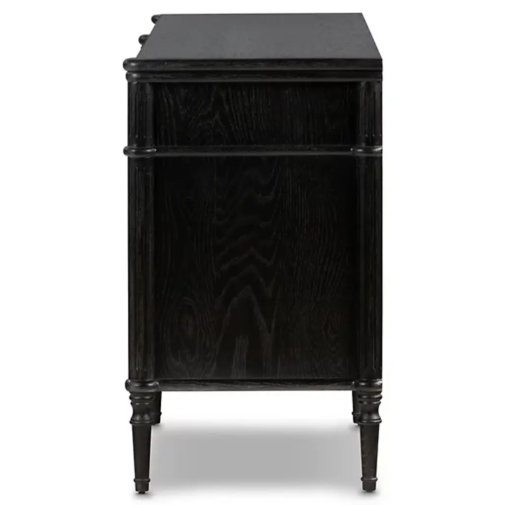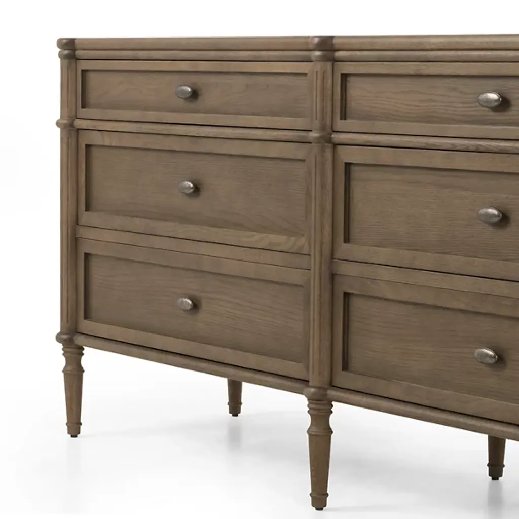 The Toulouse 6 Drawer Dresser from Four Hands enlivens living spaces with an intricate interplay of style and storage. An inspired display of dark veneer and solid wood rising from pointed legs juxtaposes rounded accents on corners and midpoints with the flat planes of the drawers and rectangular frames. A top layer of short drawers offers small accessory storage above two larger drawers, while rounded pulls set into the middle front of each drawer offer easy access.