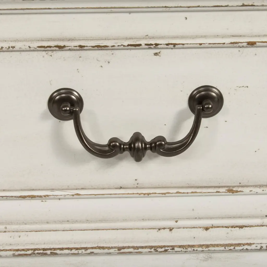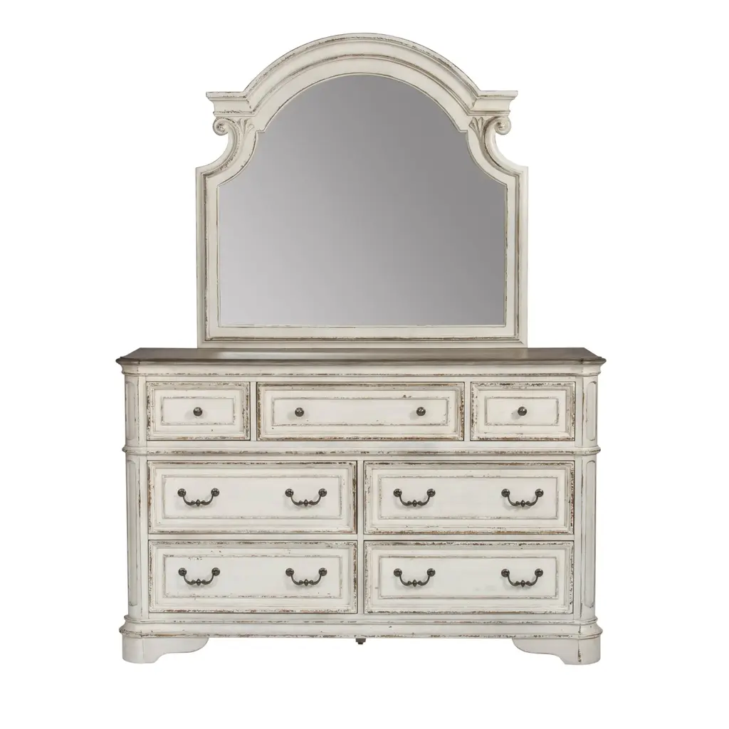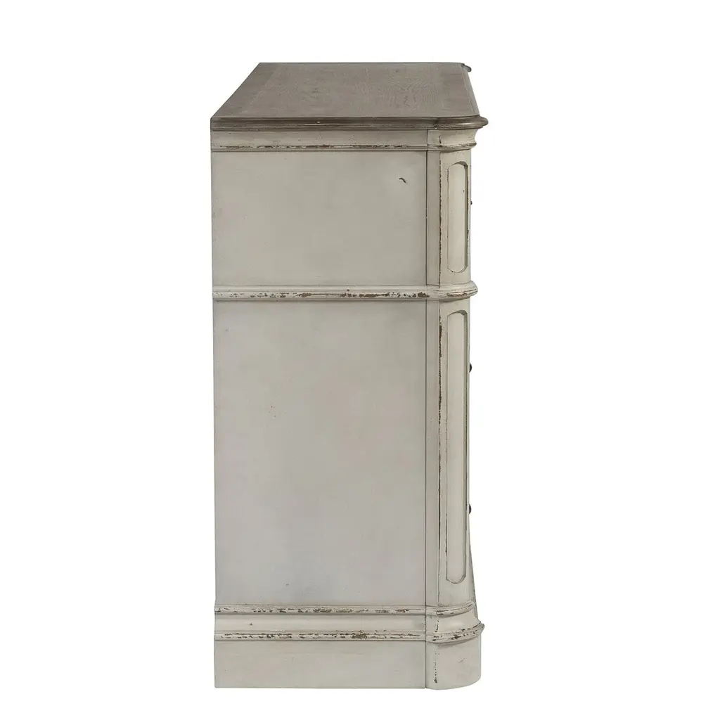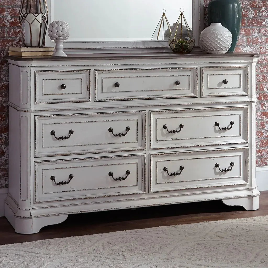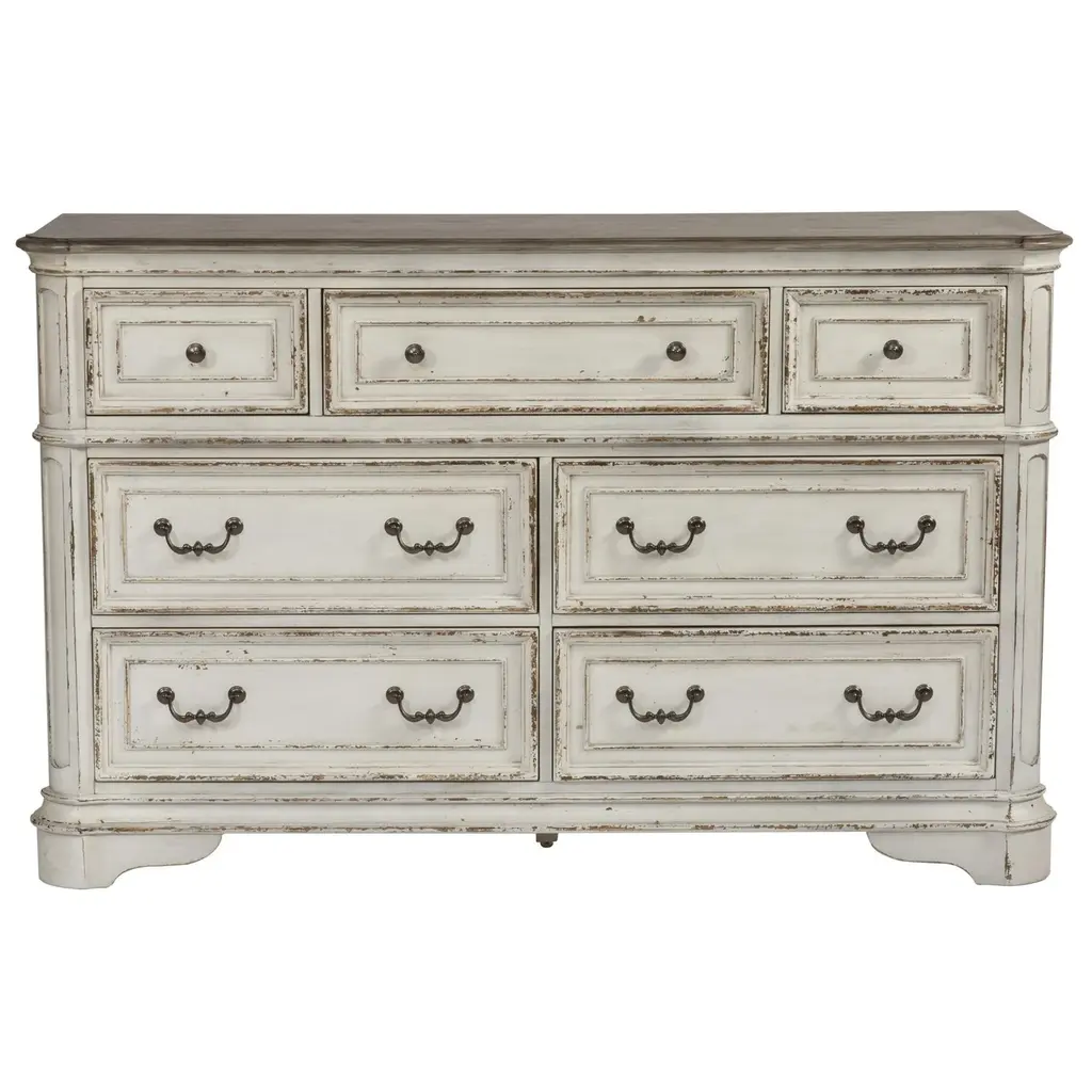 Accent your room with an effortless blend of European Traditional design with this 7-drawer dresser. Weathered brown whitewash top paired with the antique white finish creates a truly unique look. Storage abounds with 2 small drawers, 1 medium sized drawer, and 4 larger drawers, each equipped with bottom case dust proofing. Softness is added to the design with canted corners and rounded pilasters, accompanied by bead molding on each drawer front.